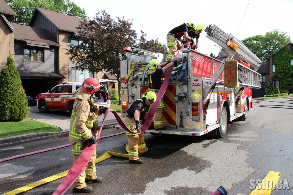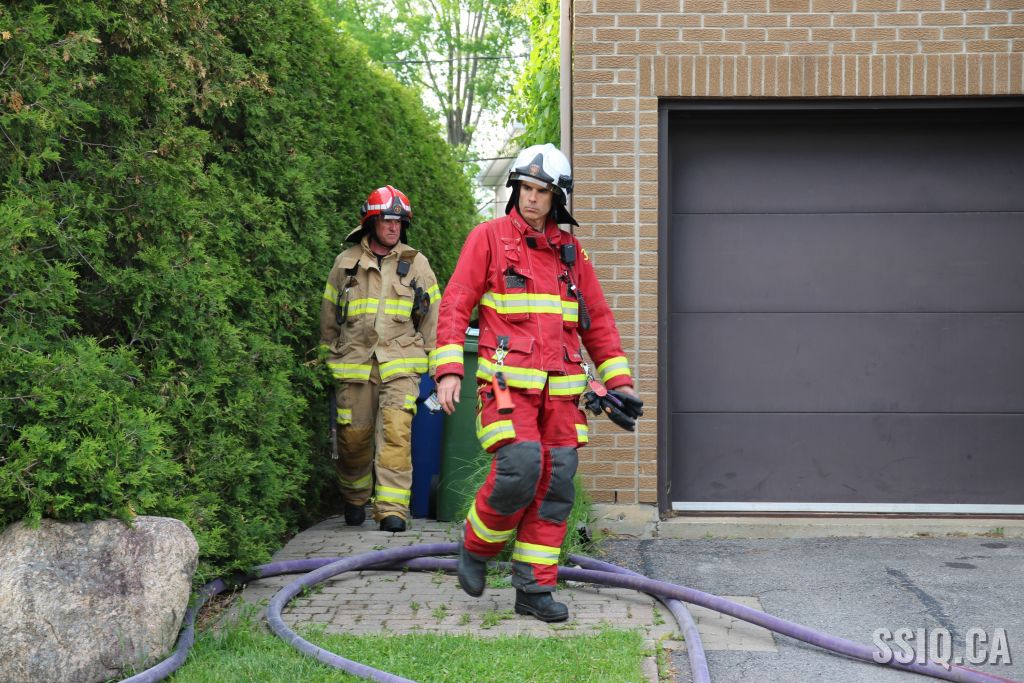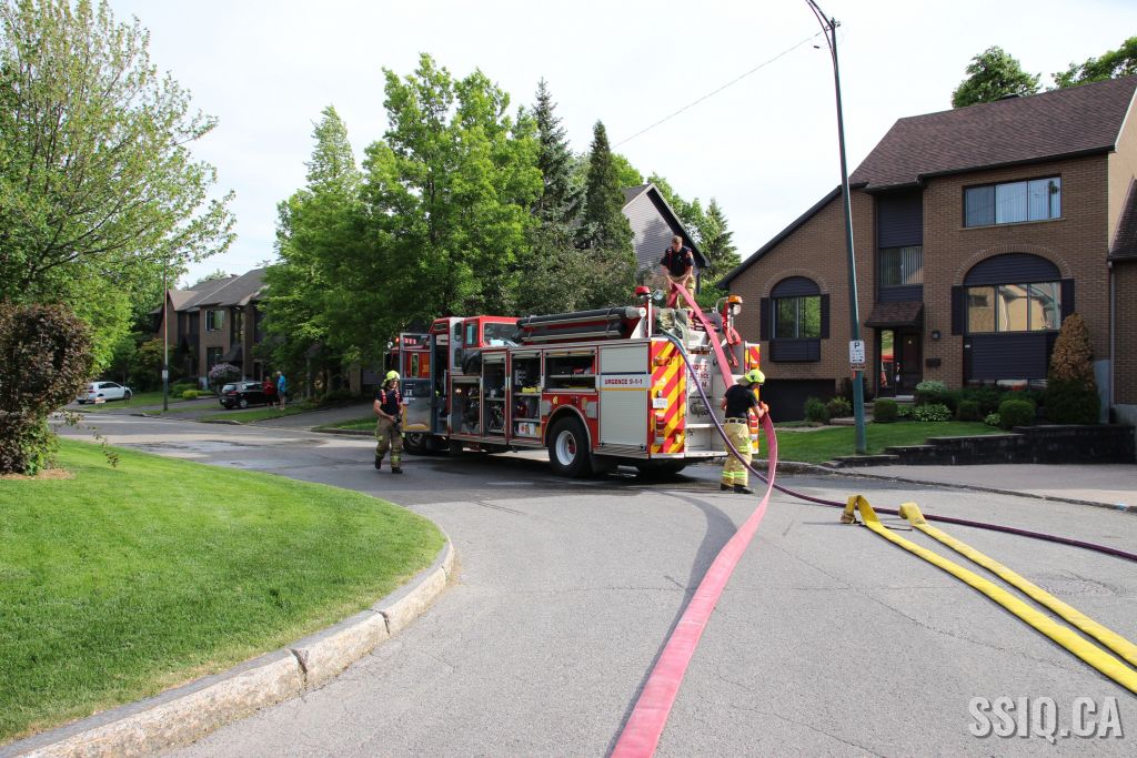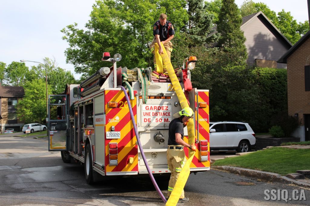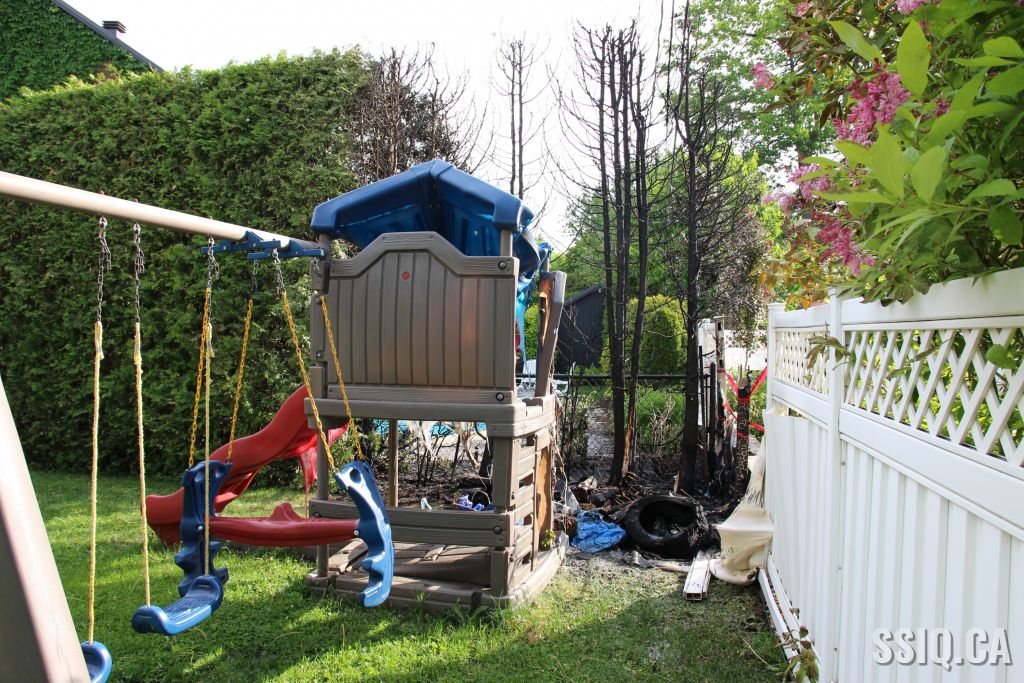 L'appel entre du résident en panique qui mentionne que le feu est pris dans des cèdres à l'arrière de la maison. Il ajoute que le feu se propage à une remise de jardin. Rapidement sur les lieux, l'officier du 215 demande le déploiement d'un jet pour éteindre le feu.