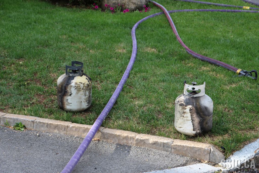 Quelques bouteilles de propane sont refroidies et le feu est rapidement contrôlé.Les dommages sont somme toute légers Le commissariat au incendies est demandé sur place pour enquête.