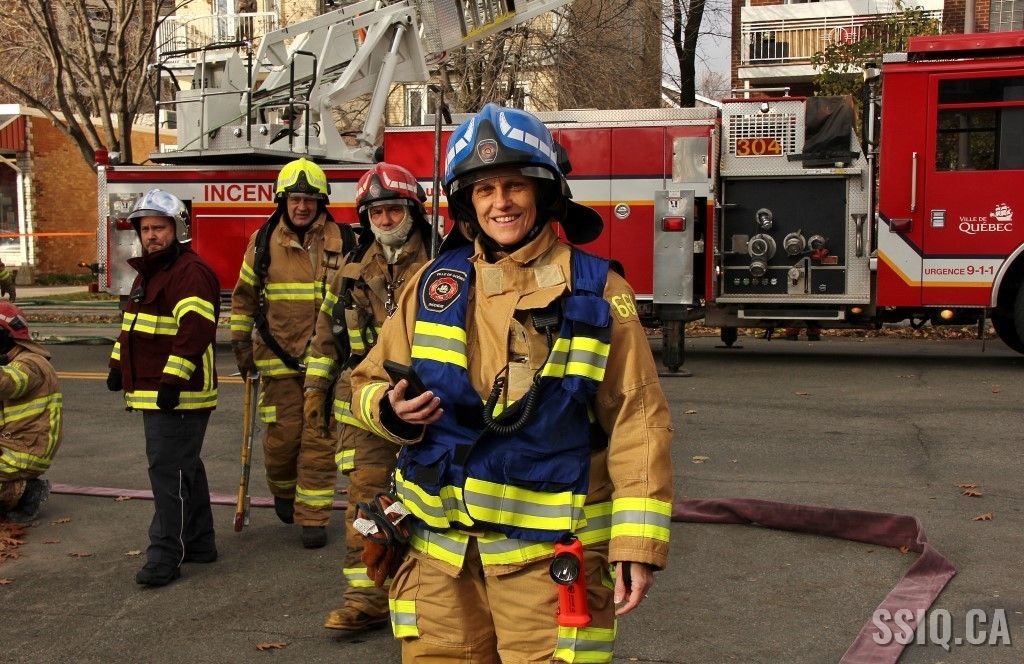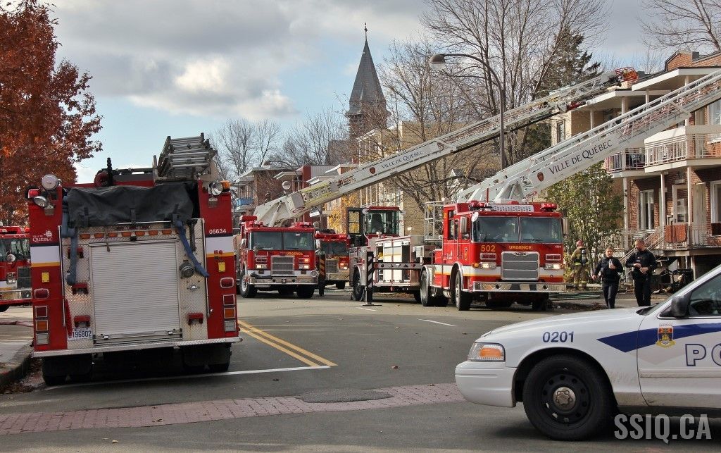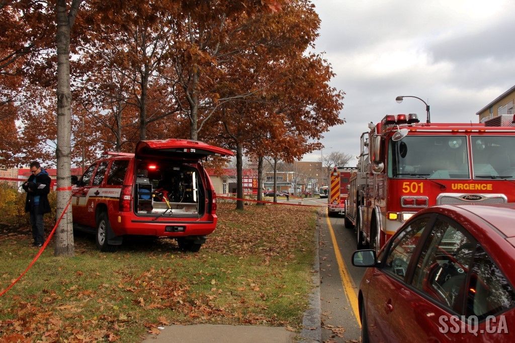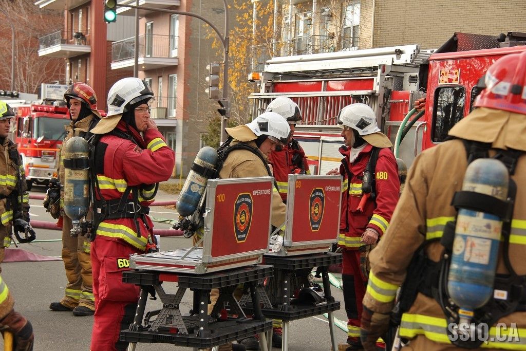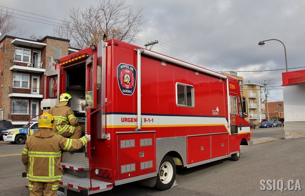 À peine quelques instants après avoir donné la première alarme, la répartitrice de la centrale 911 informe que les ambulanciers sont sur les lieux et qu'ils constatent une épaisse fumée noire et des flammes provenant du sous-sol de l'édifice.