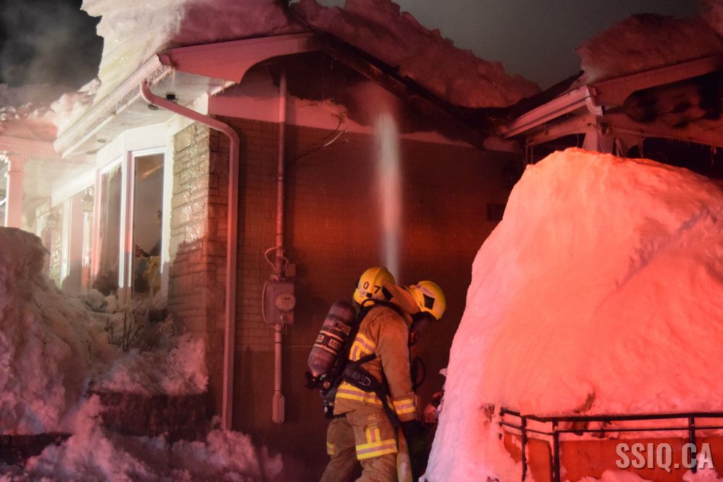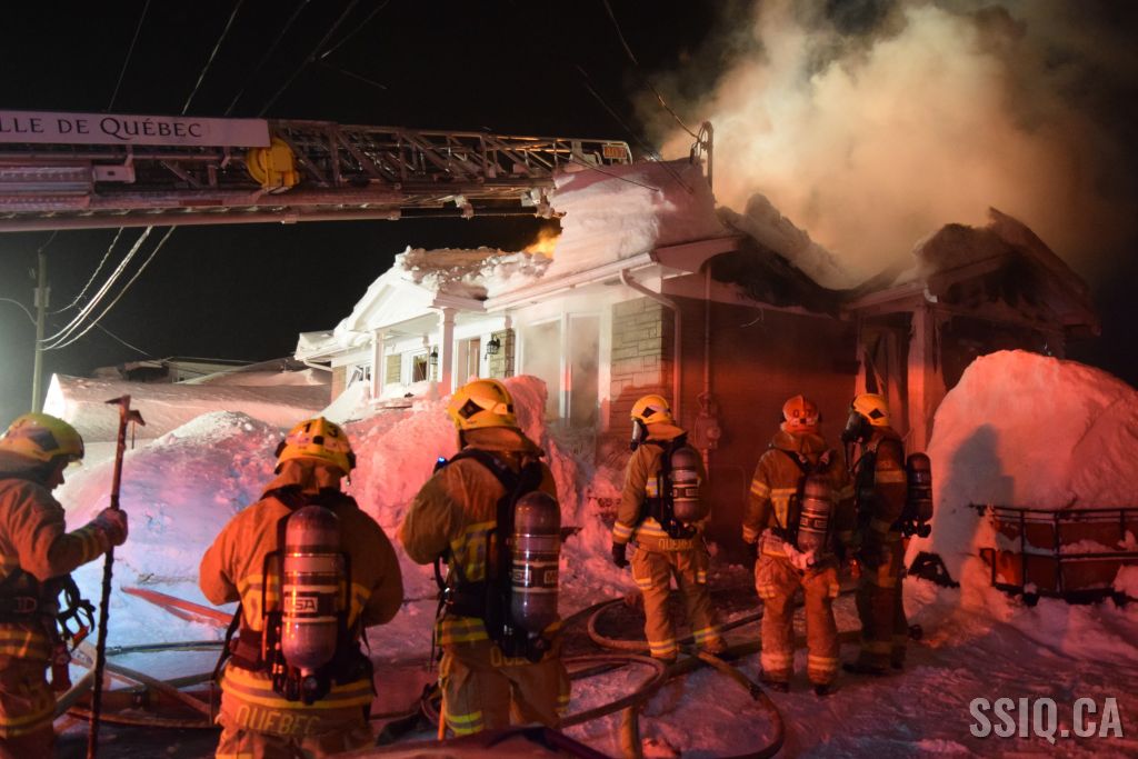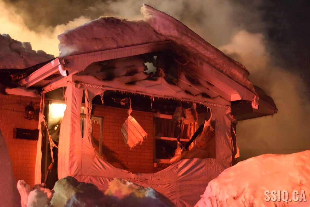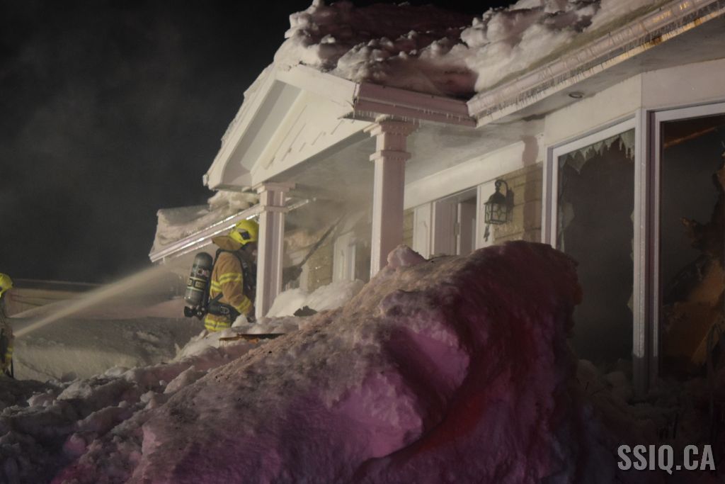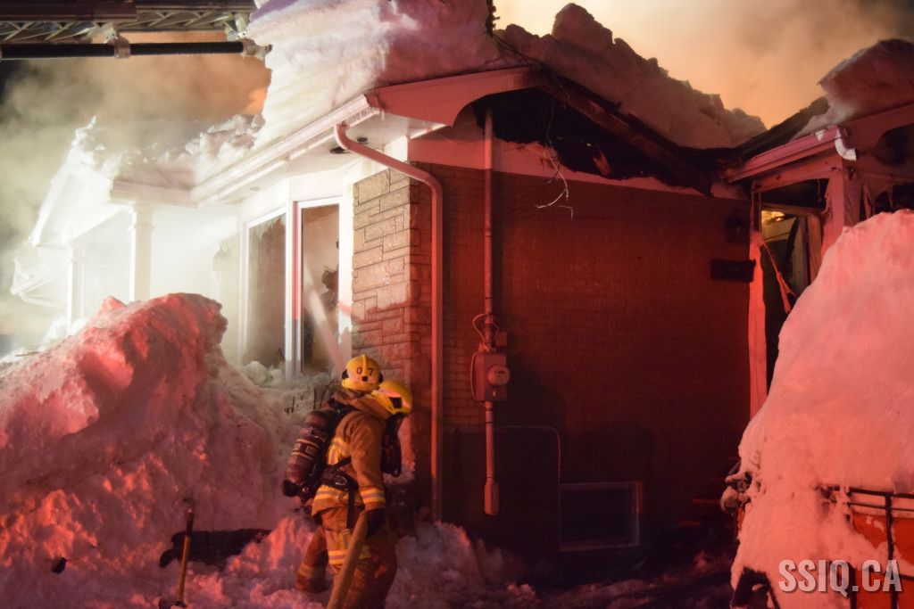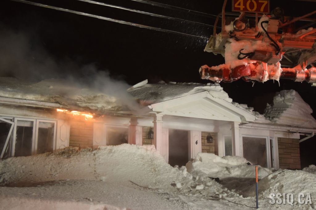 Très tôt vendredi matin une 1ère alarme est sonnée pour le 2 rue Doyon à Beauport. L'appel provient d'une voisine qui dit voir des flammes à l'intérieur et au toit d'une résidence, par contre elle n'est pas certaine de l'adresse. Sur les lieux, le 207 confirme le feu éclaté au toit et demande l'intervention nécessaire pour le 4 rue doyon. Les équipes se déploient pour effectuer la recherche primaire mais rapidement une parti de la résidence s'effondre, obligeant les pompiers à passer en mode défensif. la nacelle du 704 a été déployée avec le jet perforateur pour finaliser l'extinction. Un pompier a dû être transporté à l’hôpital. Heureusement aucune personne ne se trouvait dans la résidence au moment de l'incendie. Une quarantaine de pompiers ont été appelés sur les lieux.