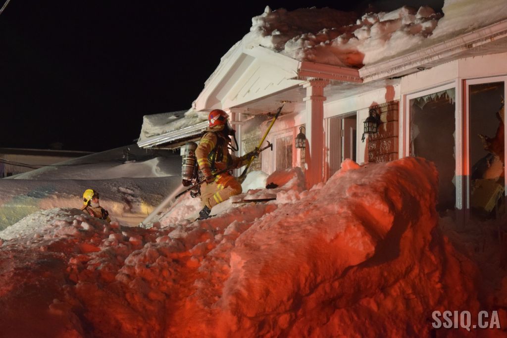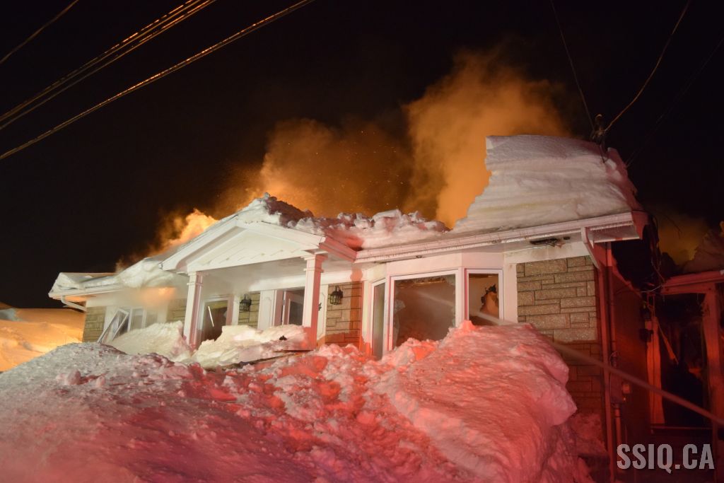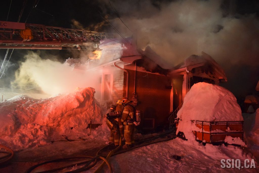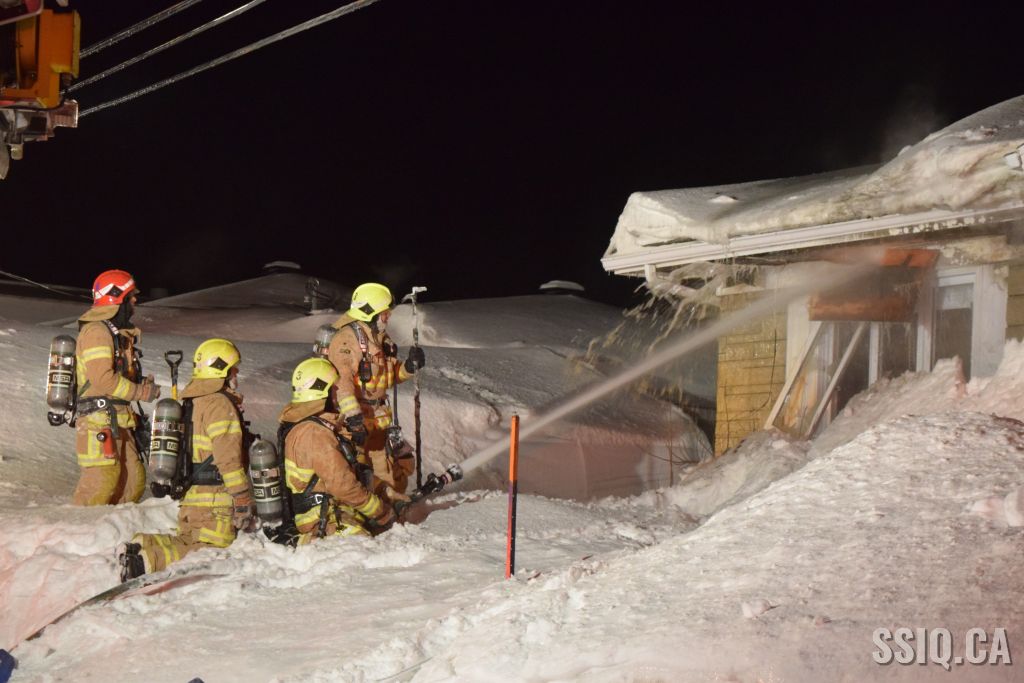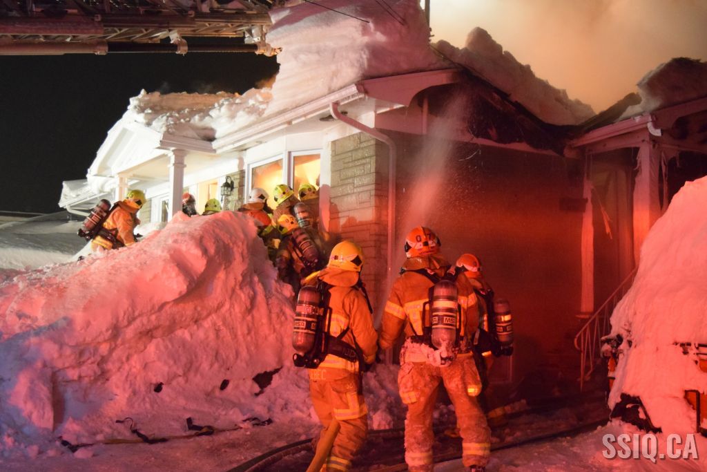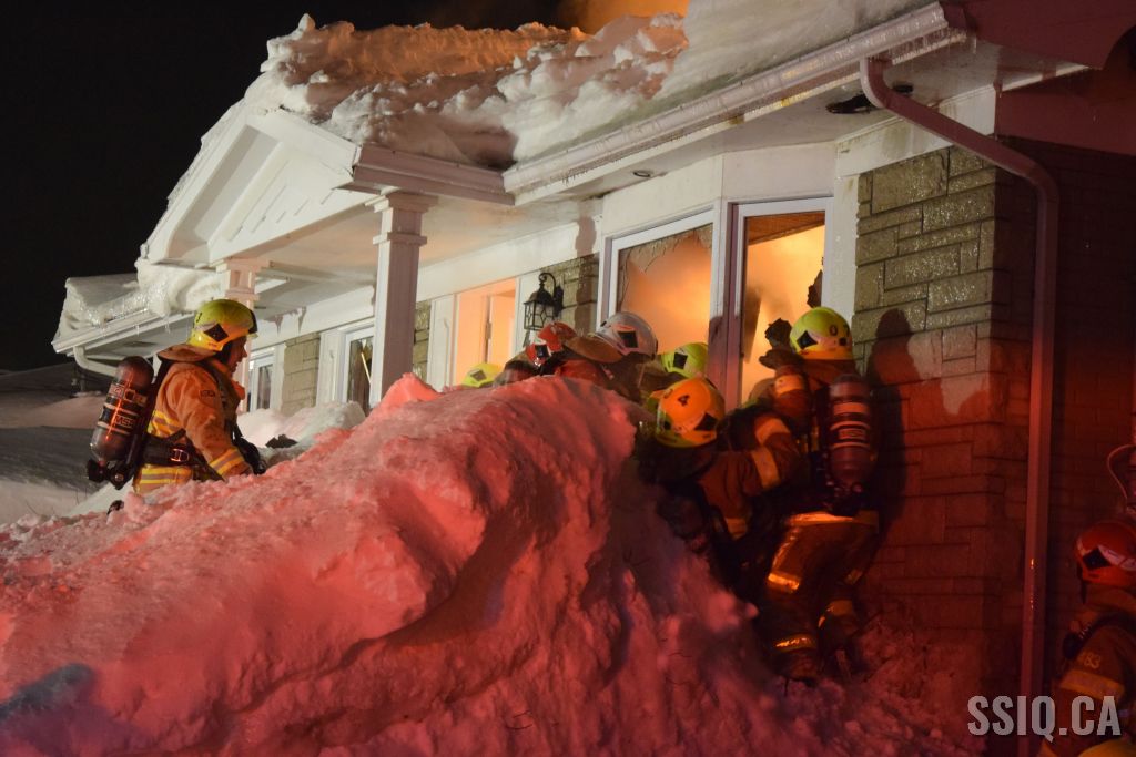 Très tôt vendredi matin une 1ère alarme est sonnée pour le 2 rue Doyon à Beauport. L'appel provient d'une voisine qui dit voir des flammes à l'intérieur et au toit d'une résidence, par contre elle n'est pas certaine de l'adresse. Sur les lieux, le 207 confirme le feu éclaté au toit et demande l'intervention nécessaire pour le 4 rue doyon. Les équipes se déploient pour effectuer la recherche primaire mais rapidement une parti de la résidence s'effondre, obligeant les pompiers à passer en mode défensif. la nacelle du 704 a été déployée avec le jet perforateur pour finaliser l'extinction. Un pompier a dû être transporté à l’hôpital. Heureusement aucune personne ne se trouvait dans la résidence au moment de l'incendie. Une quarantaine de pompiers ont été appelés sur les lieux.