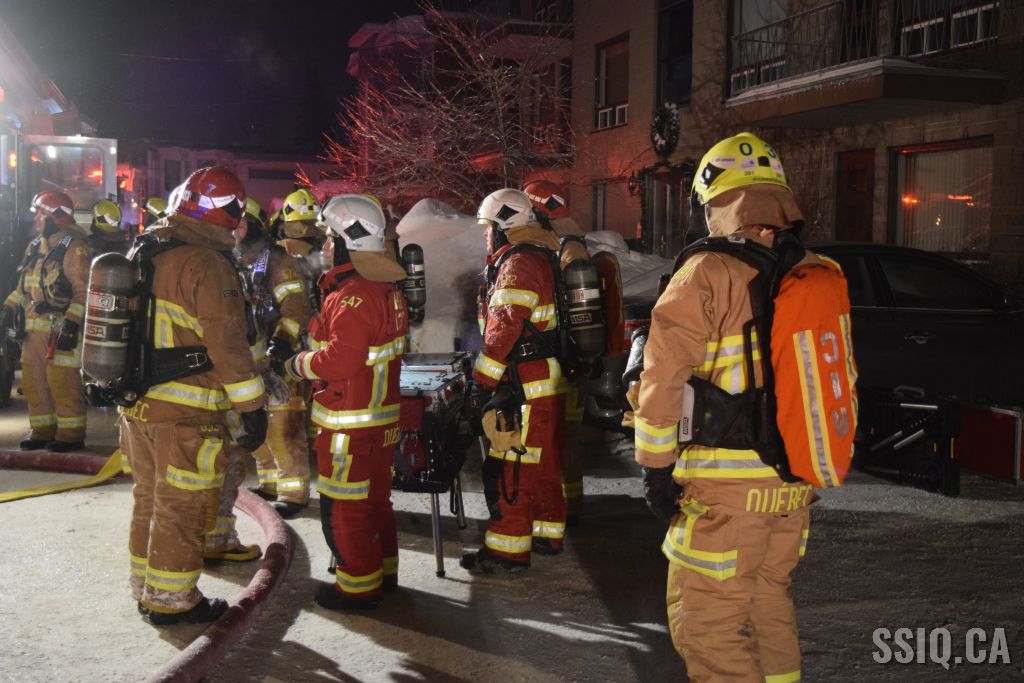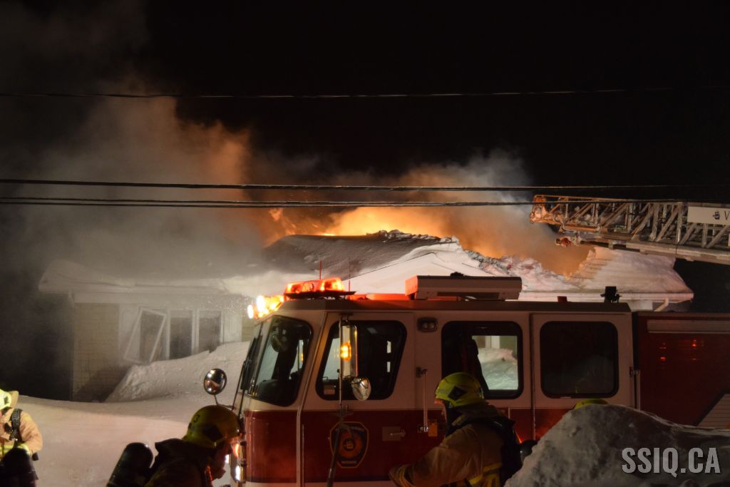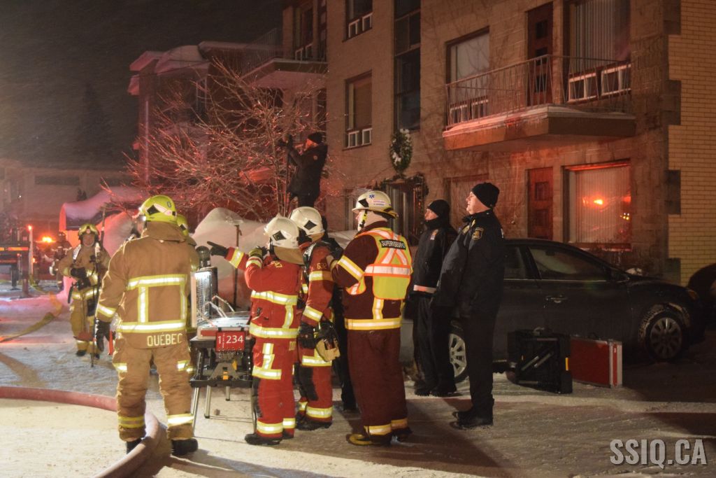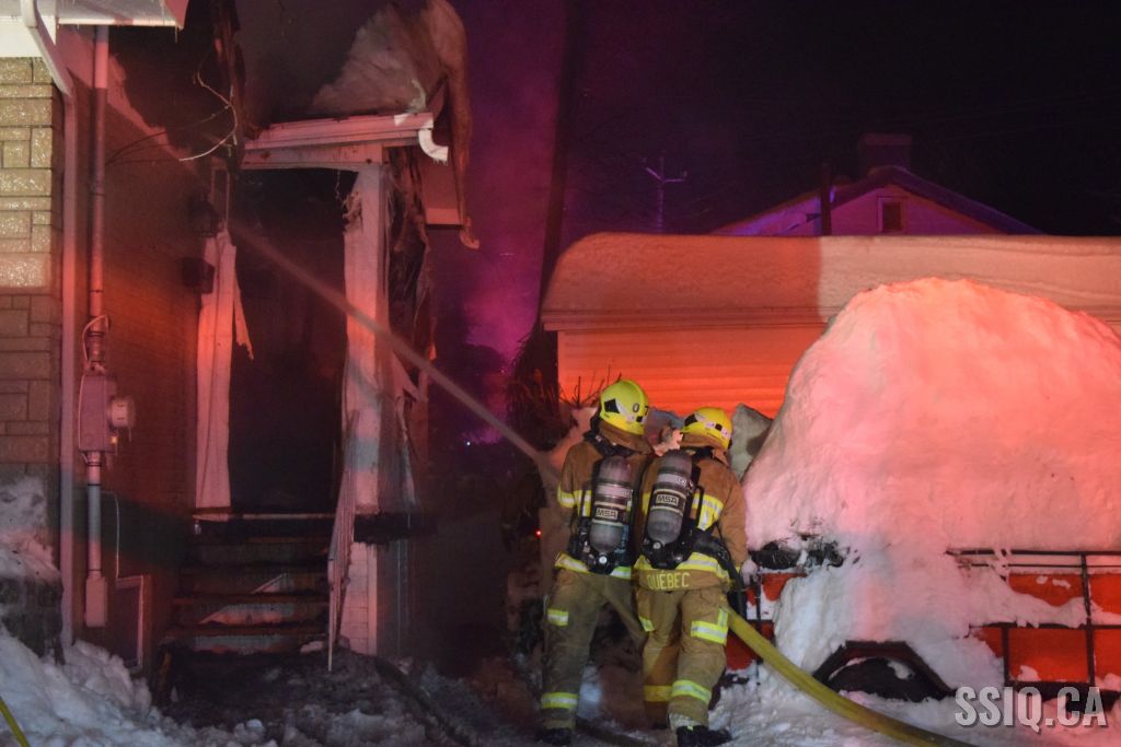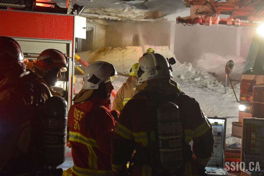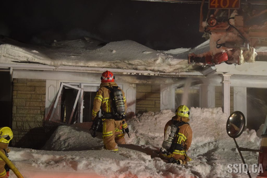 Très tôt vendredi matin une 1ère alarme est sonnée pour le 2 rue Doyon à Beauport. L'appel provient d'une voisine qui dit voir des flammes à l'intérieur et au toit d'une résidence, par contre elle n'est pas certaine de l'adresse. Sur les lieux, le 207 confirme le feu éclaté au toit et demande l'intervention nécessaire pour le 4 rue doyon. Les équipes se déploient pour effectuer la recherche primaire mais rapidement une parti de la résidence s'effondre, obligeant les pompiers à passer en mode défensif. la nacelle du 704 a été déployée avec le jet perforateur pour finaliser l'extinction. Un pompier a dû être transporté à l’hôpital. Heureusement aucune personne ne se trouvait dans la résidence au moment de l'incendie. Une quarantaine de pompiers ont été appelés sur les lieux.
