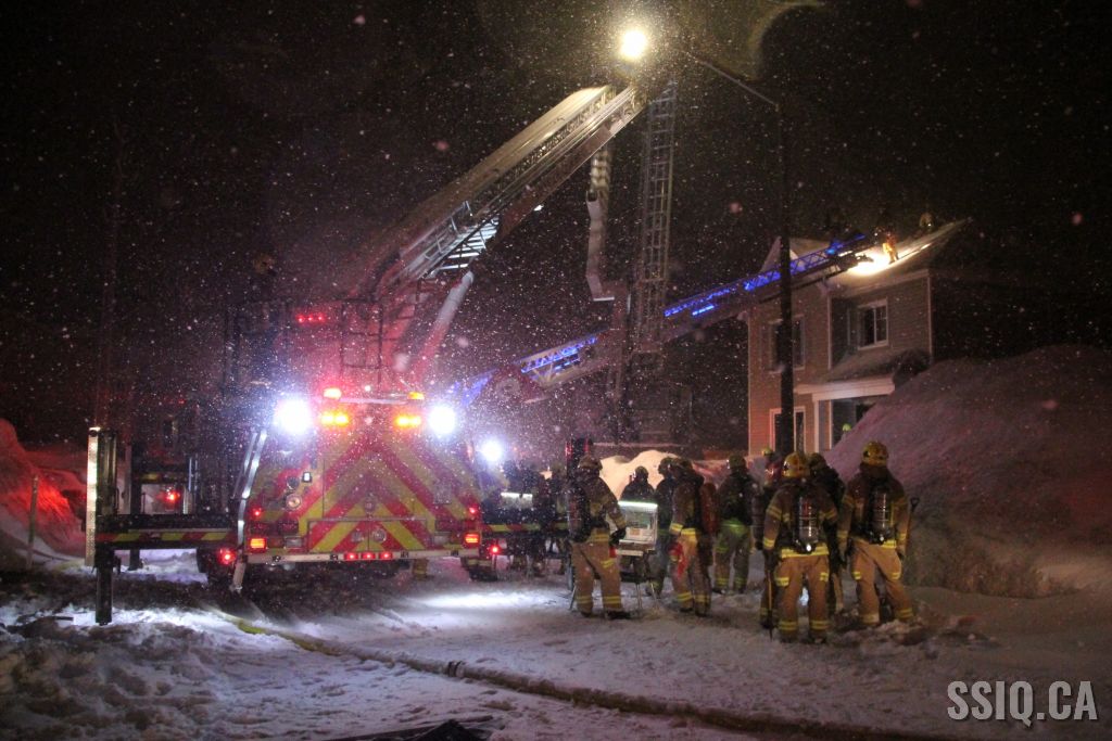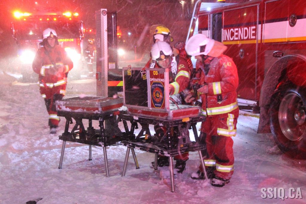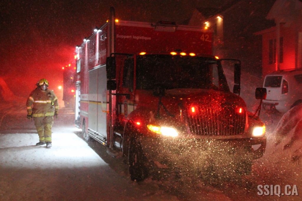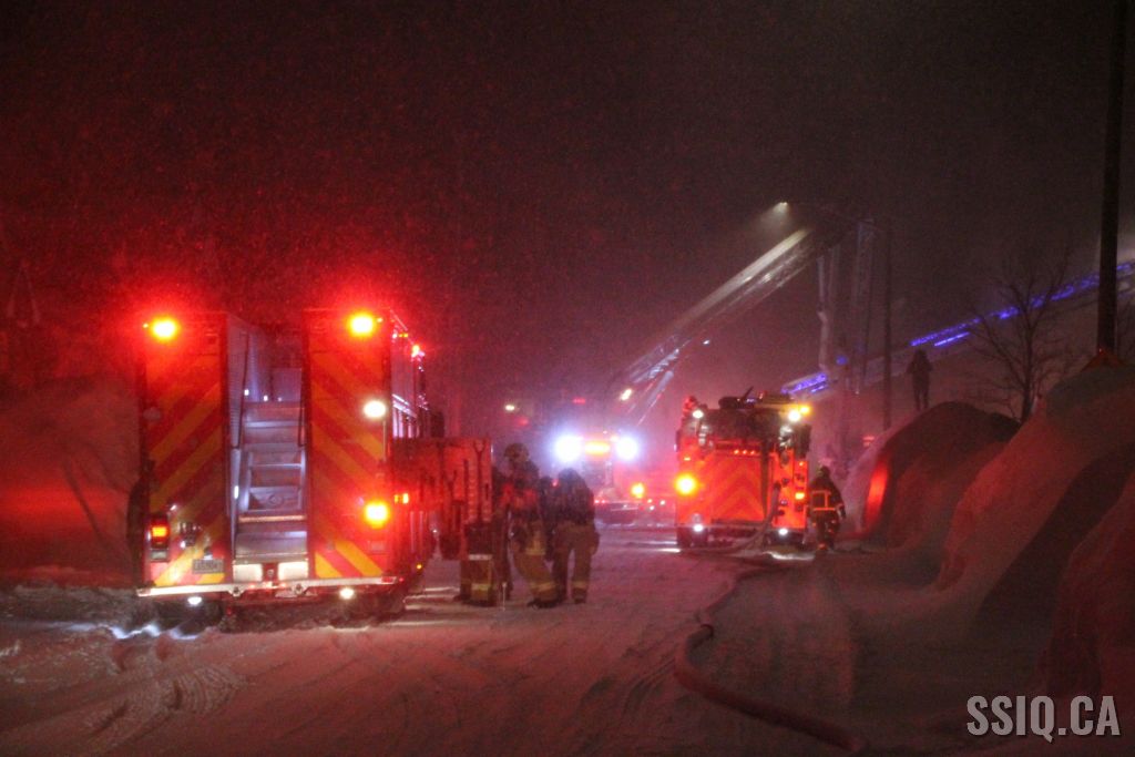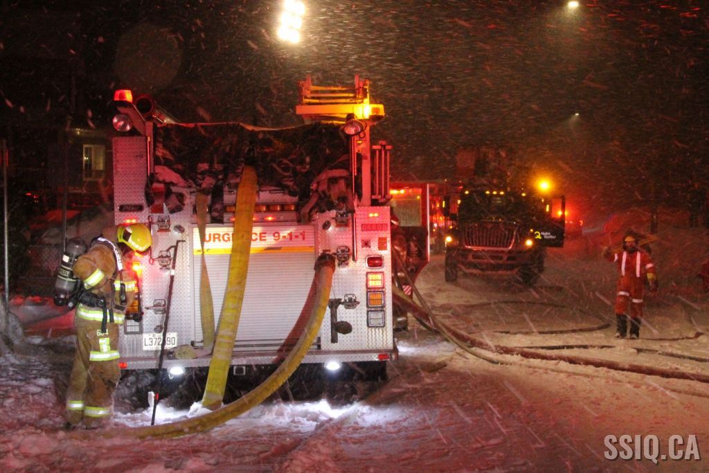 Rapidement sur les lieux, l'opérateur de l'échelle 408 confirme que le feu est en progression au niveau d'un mur extérieur et donne l'intervention nécessaire. À l'arrivée des premières autopompes, une attaque transitoire est effectuée au sous-sol, là ou l'incendie aurait pris naissance. Devant les conditions de fumée qui se détériorent, une 2e alarme est donnée.