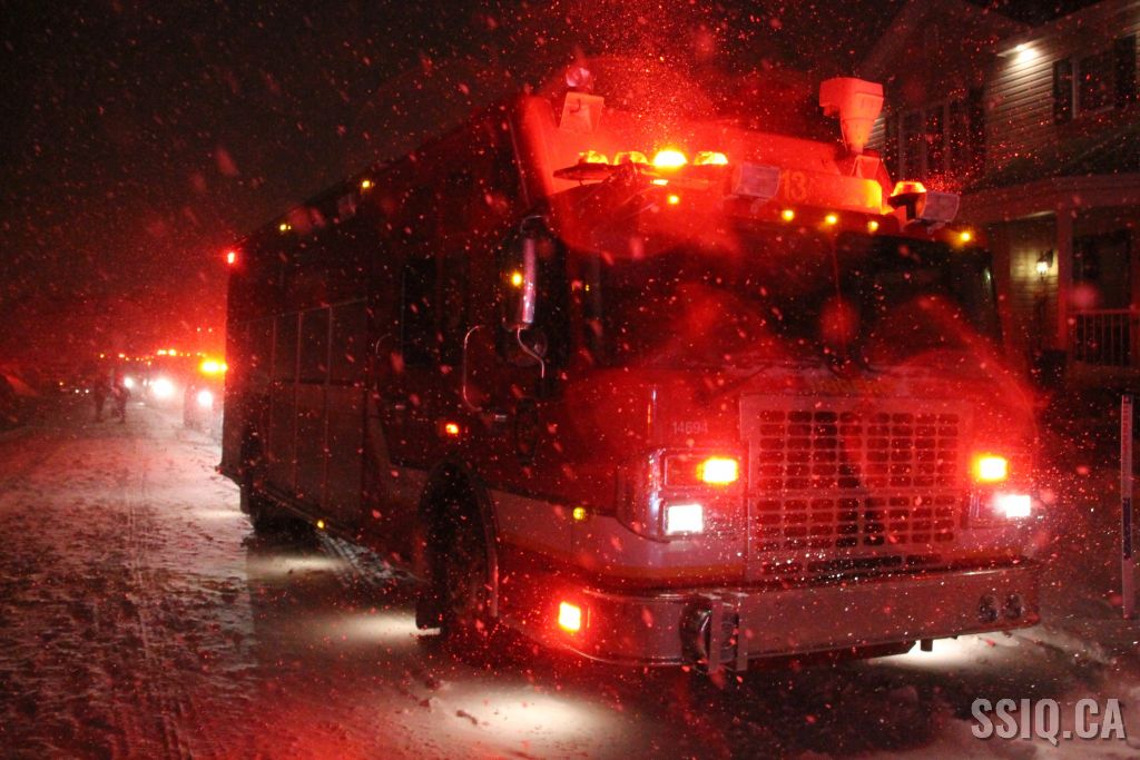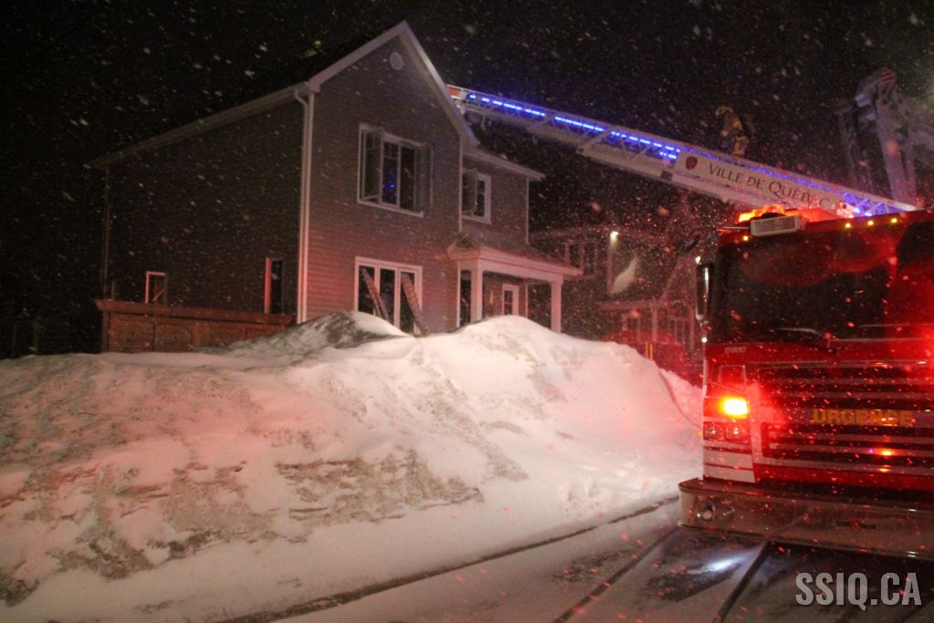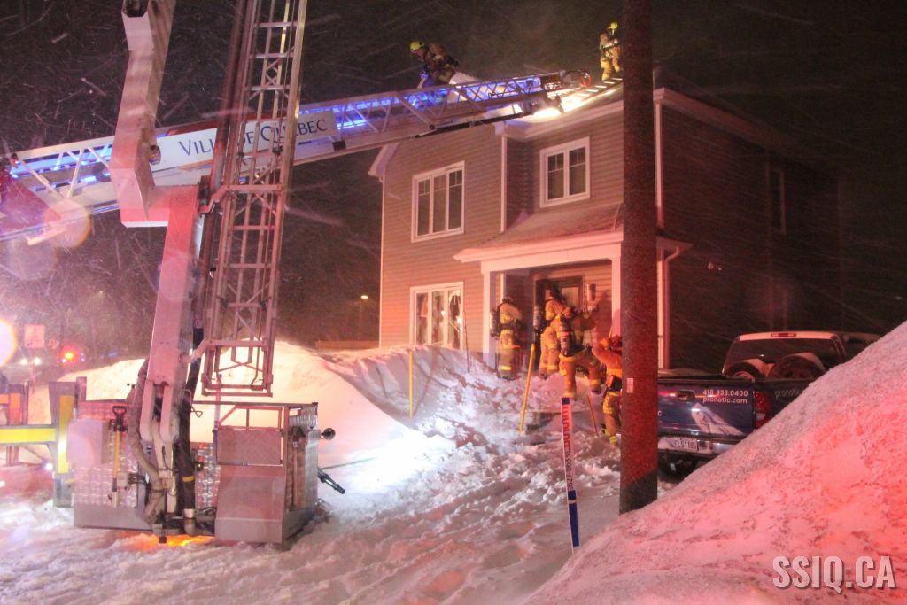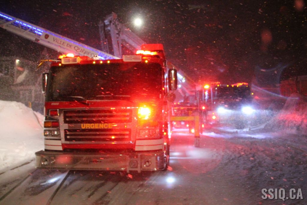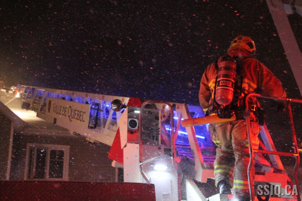 Rapidement sur les lieux, l'opérateur de l'échelle 408 confirme que le feu est en progression au niveau d'un mur extérieur et donne l'intervention nécessaire. À l'arrivée des premières autopompes, une attaque transitoire est effectuée au sous-sol, là ou l'incendie aurait pris naissance. Devant les conditions de fumée qui se détériorent, une 2e alarme est donnée.