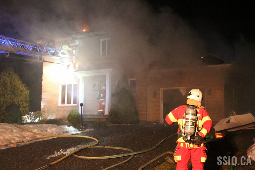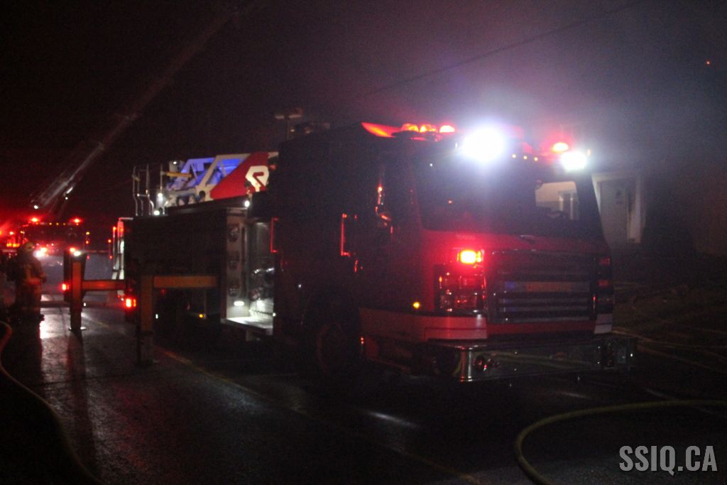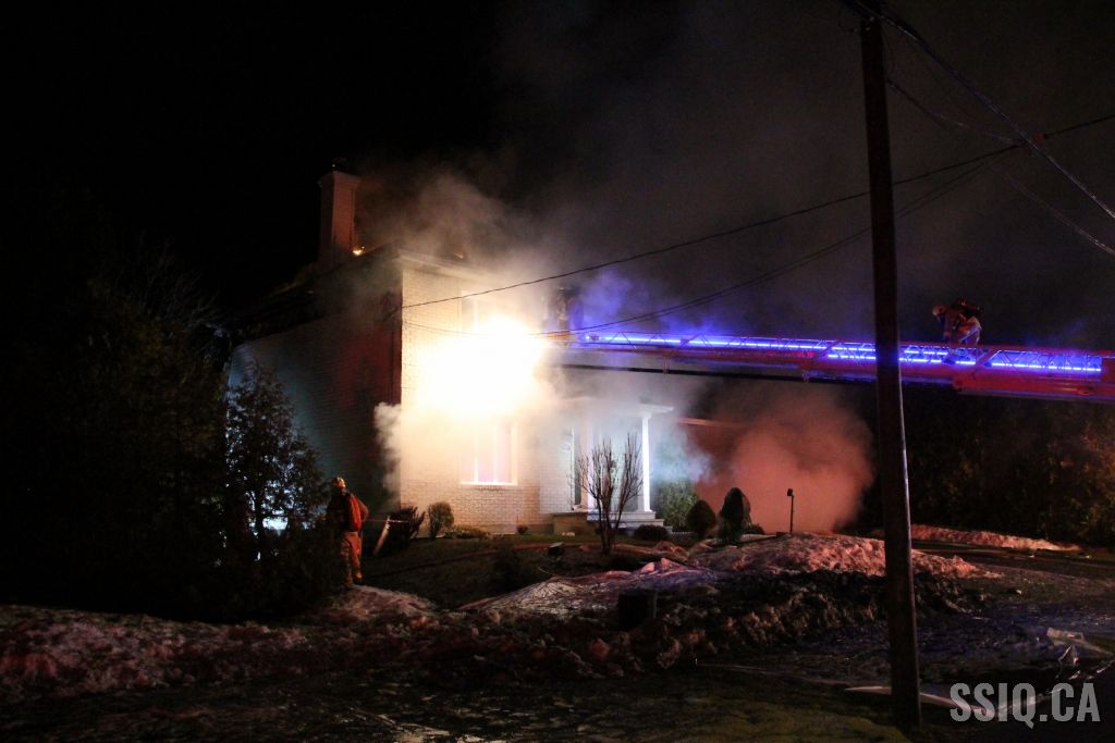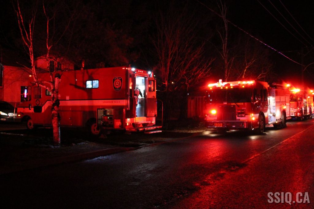 En soirée, une 1ère alarme est donnée au 2411 rue de la Rivière Jaune. Plusieurs appels sont logés au 911, le feu serait pris à la grandeur de la maison et il sortirait par les fenêtres.