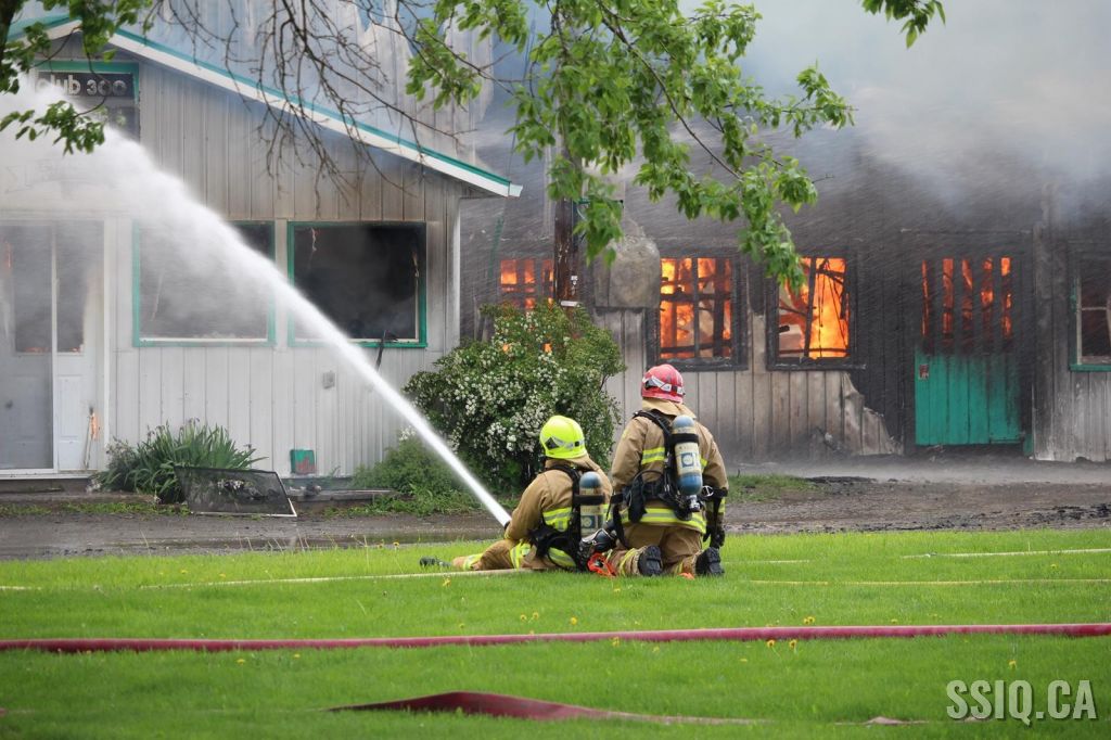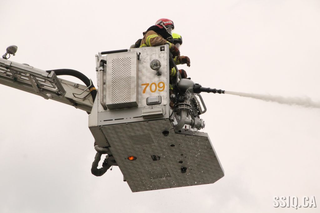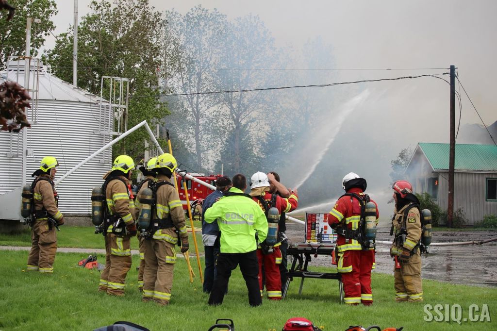 Le feu est éclaté à la grandeur du bâtiment (100 pieds par 100 pieds). La colonne de fumée est visible de très loin et des renforts policiers sont demandés pour aider à drainer la circulation automobile et protéger les pompiers au travail.