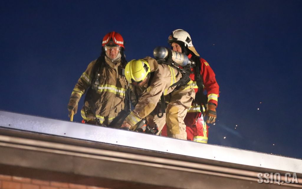 Le feu étant localisé dans la toiture du bâtiment multi commercial, les équipes se positionnent aux endroits stratégiques pour procéder à son extinction. Le PC demande une 3e alarme pour obtenir des effectifs supplémentaires, étant donné la grandeur du bâtiment.
