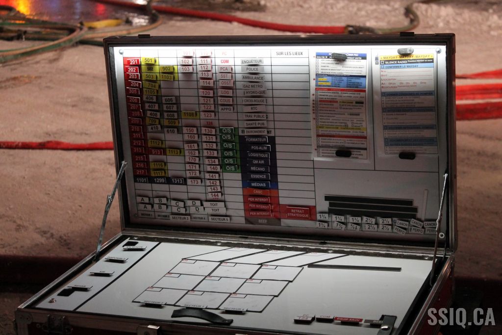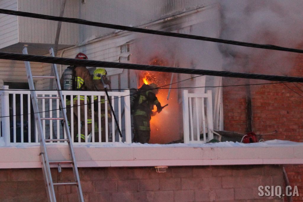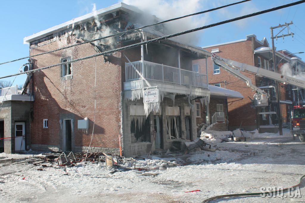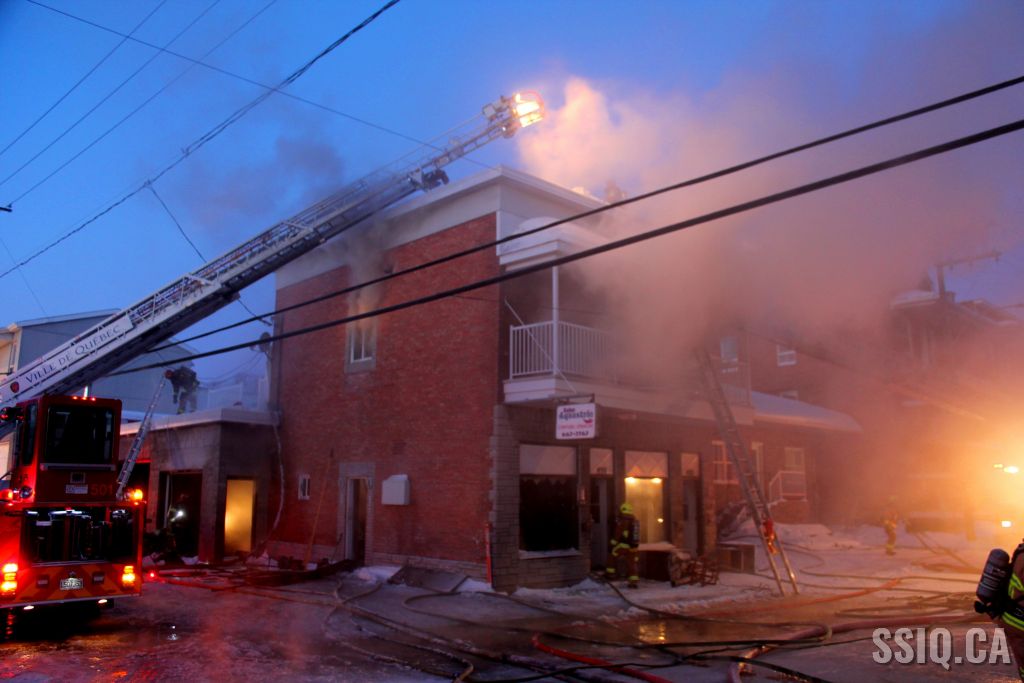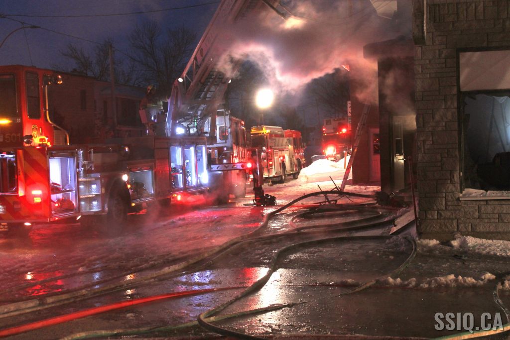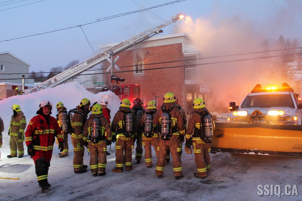 Rapidement sur place, les policiers confirment bel et bien la présence de fumée à l'extérieur du bâtiment. Avec les détails des policiers, le chef 123 donne l'intervention nécessaire. Arrivé sur les lieux , le 407 confirme que l'incendie est bien éclaté a l’arrière du bâtiment. Les flammes se propagent, rapidement les secours sont engagés à plein. À 8h08, le 123 ordonne un retrait stratégique dans tous les secteurs et que les équipes passent en mode défensif. Un délestage à distance a été demander à Hydro-Québec.