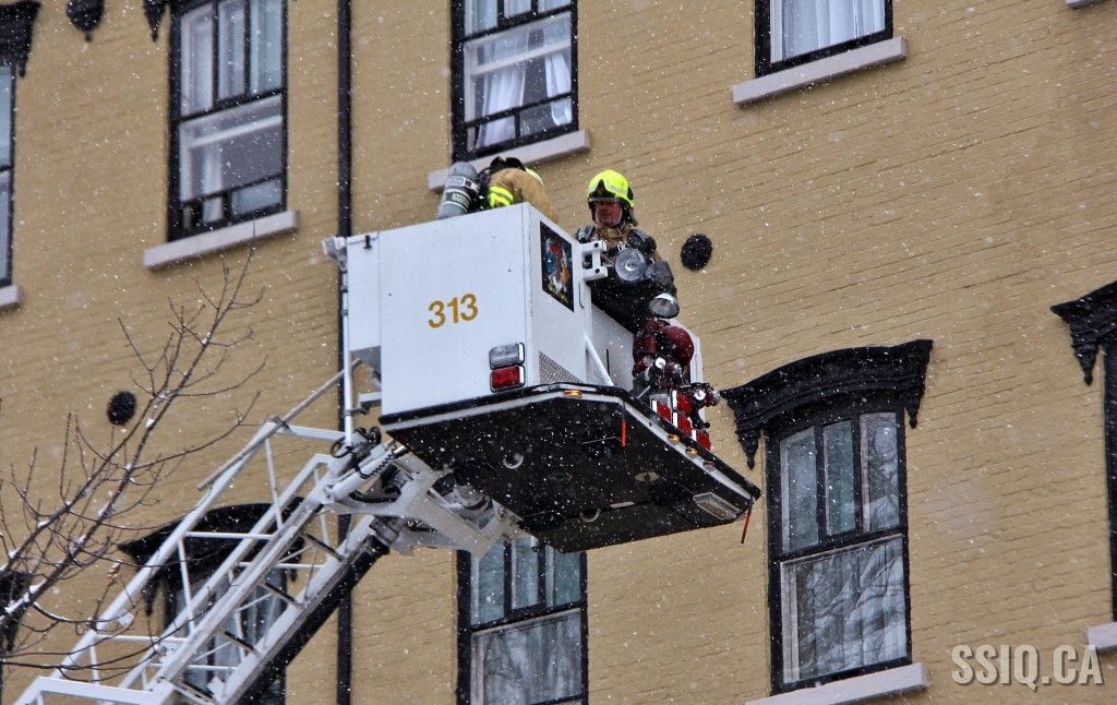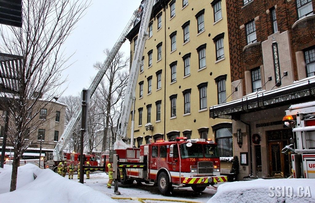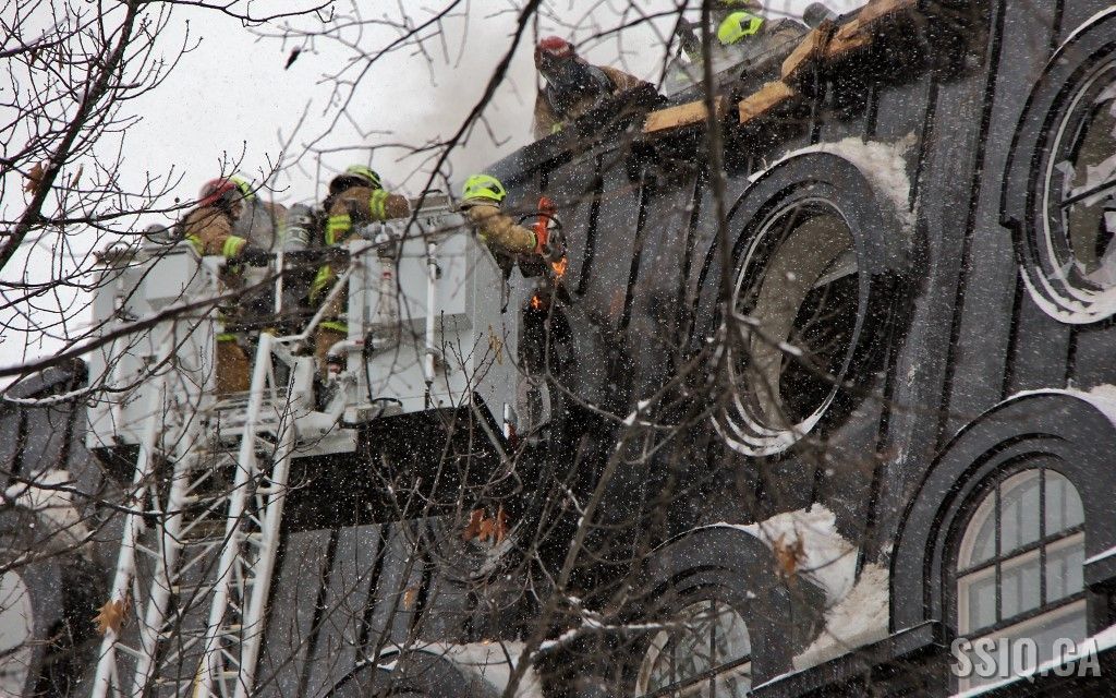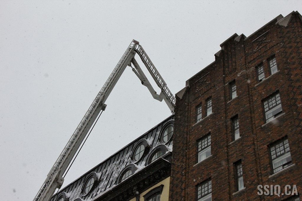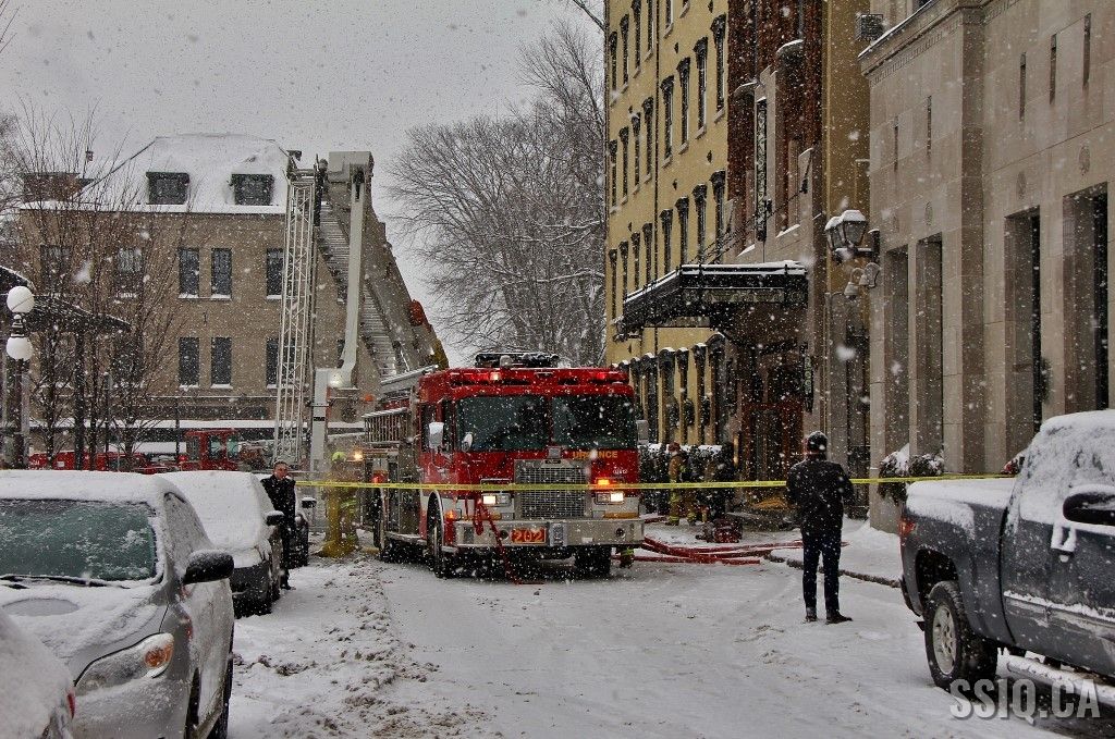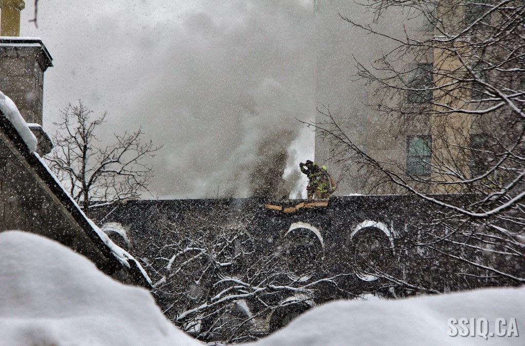 Rapidement sur place, l'équipe du 202 confirme qu'il y a de la fumée apparente au niveau du toit. Les équipes se déploient sur les étages pour constater que le feu fait bel et bien rage dans une salle mécanique située au 6e étage et qu'il se propage rapidement, une 2e alarme est alors demandée. Les flammes ont réussi à attaquer la toiture qui est difficilement travaillable étant donné l'âge du bâtiment. Plusieurs ouvertures ont été fait au niveau de la toiture pour contrôler l'incendie. Devant les risques élevés d'aggravation une 3e et 4e alarme sont sonnées.