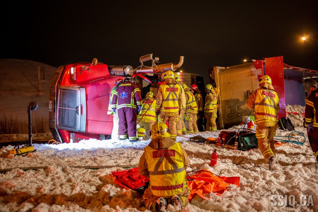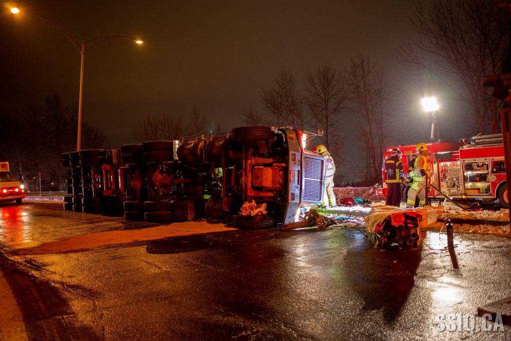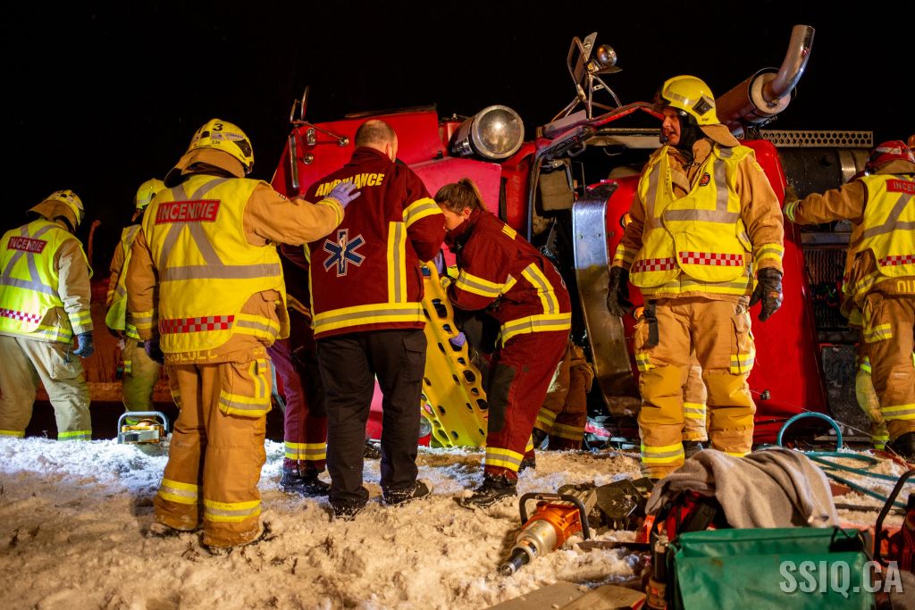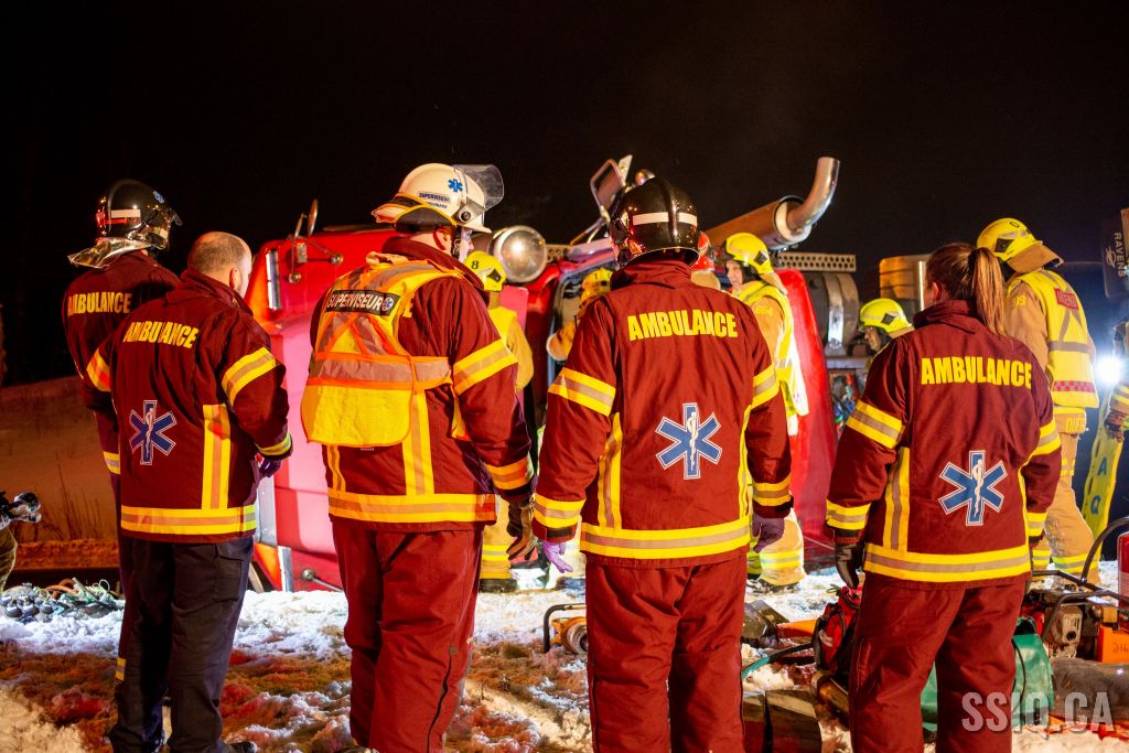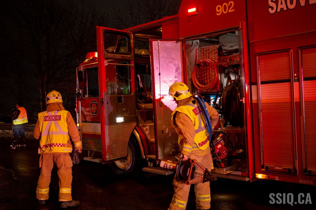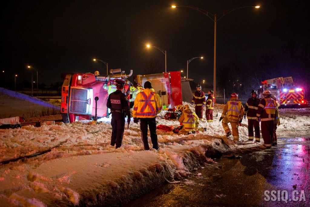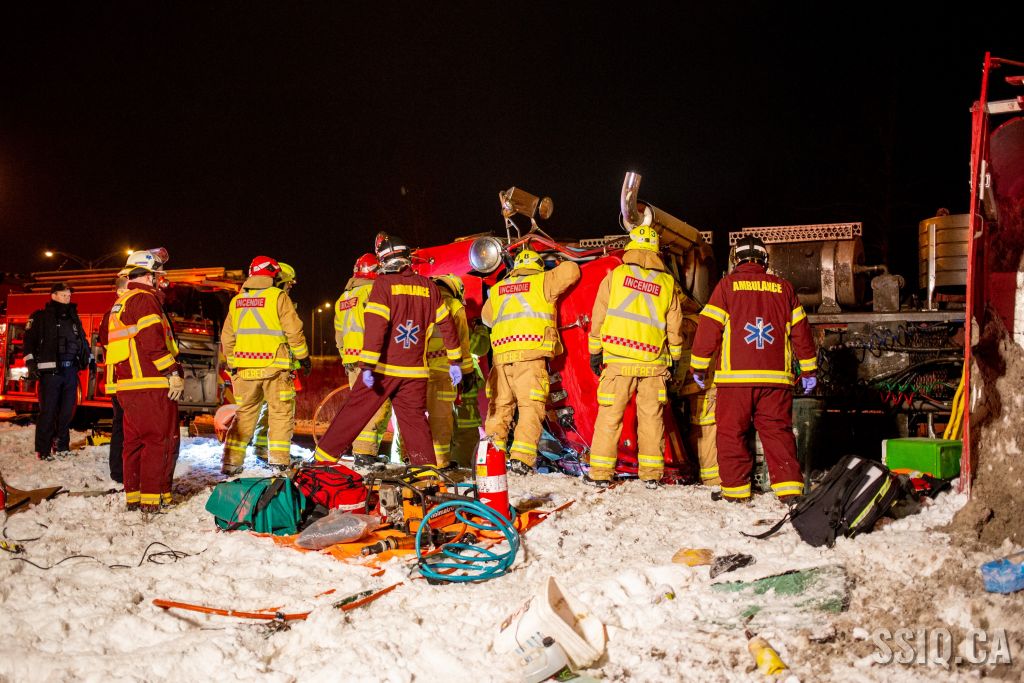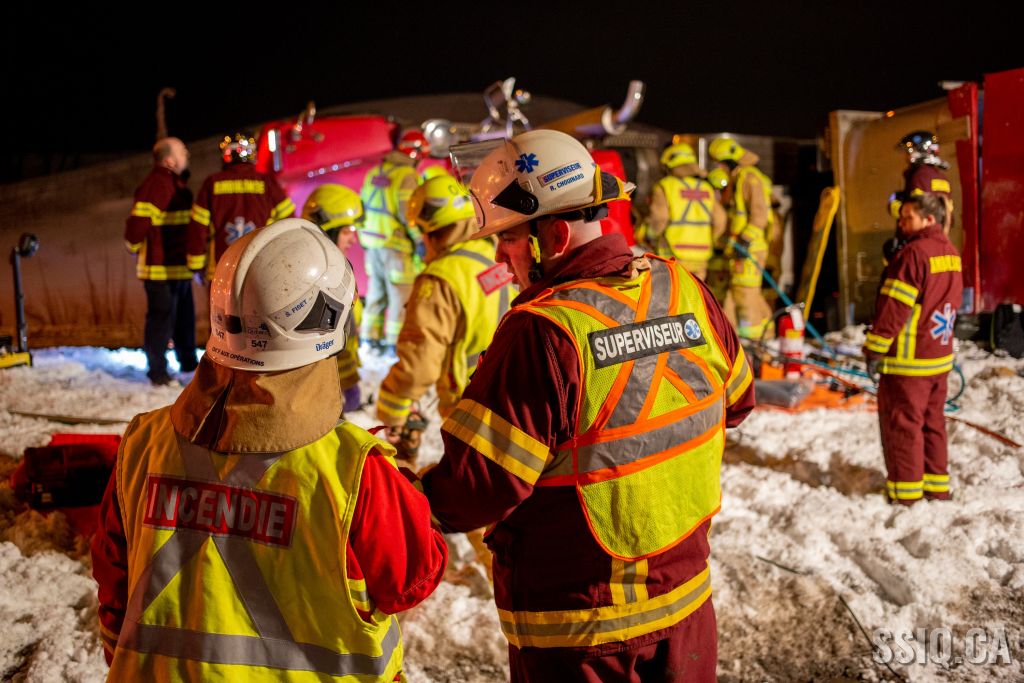 Les policiers sont les premiers à arriver sur les lieux. Le conducteur du camion est coincé dans la cabine et il y a écoulement d'essence. L'utilisation des outils de désincarcération sera alors nécessaire, et à la demande du chef Fiset (133), l'unité 913 spécialisée en matières dangereuses est répartie étant donné l'écoulement d'essence.