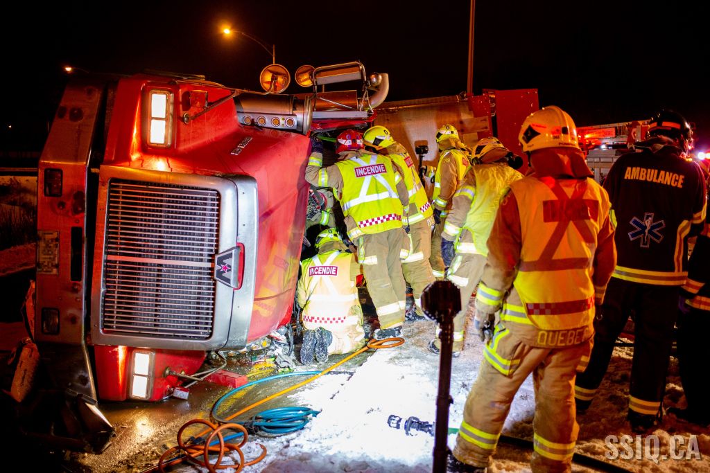 Le conducteur du camion impliqué dans l'accident est pris en charge par les paramédics, et transporté dans un centre hospitalier de la région.