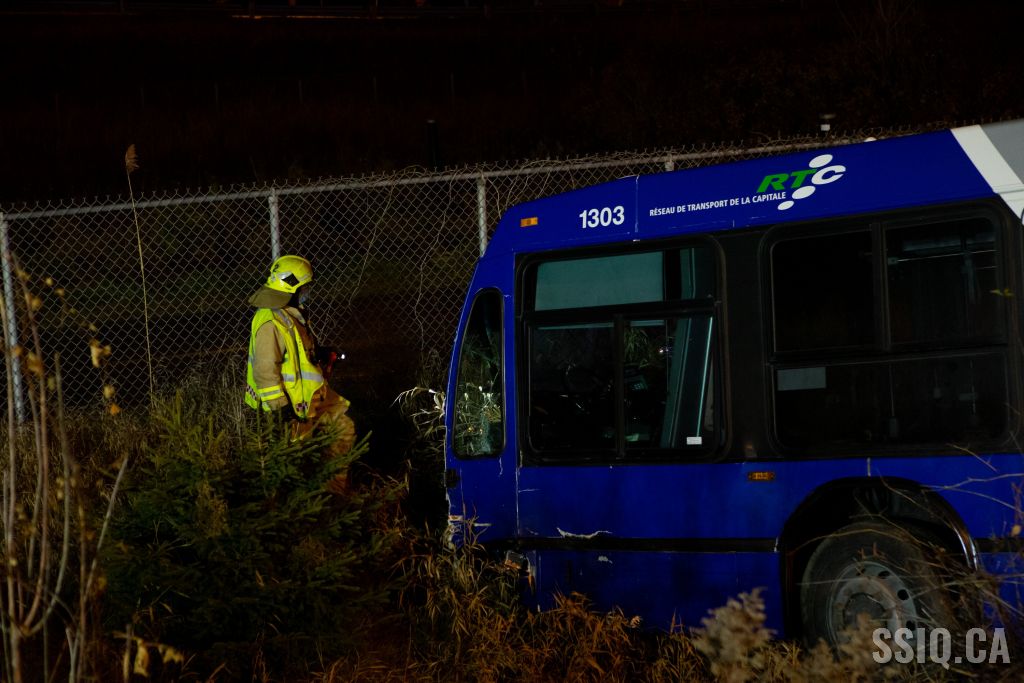Les appels logés à la centrale 911 font mention d'un violent impact entre deux véhicules, d'un autobus du RTC dans un fossé, et d'un conducteur d'un des véhicules blessé.