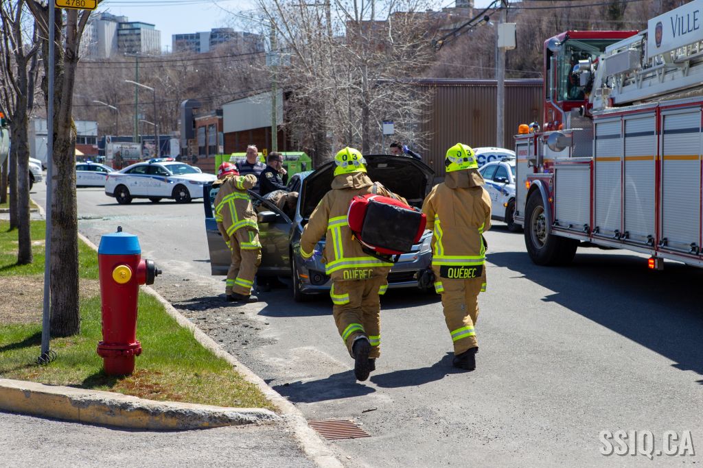 L'appel logé au 911 mentionne un accident entre un véhicule et un camion à ordures. Le passager du véhicule est blessé et possiblement coincé.
