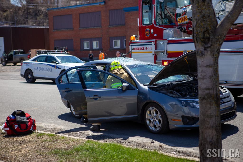 Les policiers sont les premiers à arriver sur les lieux. Les traces d'impact démontrent que l'impact à été violent du côté conducteur. Heureusement, ils confirment que la victime n'est pas coincée. En arrivant sur les lieux, l'officier du 503 confirme à son tour que les pinces de désincarcération ne seront pas nécessaires. L'équipe s'affaire à stabiliser la victime en attente des paramédics. La victime sera prise en charge et transportée dans un centre hospitalier de la région.