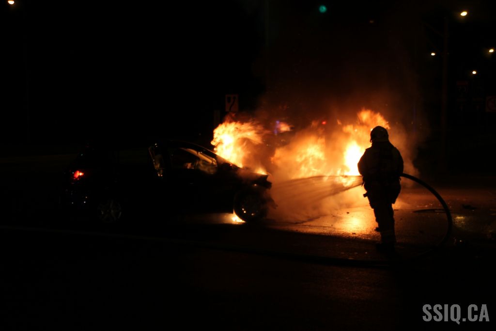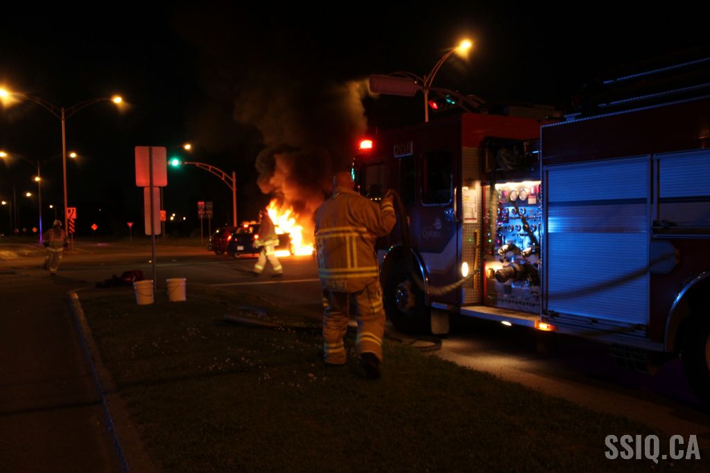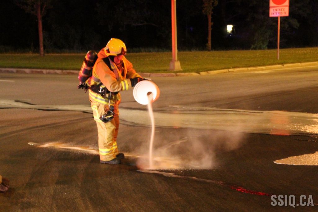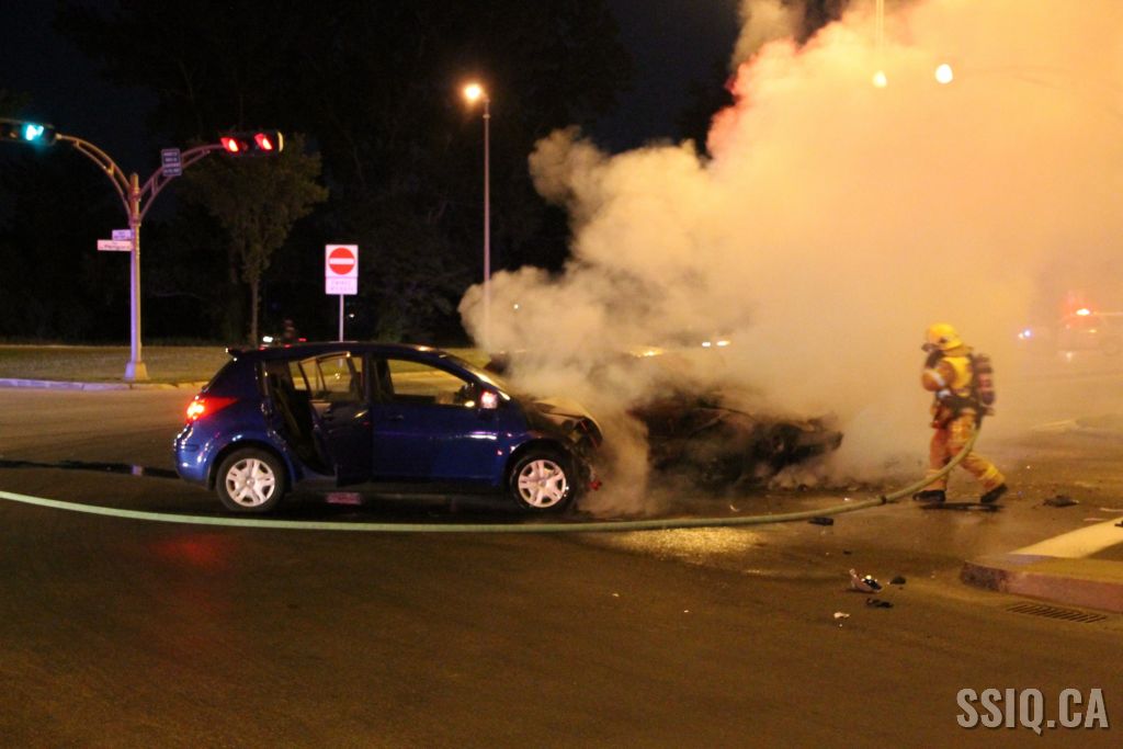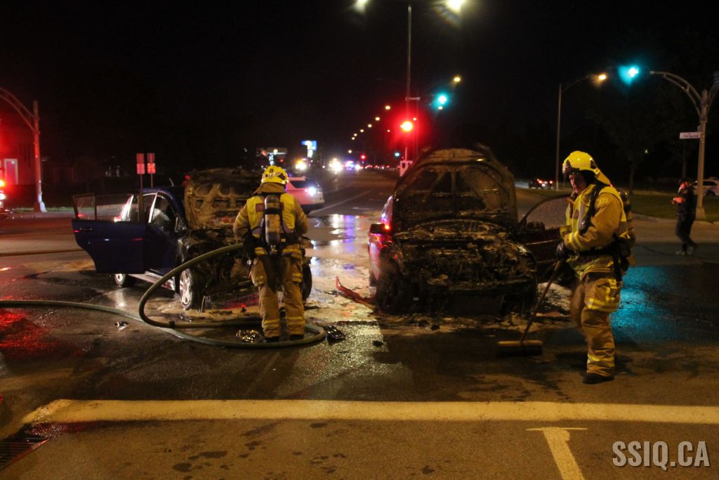 En fin de soirée, un accident entre 2 véhicules est survenu à l'intersection du Boulevard Jean-Talon Ouest et de la rue du Périgord. Avec la fuite de liquide, les véhicules ont pris en feu.