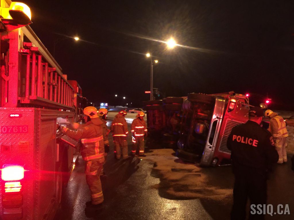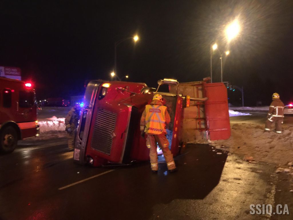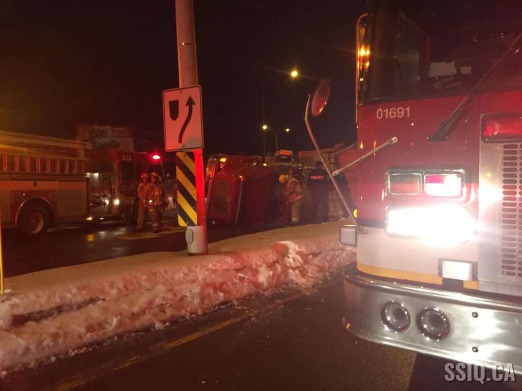 305, 203. Les pompiers sont intervenus pour un camion transportant de la neige qui s'est renversé sur son côté. La première unité sur les lieux annonce que les mâchoires de vie ne sont pas nécessaires pour sortir la victime.