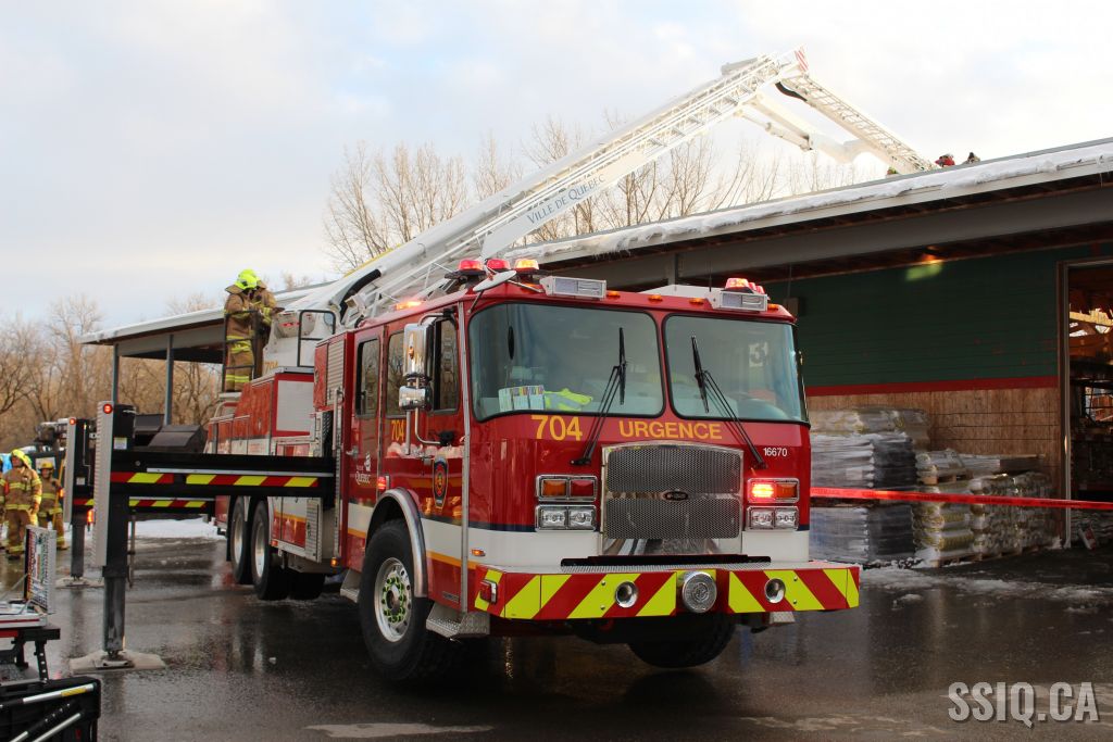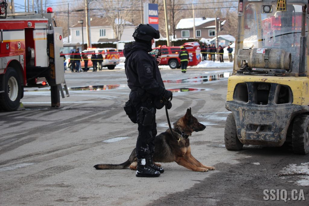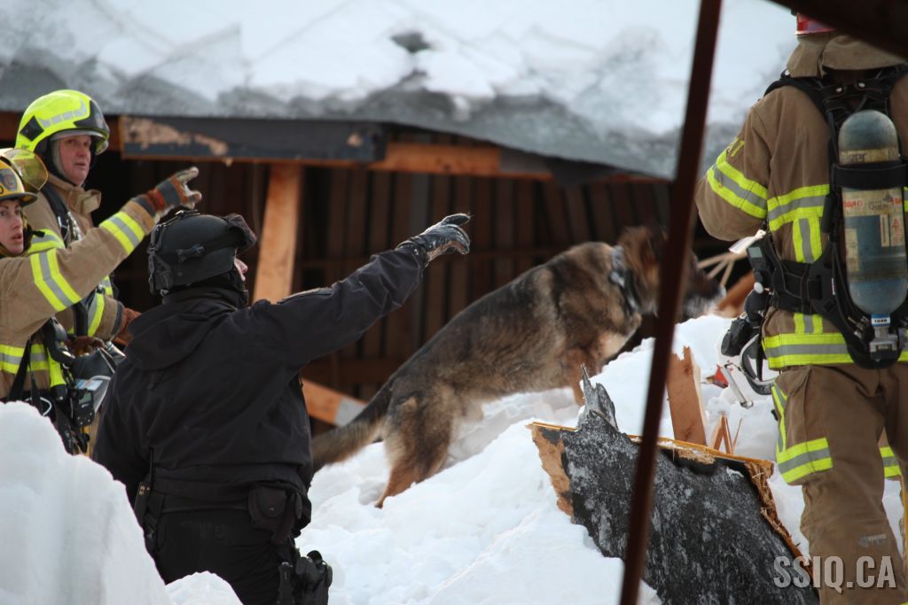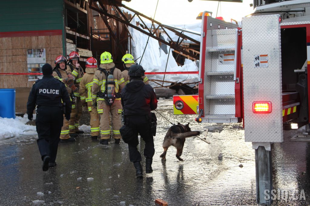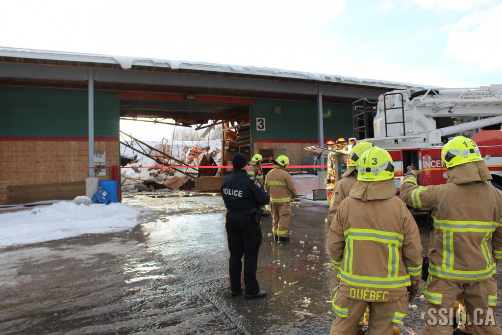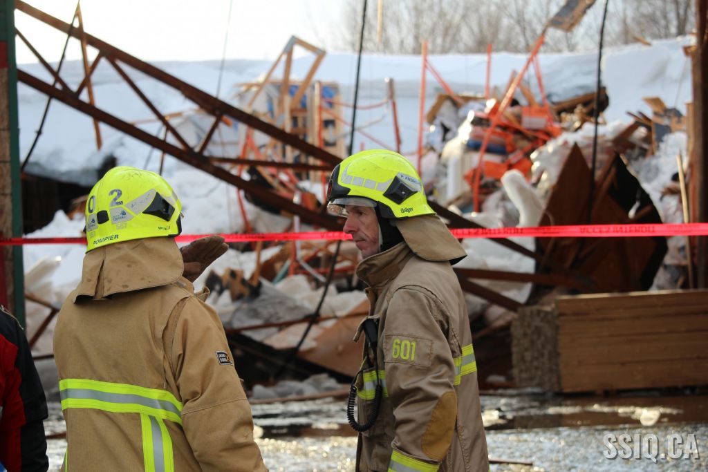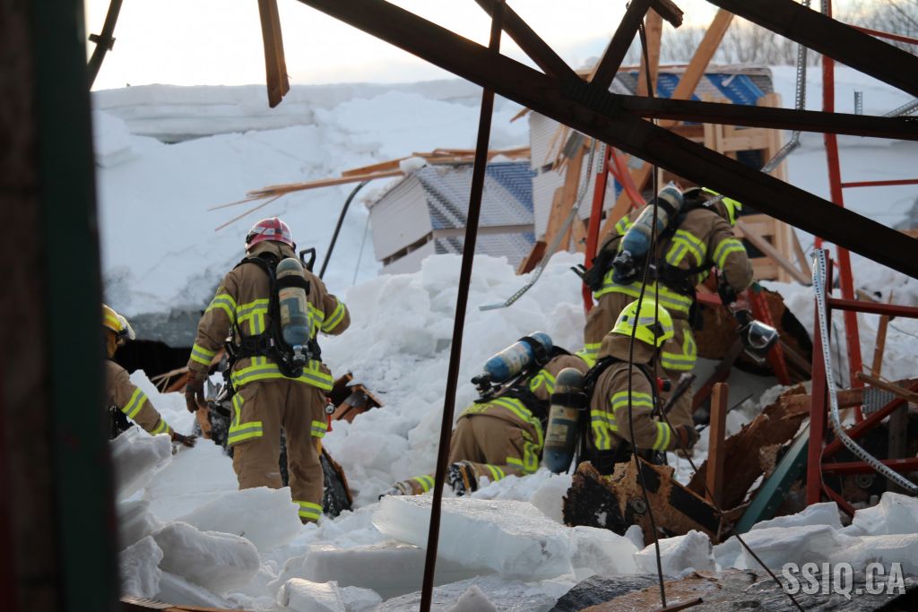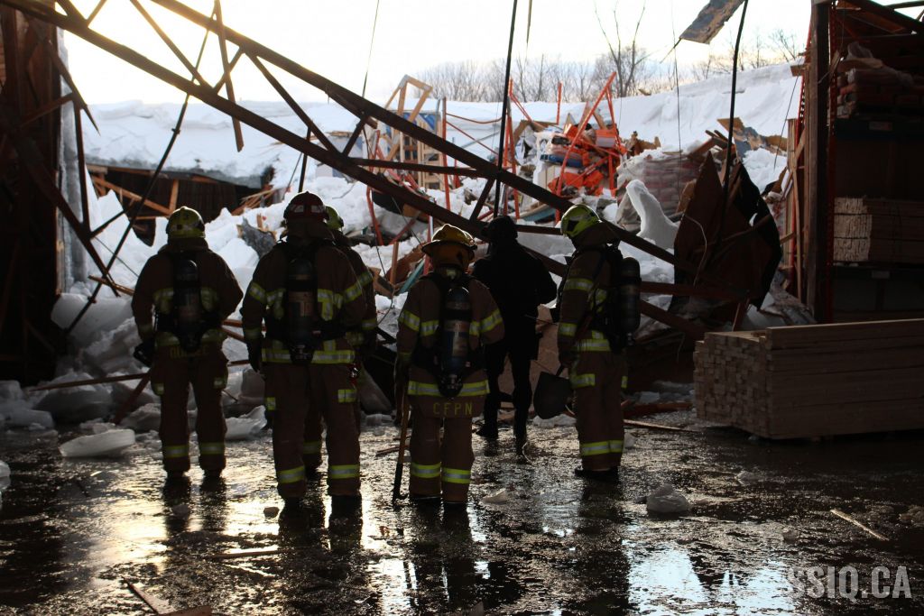 Le toit d'un entrepôt de grande superficie de l'entreprise Rona a exigé un déploiement considérable de ressources. Bien que, initialement, le plaignant croyait qu'il n'y avait personne à l'intérieur, une discussion entre les responsables n'a pu garantir cette information à 100%. Les ressources spécialisées en espace clos et un maître-chien du SPVQ ont donc été dépêchées sur les lieux. Après de méticuleuses vérification, il a été confirmé que personne n'était coincé sous les débris.