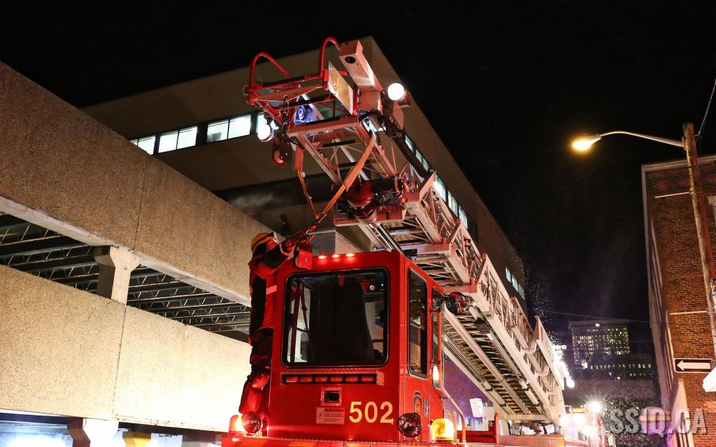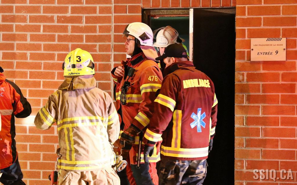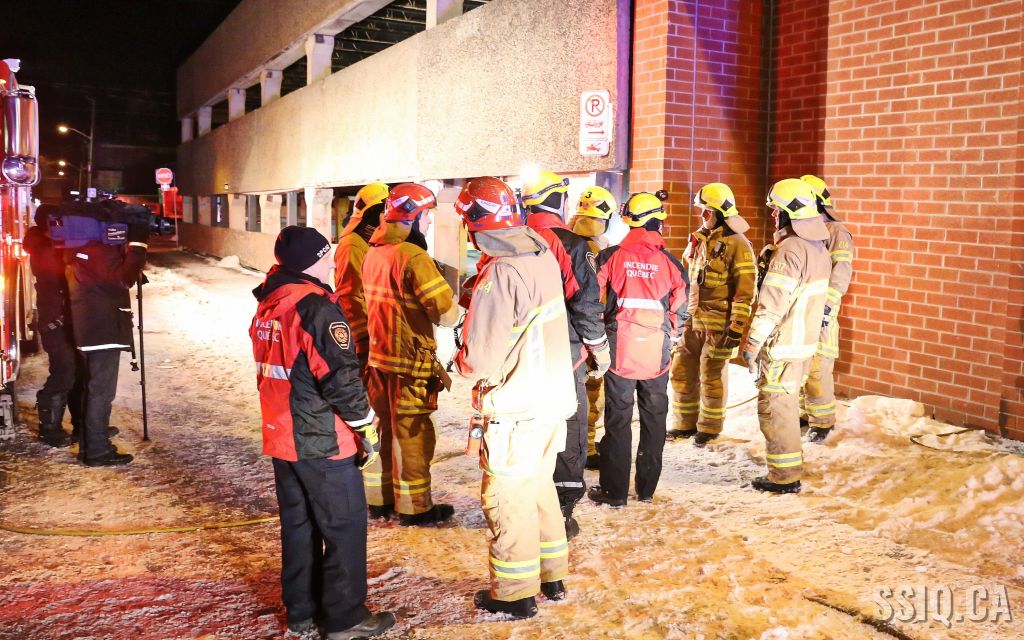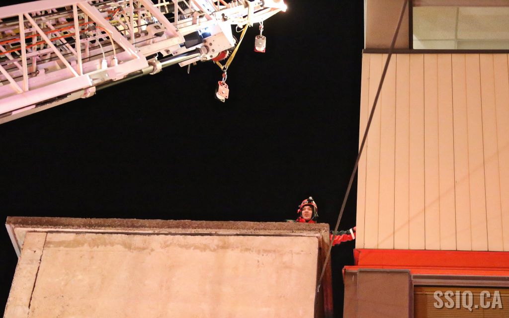 L'appel provient des policiers qui, en patrouillant, ont localisé un homme coincé entre deux bâtiments avec un espace de 6 pouces seulement. La victime était consciente et semblait être en hypothermie. Pendant que les équipes de la caserne 2 établissaient une stratégie d'approche par le toit, les hommes des casernes 3 et 13 essayaient de progresser par l'intérieur d'un bâtiment en y perçant un trou pour sortir la victime. Tout au cours des opérations, les intervenants ont réchauffé du mieux possible ceple-ci avec une chaufferette d'appoint. Vers 23h30, le PC confirme que les pompiers ont réussi à faire un trou permettant d'extirper l'infortunée de sa fâcheuse position.