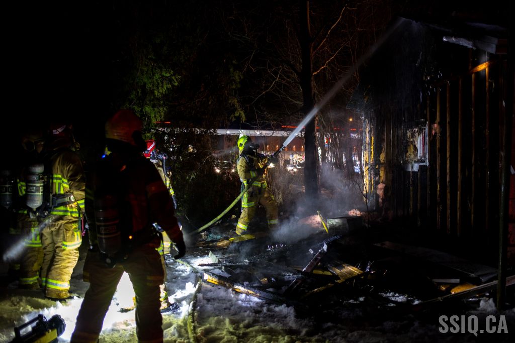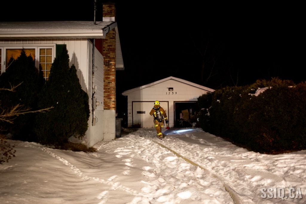 L'appel est entré à la centrale 911 par un citoyen. Les détails font mention de garage en feu derrière une résidence. Arrivé sur place, l'officier du 212 confirme le feu éclaté derrière un garage double de 20 x 30 pieds, l'intervention sera alors nécessaire.