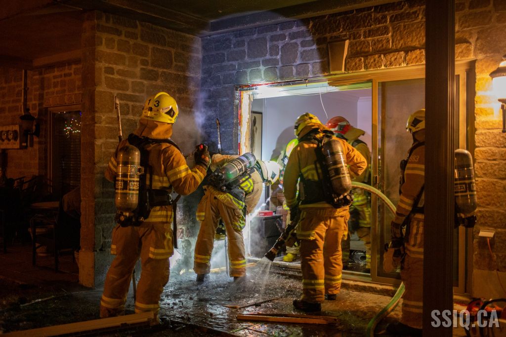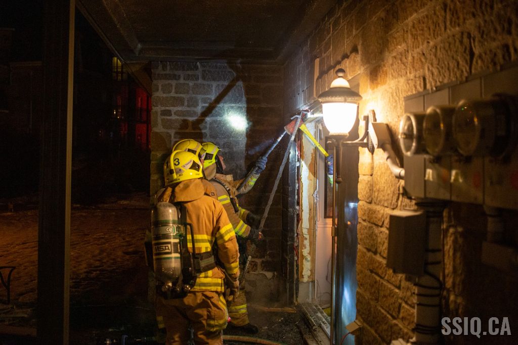 Sur les lieux, l'officier du 313 confirme la fumée visible derrière l'immeuble. L'extinction sera rapide à l'aide d'un jet. Les équipes devront cependant effectuer des vérifications de propagation dans l'assemblage de la porte-patio.