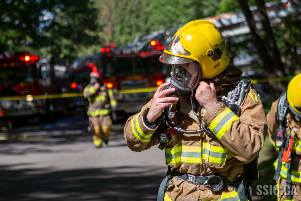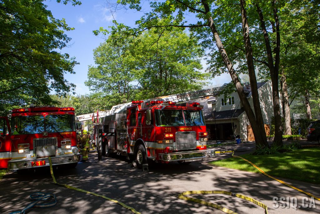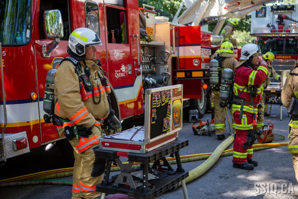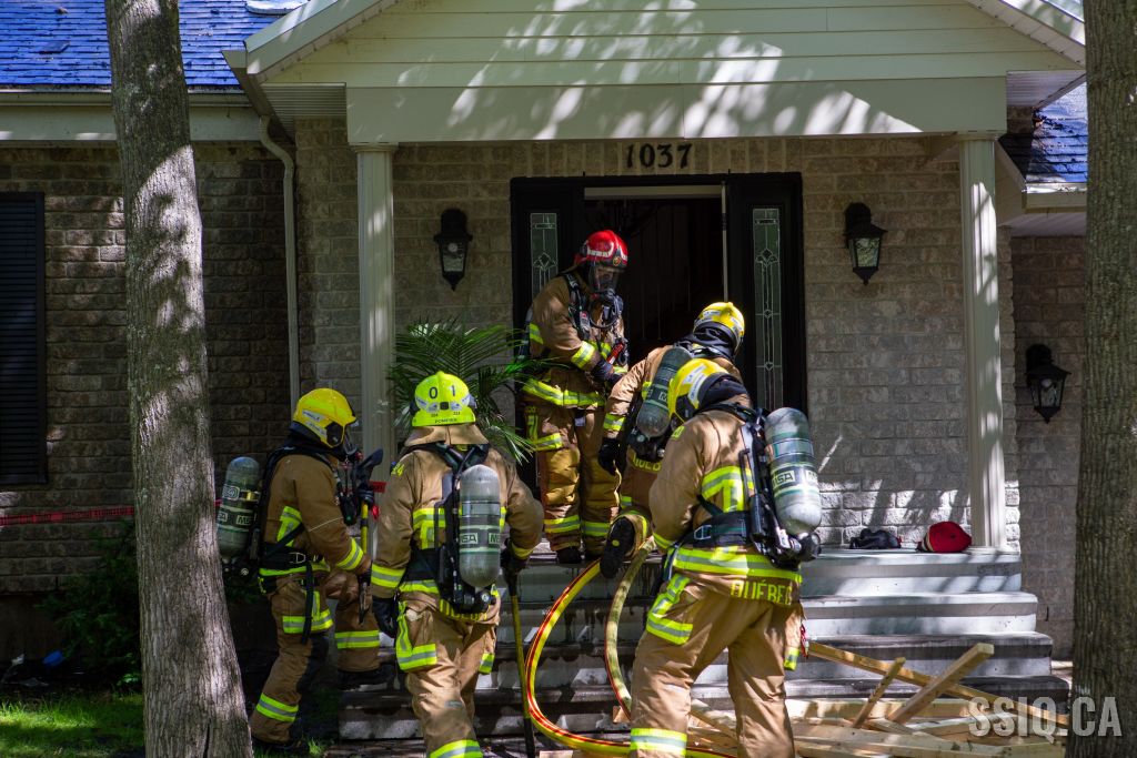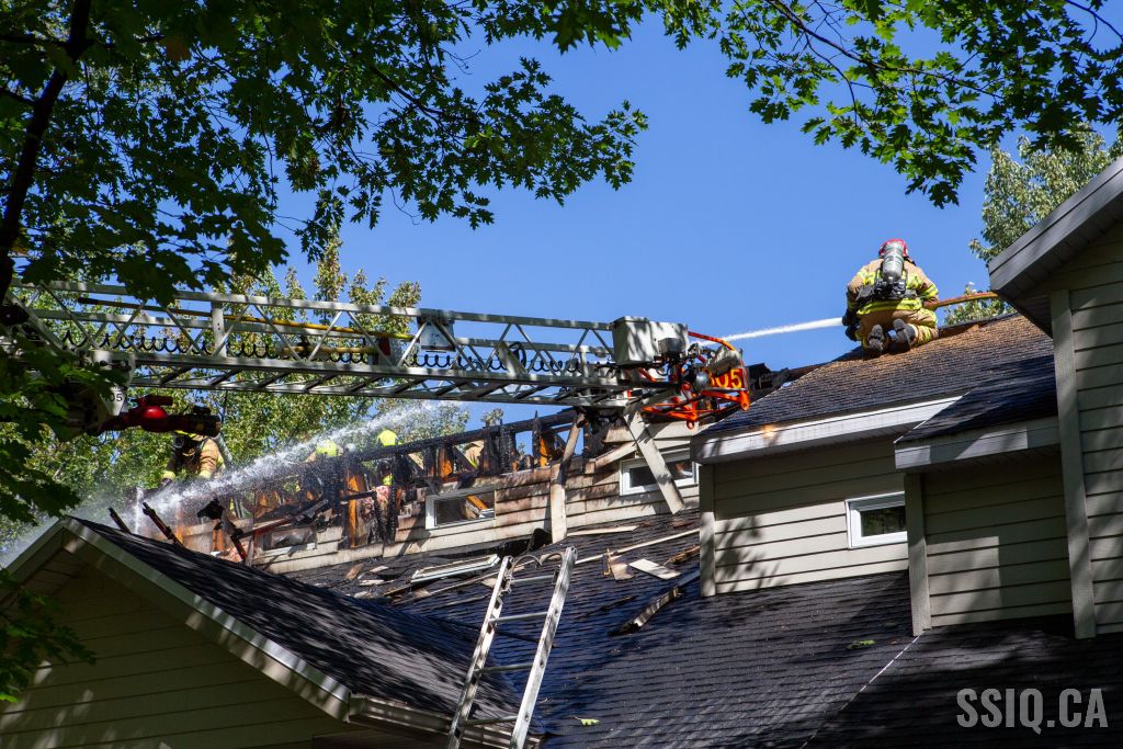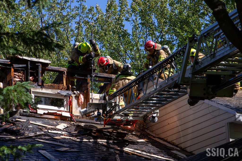 De nombreuses ouvertures sont effectuées par des équipes au toit et à l'intérieur de la résidence pour atteindre les flammes. Des périmètres d'exclusion sont faits à l'avant et à l'arrière de la résidence pour la chute des débris.