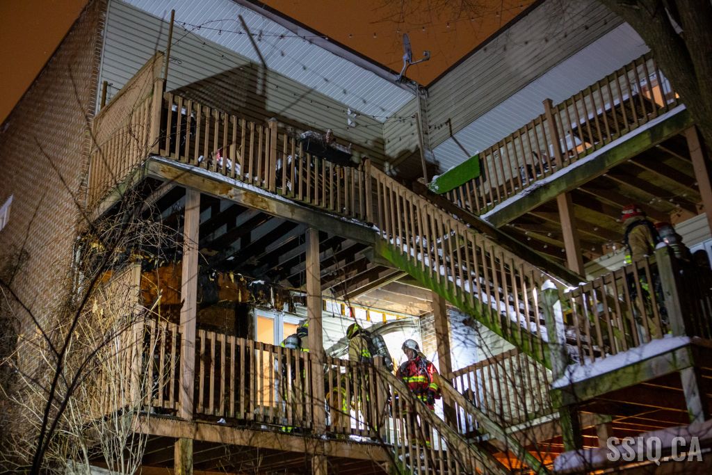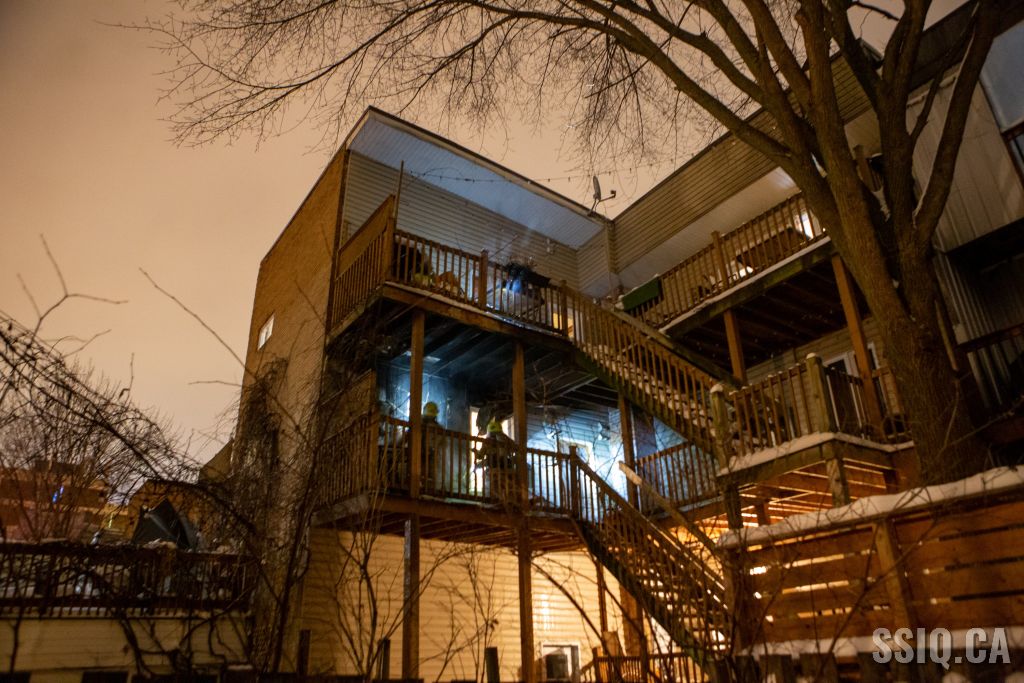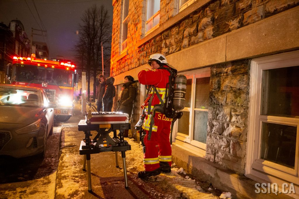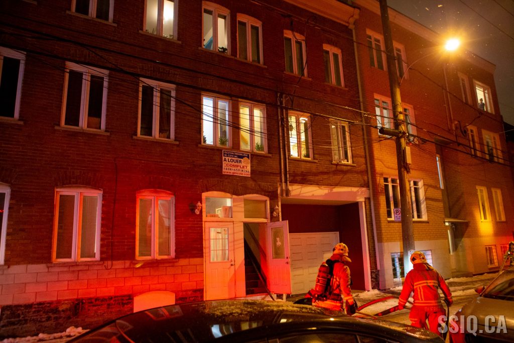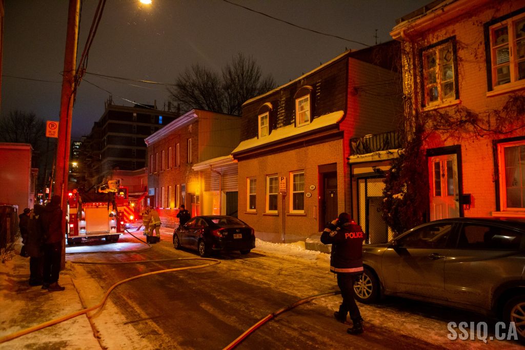 Sur place, l'équipe du 203 se positionne sur la rue du Roi, derrière l'immeuble impliqué, pour établir un premier jet. Les flammes attaquent la structure de bois des balcons et la situation semble de dégrader. Par précaution, le chef Coulombe (142) ordonne une 2e alarme.