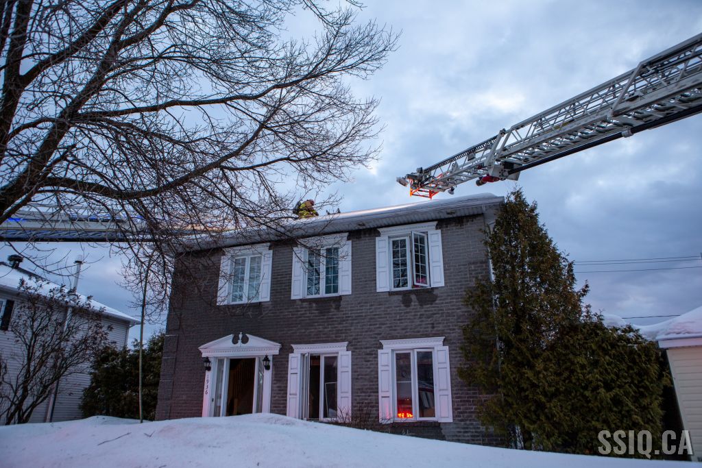 Alors que que les équipes sont en direction, le chef 144 déclare l’intervention nécessaire. La colonne de fumée est visible à distance. Sur place, la 2e alarme sera donnée rapidement. Le feu est éclaté au toit et une attaque agressive est faite pour éteindre le foyer à partir du toit, du 2e étage, et par l'arrière de la résidence.