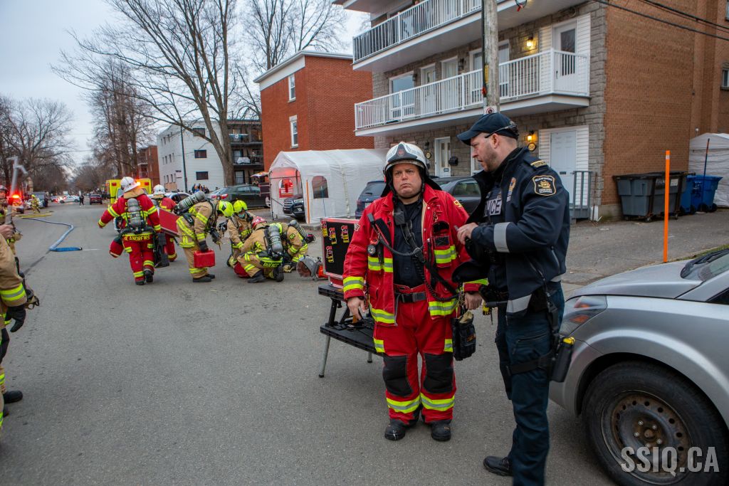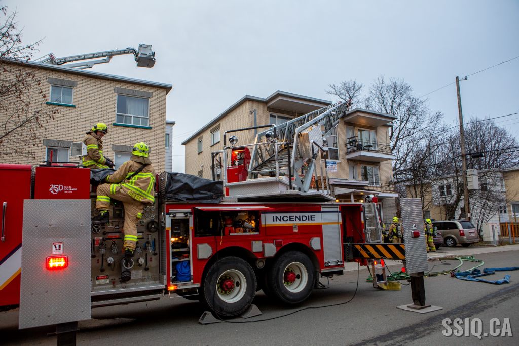 L'appel est logé à la centrale 911 par une résidente de l'endroit. Les détails font mention d'un feu sur une cuisinière. Le superviseur ambulancier est le premier à arriver sur les lieux et confirme la fumée noire visible à l'extérieur et des gens coincés sur un balcon du dernier étage de l'immeuble. Avec ces informations, le chef Savard (123) ordonne la 2e alarme alors que les équipes sont en route vers l'intervention.