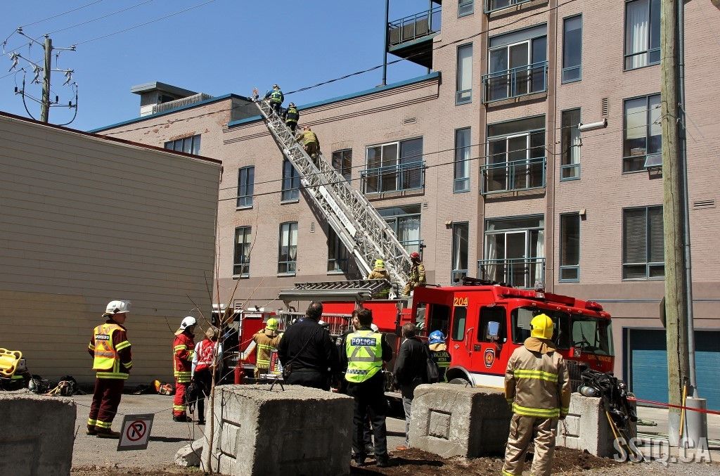 Plusieurs appels indiquent un feu éclaté sur la toiture. En fait, il s'agit d'une terrasse aménagée sur le toit de l'édifice du 274, rue du Parvis.