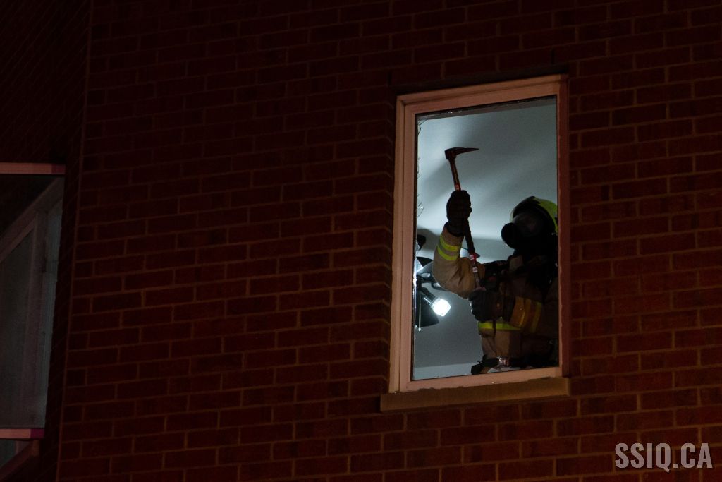 L'appel est logé à la centrale 911 par un résident de l'endroit. Les détails font mention d'une sécheuse à linge en feu dans un appartement du rez-de-chaussée, et qu'il y a possibilité que des gens soient encore présents dans le bâtiment.