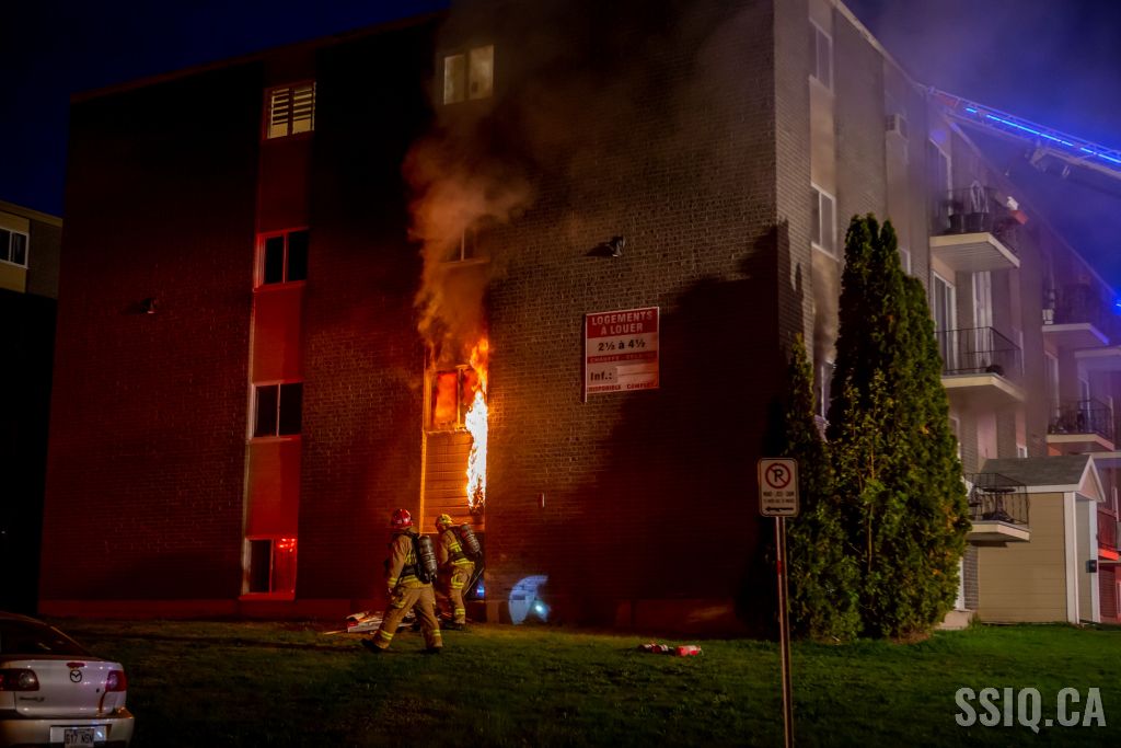 Les flammes sont rabattues rapidement dans l'appartement au sous-sol, cependant les flammes font leur chemin dans la structure par l'assemblage plafond-plancher entre le sous-sol et le premier étage. L'aggravation est imminente, l'intervention monte immédiatement en 2e alarme, et en 3e alarme quelques minutes plus tard.