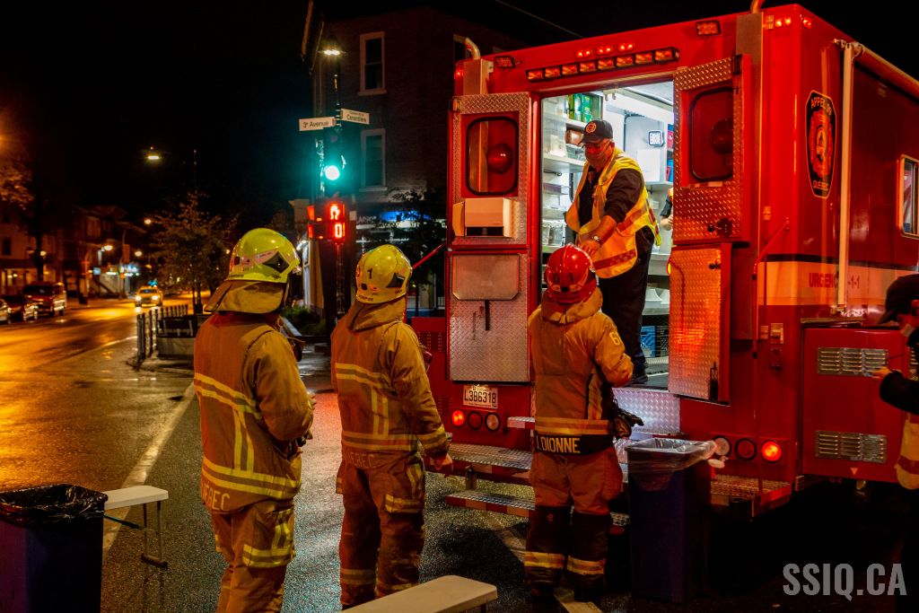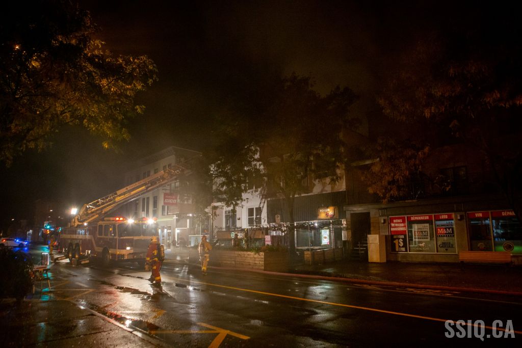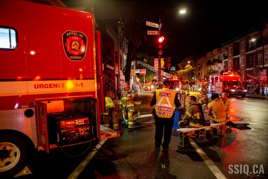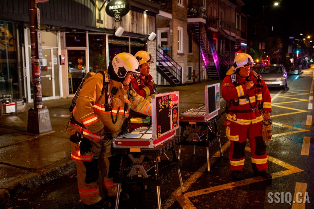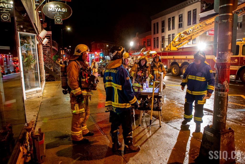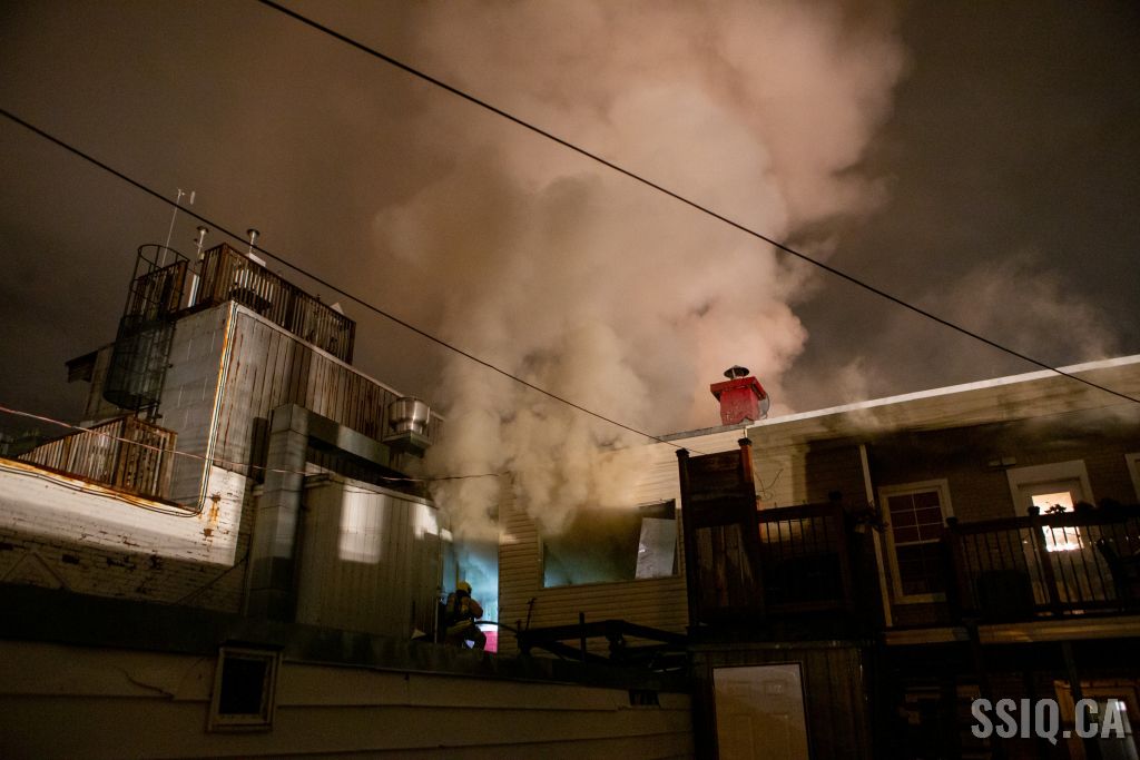 Les équipes procèdent à une attaque rapide. Le feu est dans la structure, dans l'assemblage d'un plancher. Les conditions de fumées se détériorent rapidement, le chef Savard (123) ordonne une 3e alarme.
