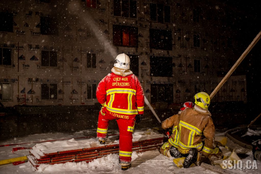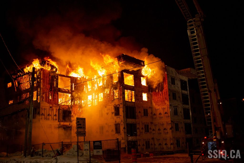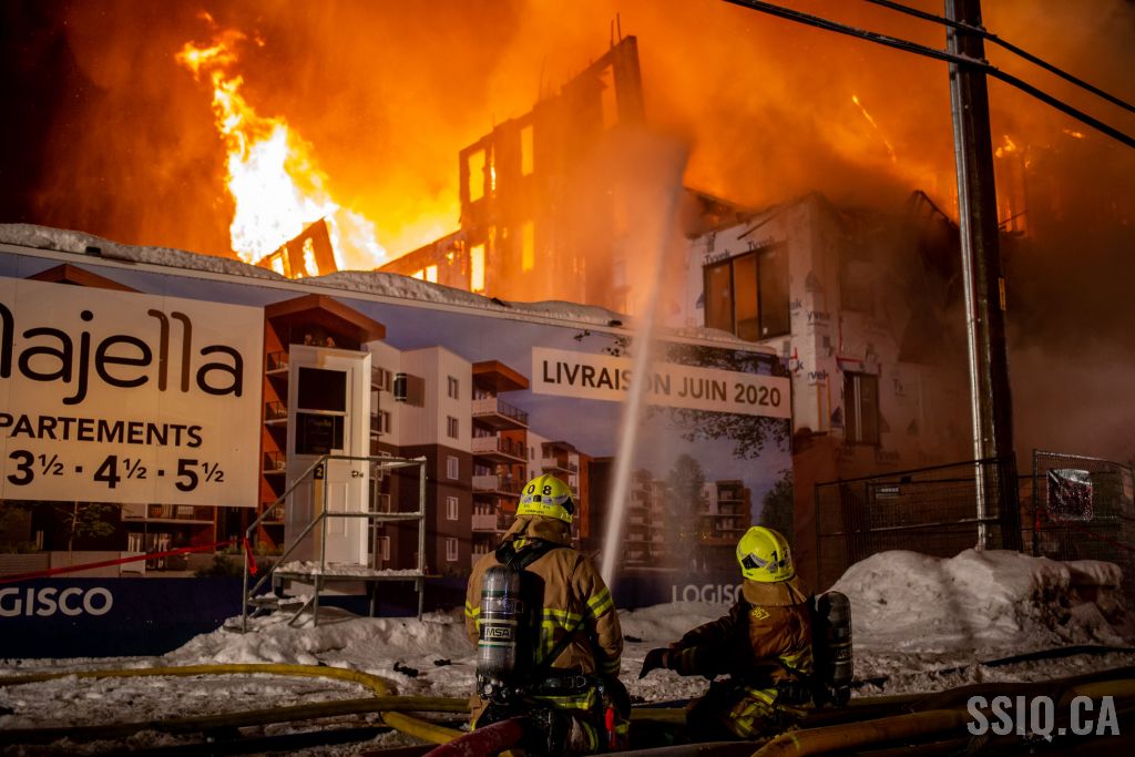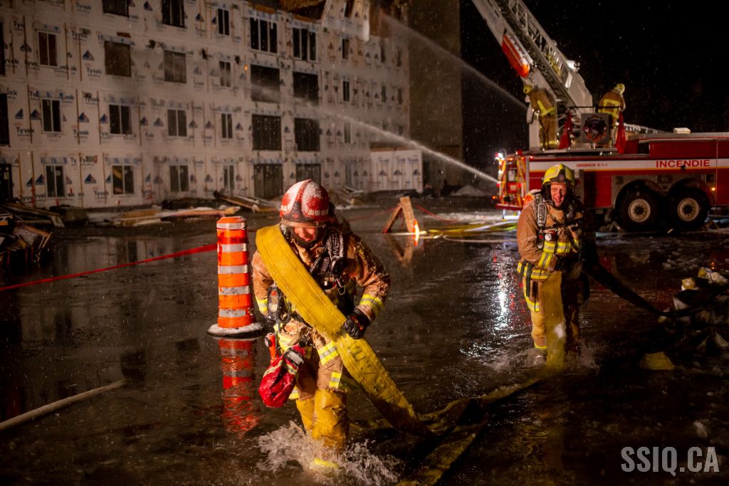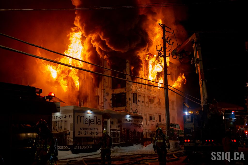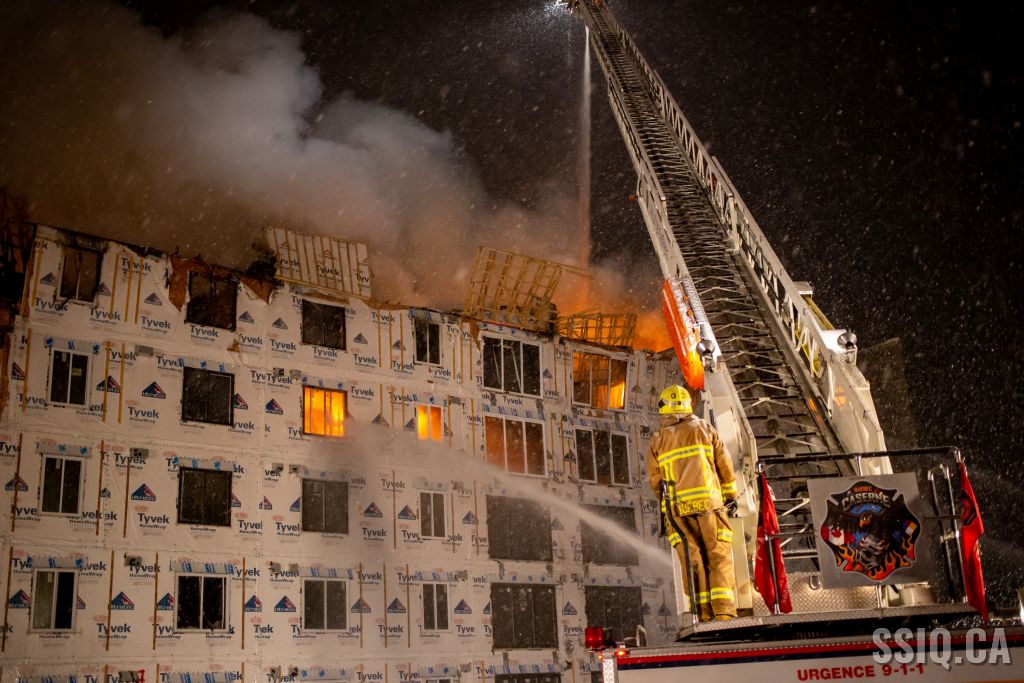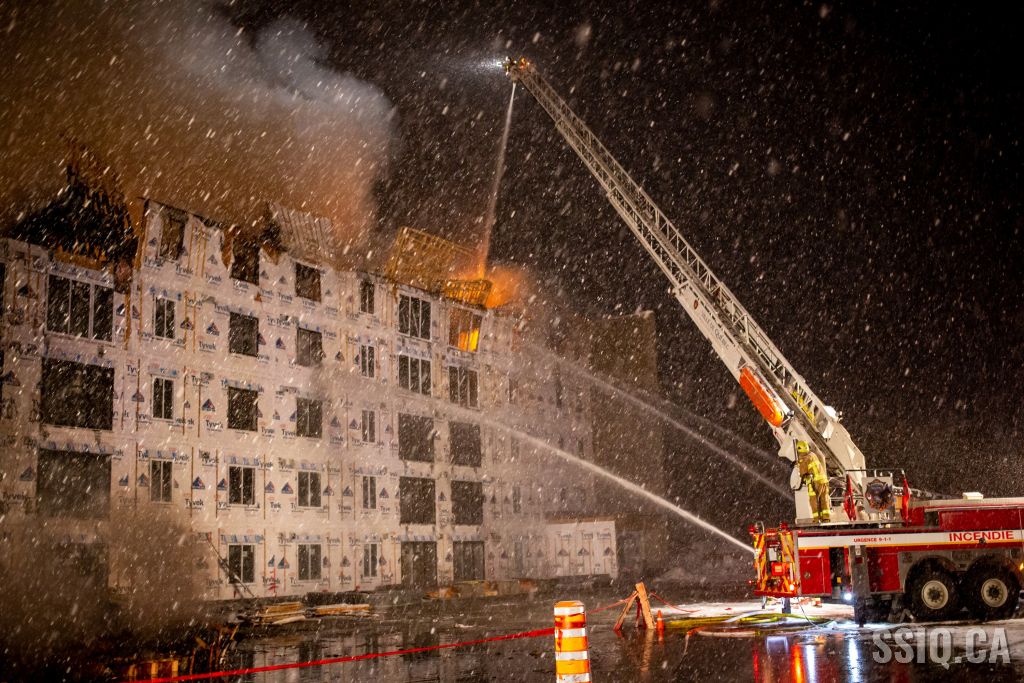 Ce soir, les pompiers ont combattu un incendie d'une extrême violence, dans un immeuble en construction situé au 1420 boulevard Pie-XI Nord, dans l'arrondissement La-Haute-Saint-Charles.