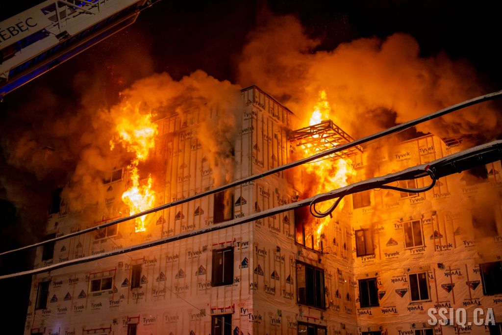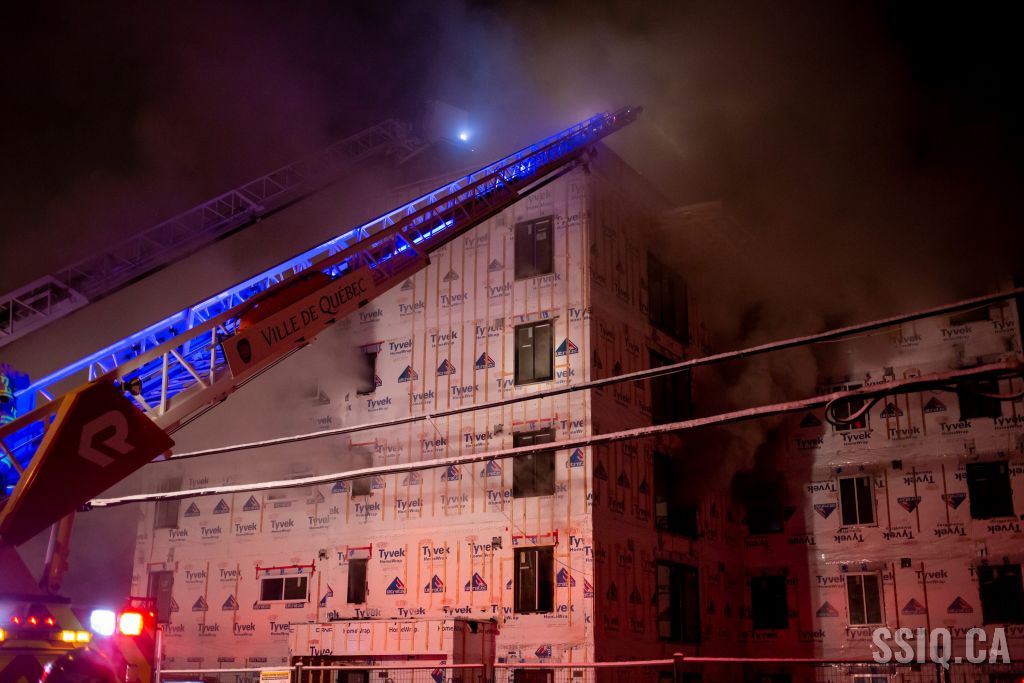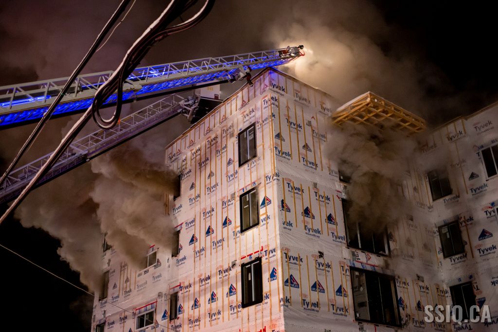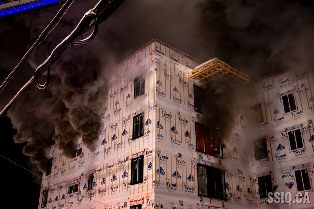 Sur les lieux, les pompiers font face à un incendie sur le mur extérieur de ce bâtiment de 5 étages en construction de bois. Les flammes sont rabattues rapidement à l'aide d'un jet de 2 1/2 pouces. Malheureusement, les flammes ont le temps de faire leur chemin à l'intérieur de la structure.
