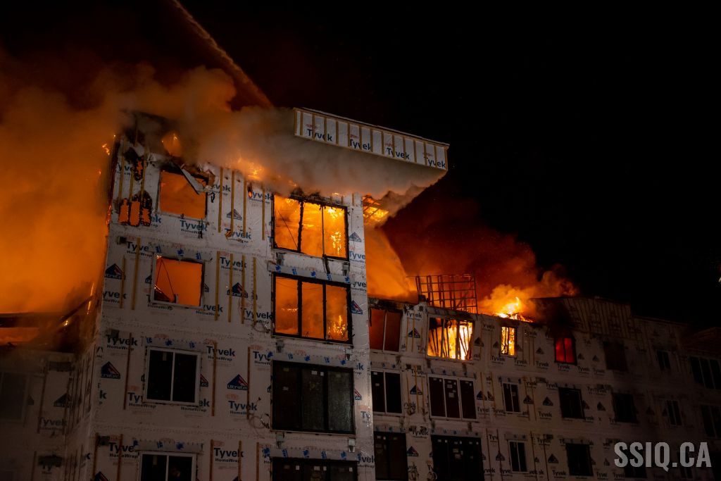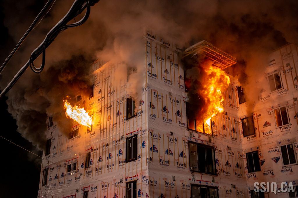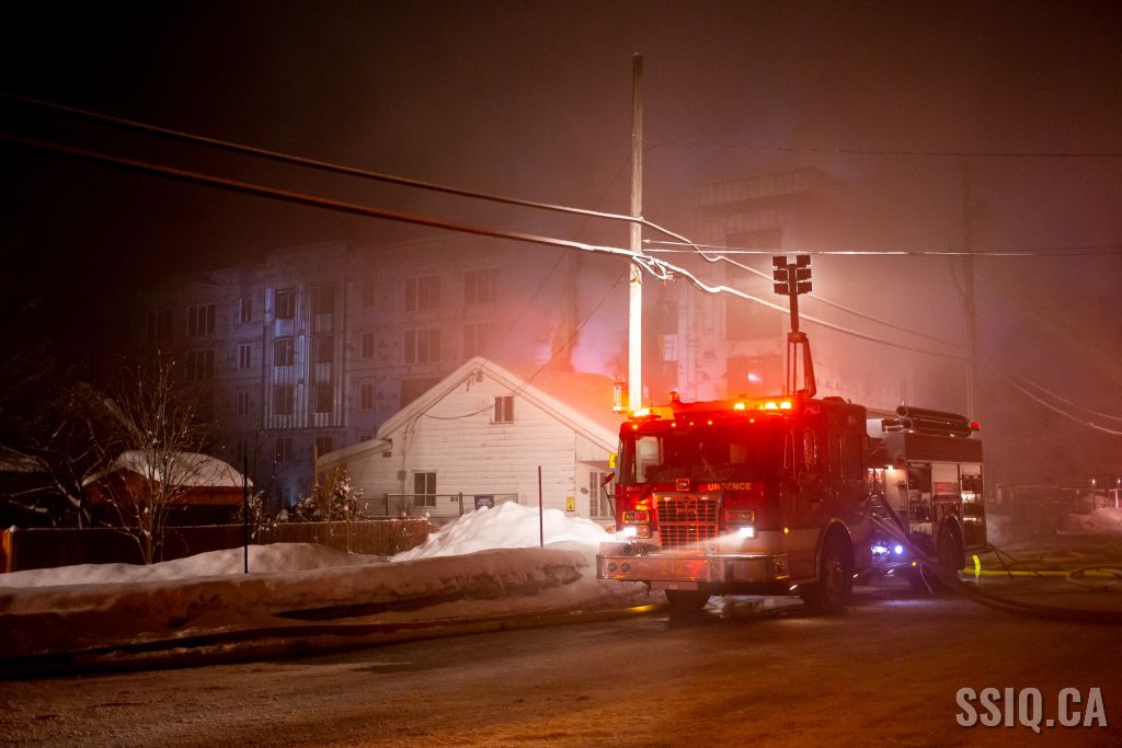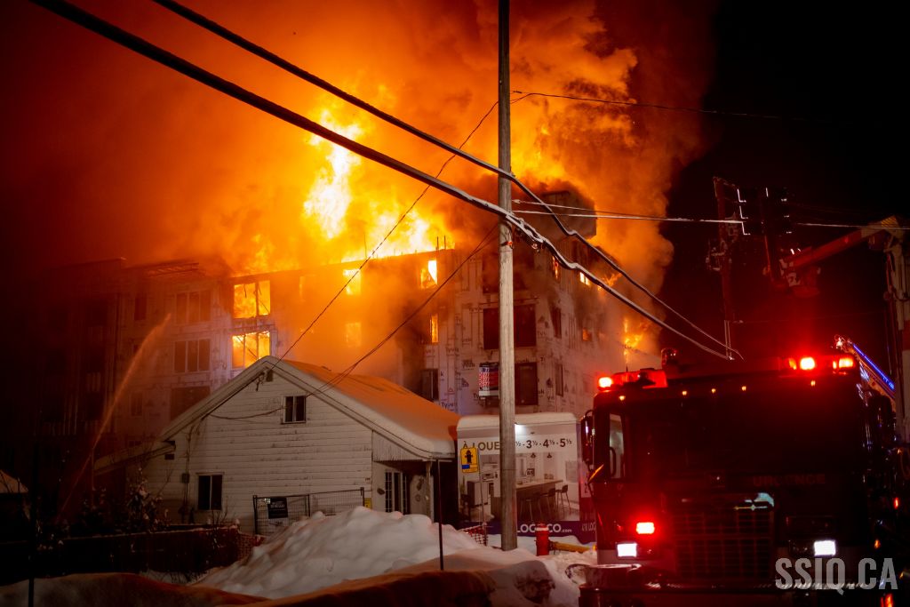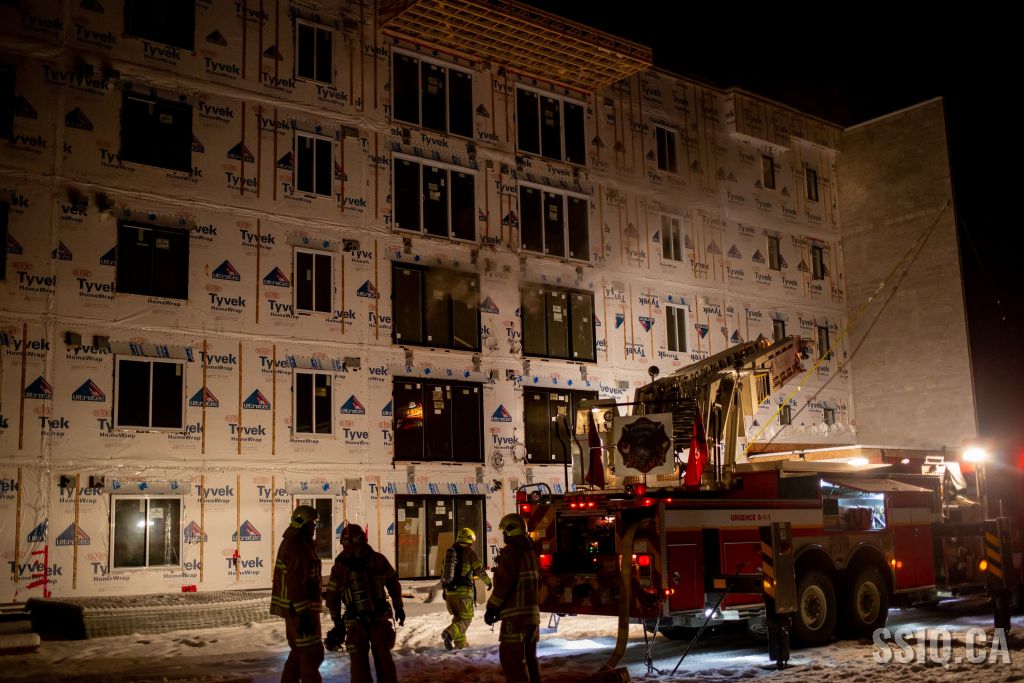 Sur les lieux, les pompiers font face à un incendie sur le mur extérieur de ce bâtiment de 5 étages en construction de bois. Les flammes sont rabattues rapidement à l'aide d'un jet de 2 1/2 pouces. Malheureusement, les flammes ont le temps de faire leur chemin à l'intérieur de la structure.