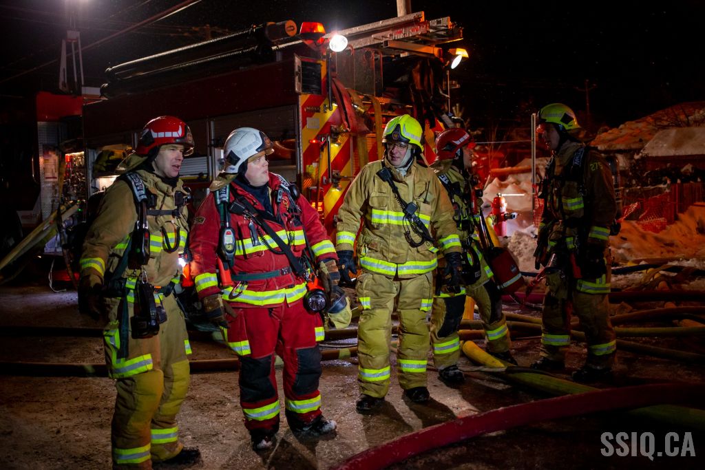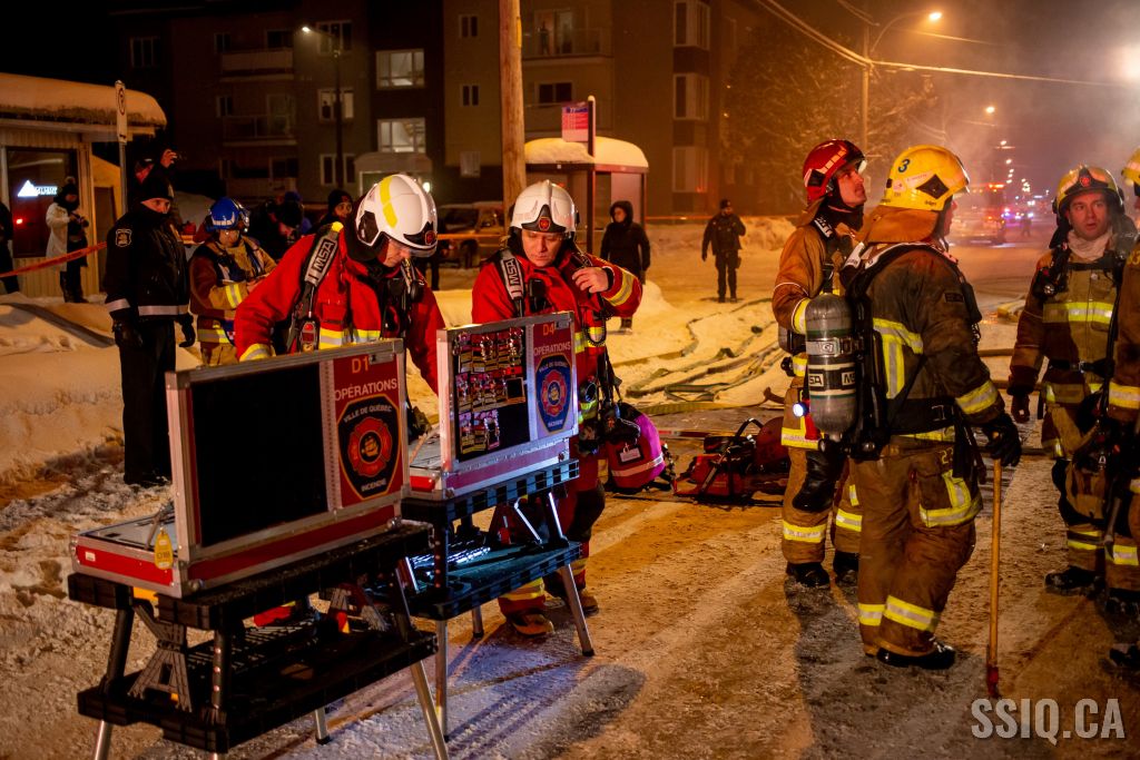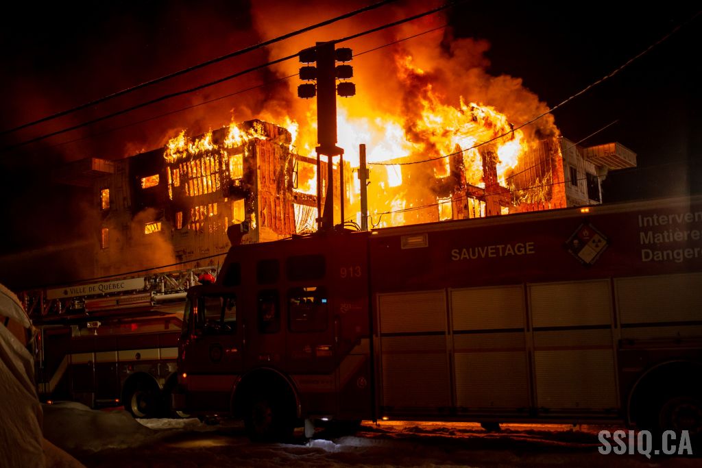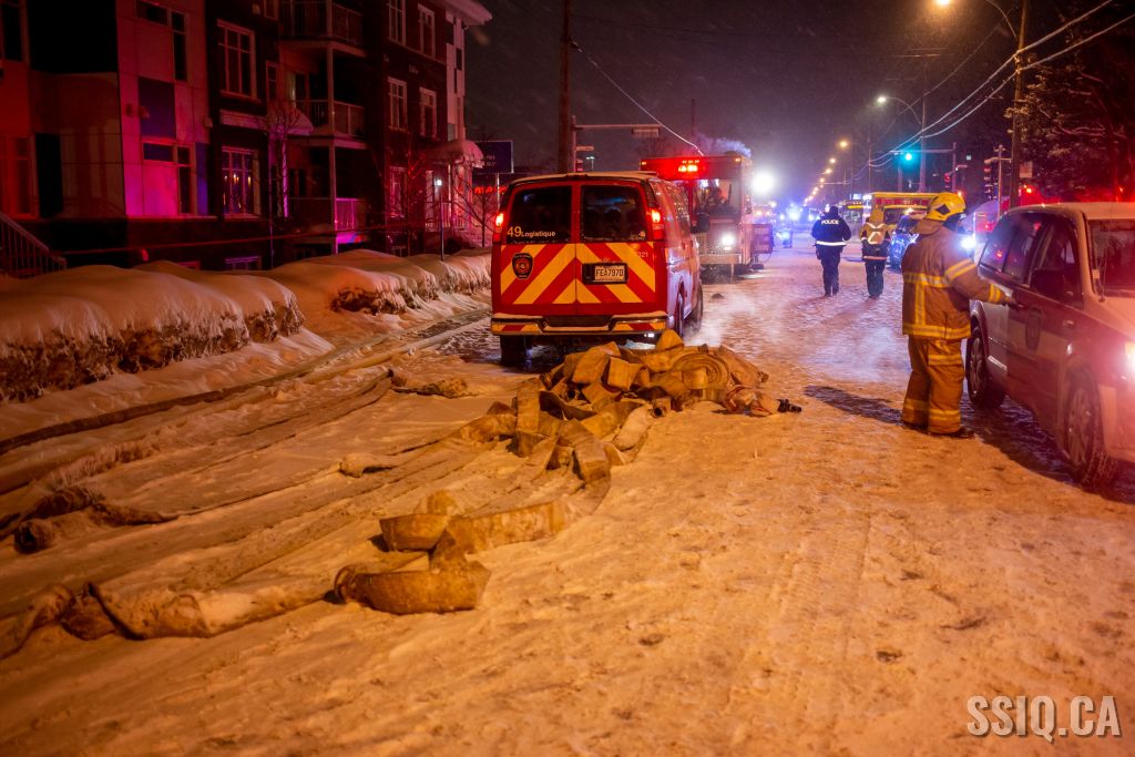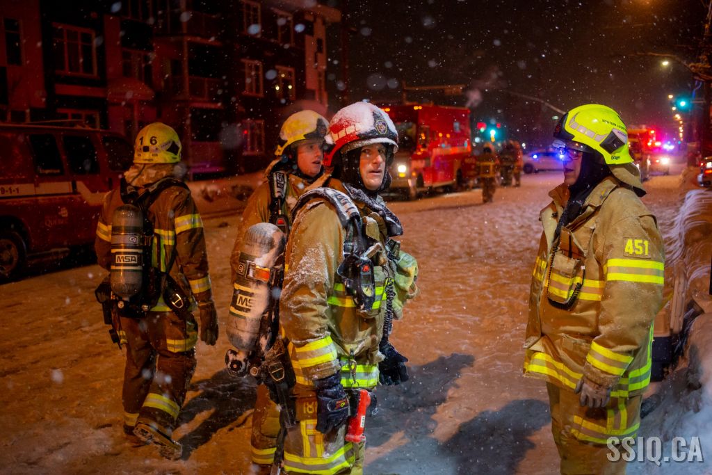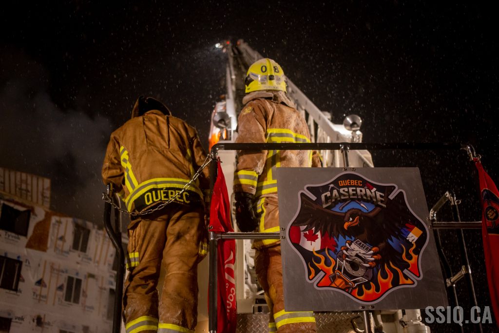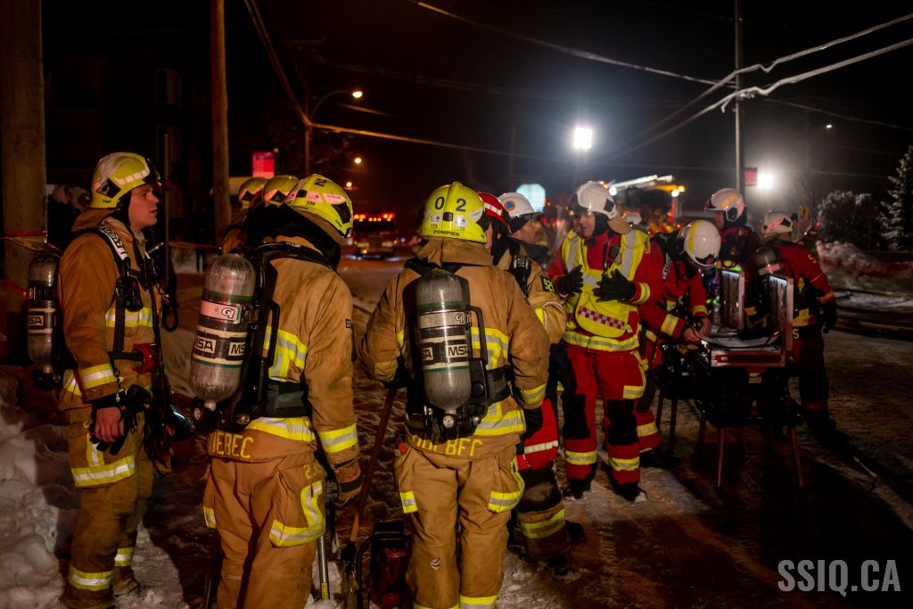 Les équipes entrent à l'intérieur pour attaquer les flammes, mais le constat est évident. La structure ajourée permet la propagation des flammes et des fumées très rapidement vers les étages supérieurs. La 3e alarme est demandée et un retrait stratégique est ordonné aux équipes afin d'évacuer rapidement le bâtiment.
