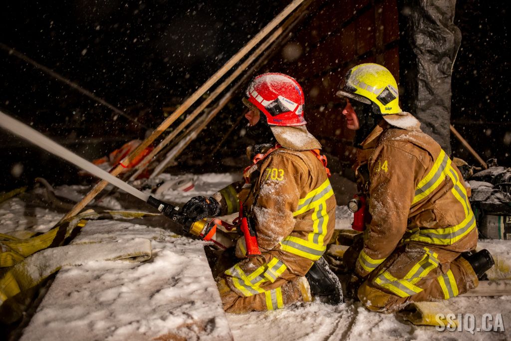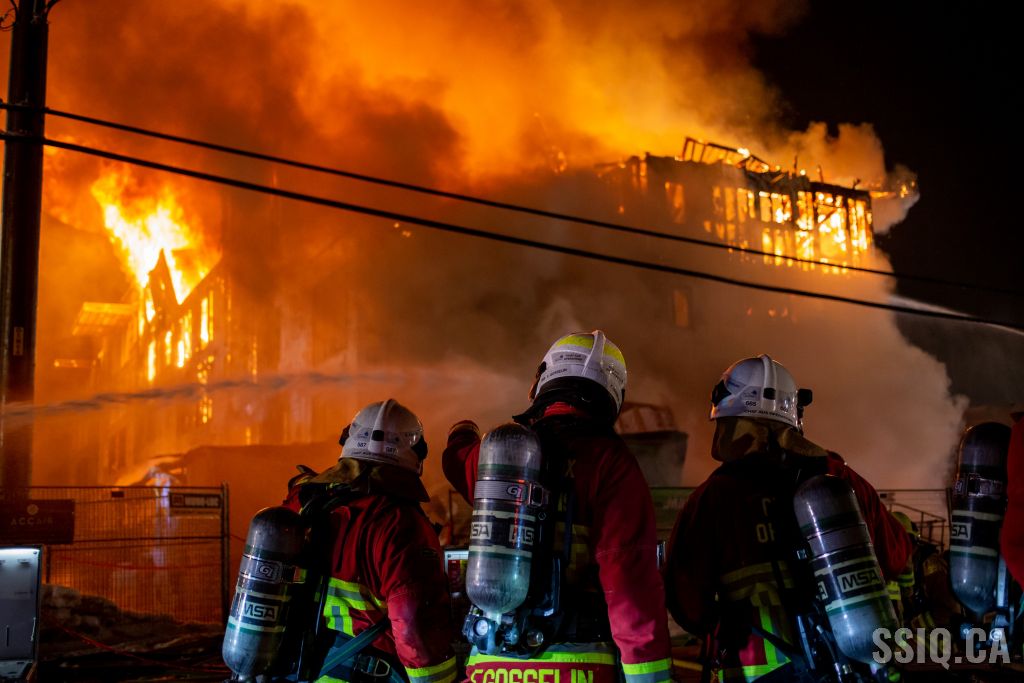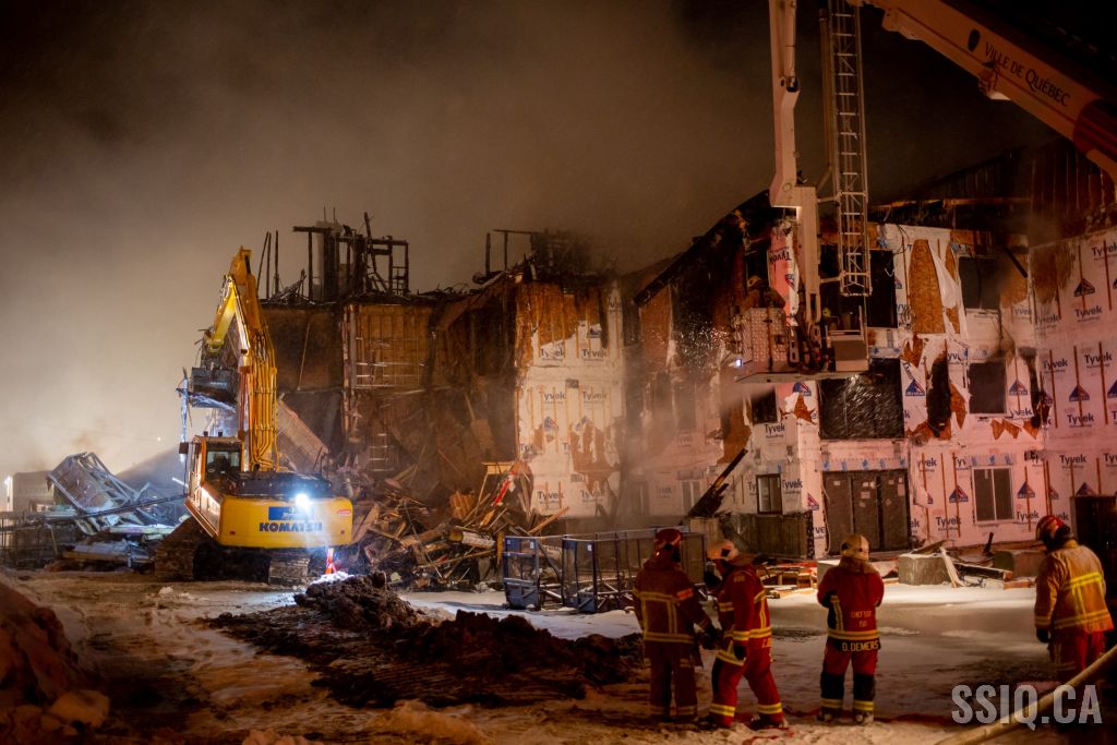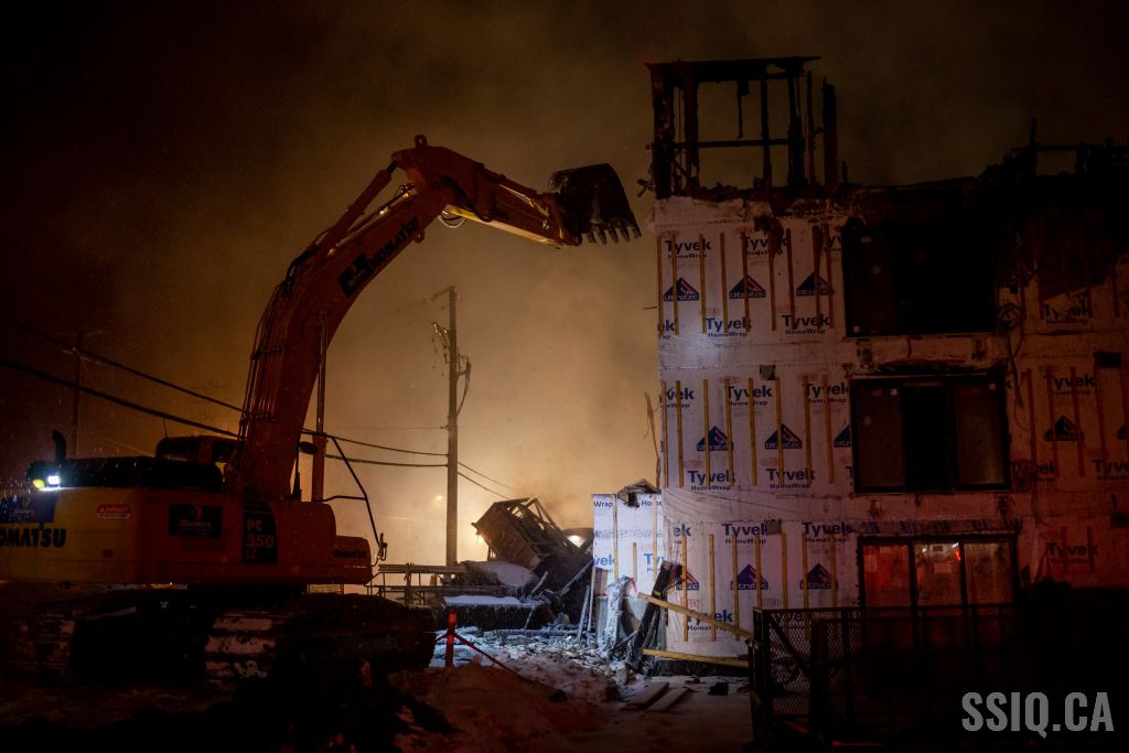 Le feu joue à cache-cache avec les pompiers en éclatant tantôt à gauche, et tantôt à droite. La structure s'effondre partiellement à différents endroits. Les opérations d'extinction sont longues et une pelle mécanique sera demandée sur place afin de détruire la structure. Cette démolition permettra un accès plus facile aux derniers foyers d'incendie.