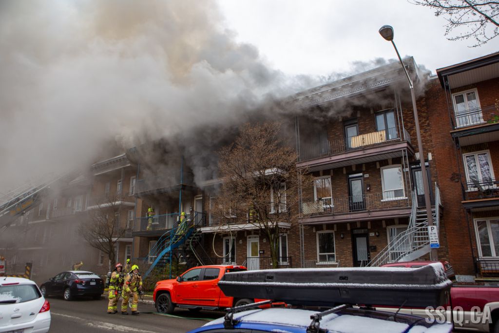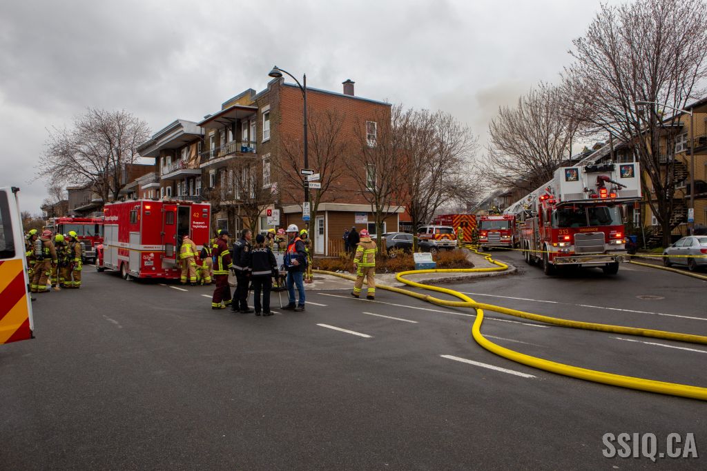 L'appel est logé à la centrale 911 par un résident de l'endroit. Les détails font mention de feu sur le balcon arrière chez son voisin. La fumée est dense et les flammes attaquent les murs.