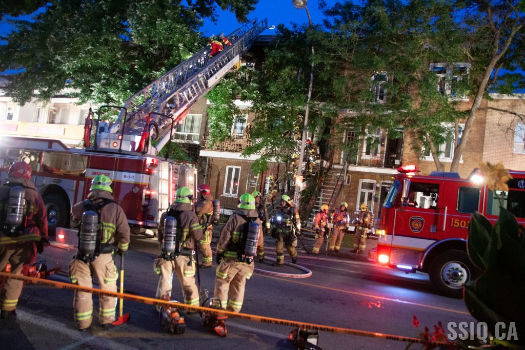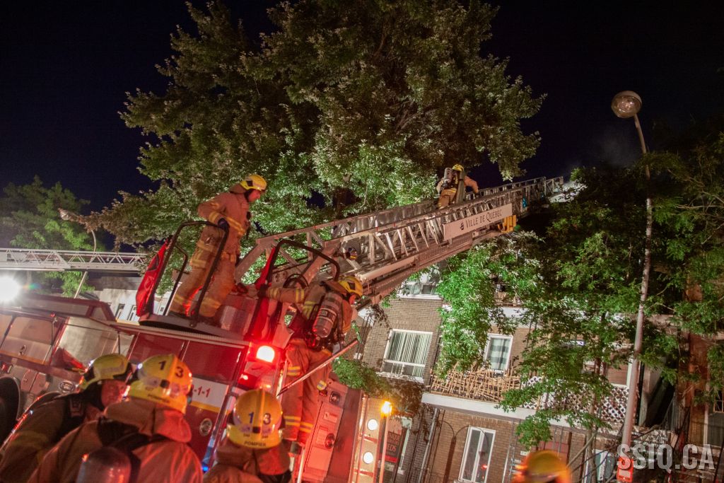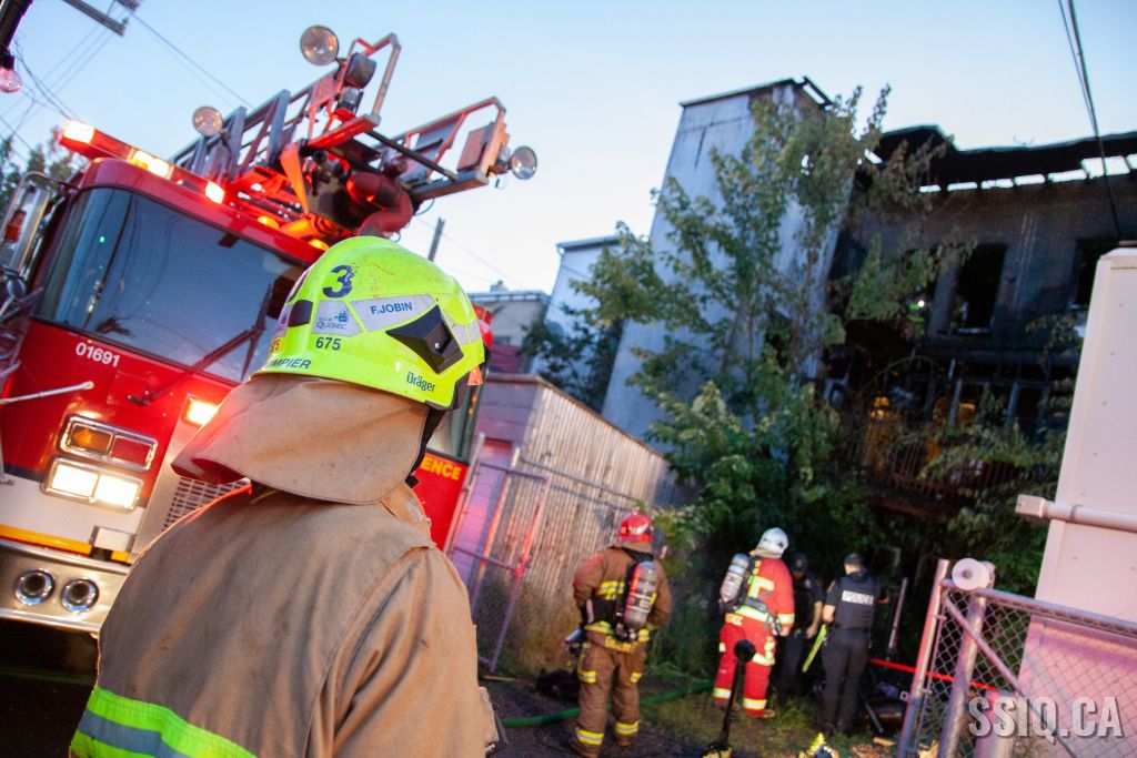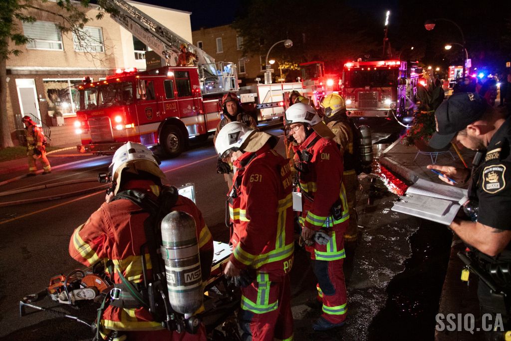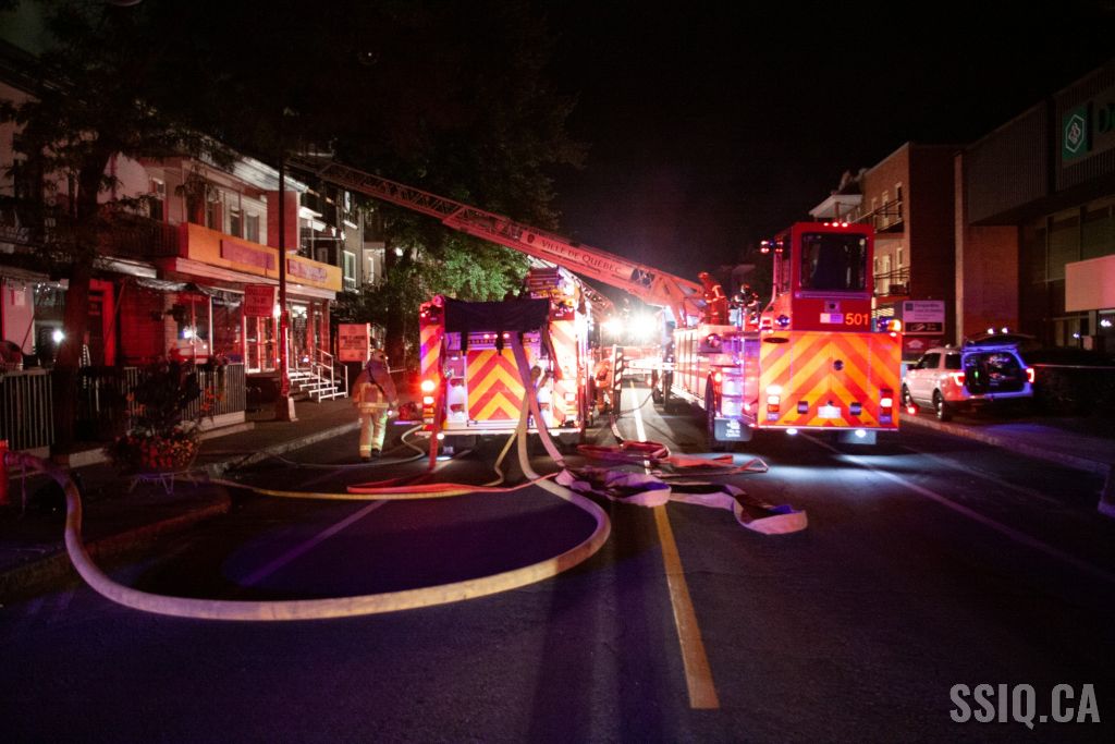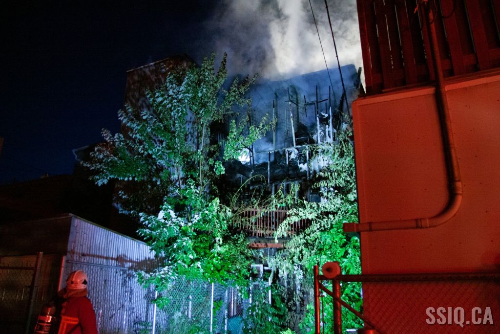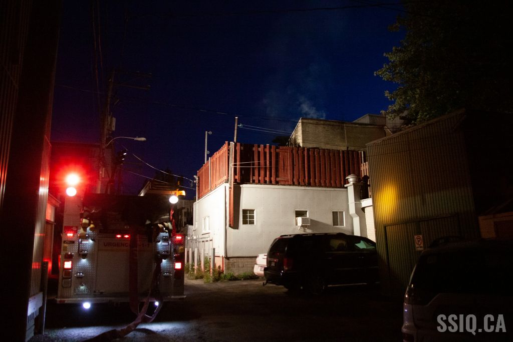 L'utilisation des jets a permis de rabaisser rapidement les flammes derrière le bâtiment, cependant le feu avait une longueur d'avance et a fait son chemin par la structure pour atteindre l'entretoit de l'immeuble. C'est alors que les 3e et 4e alarmes ont été demandées.