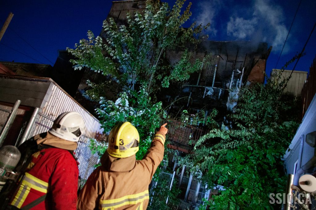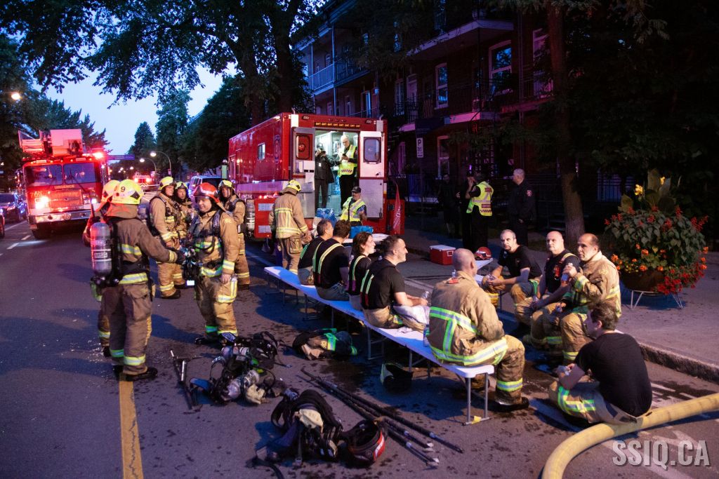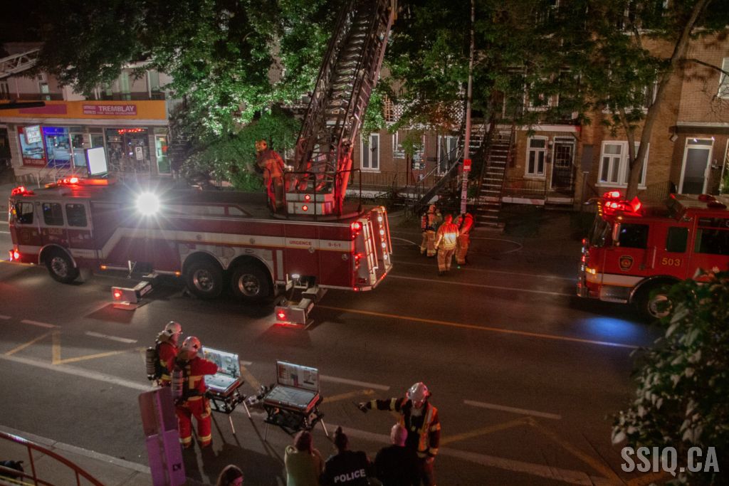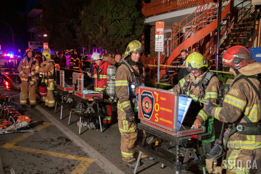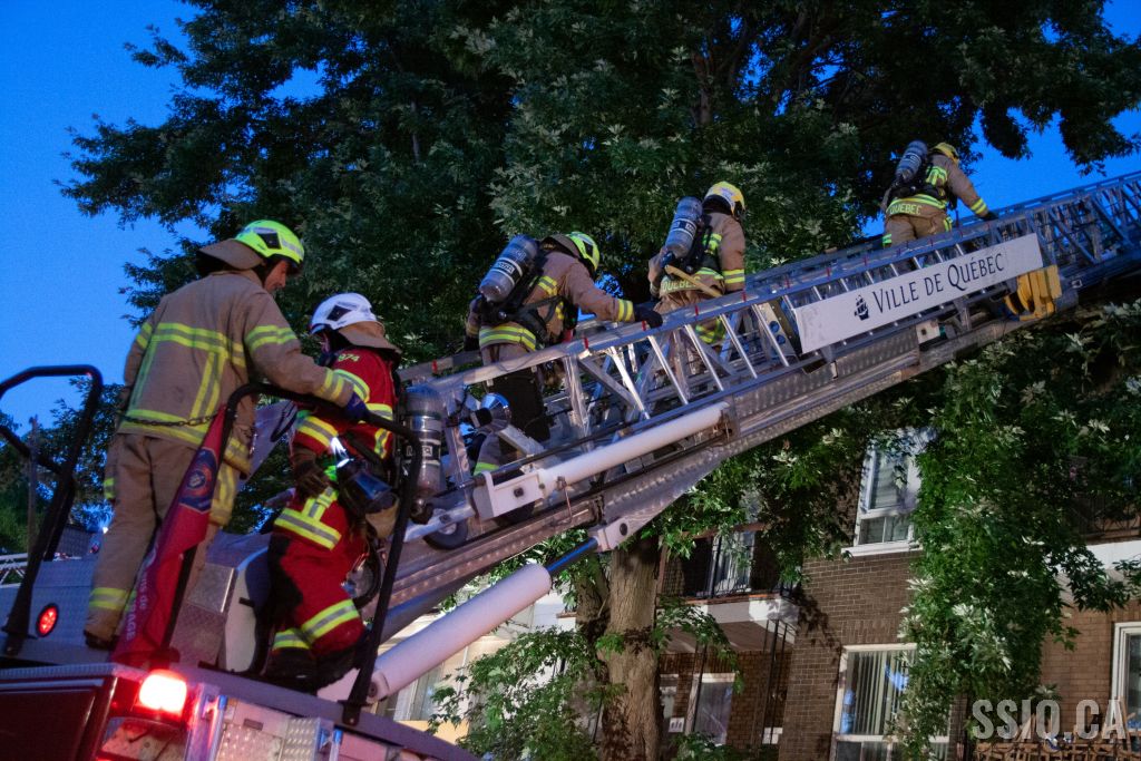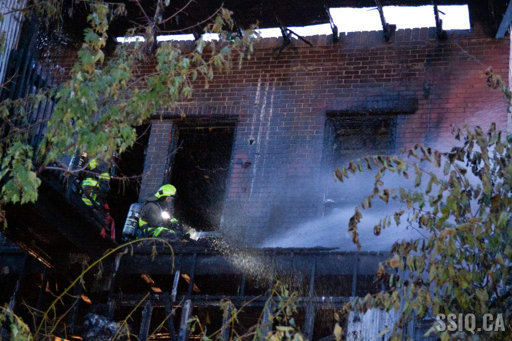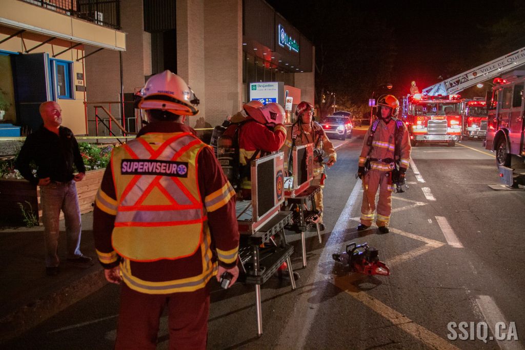 L'utilisation des jets a permis de rabaisser rapidement les flammes derrière le bâtiment, cependant le feu avait une longueur d'avance et a fait son chemin par la structure pour atteindre l'entretoit de l'immeuble. C'est alors que les 3e et 4e alarmes ont été demandées.