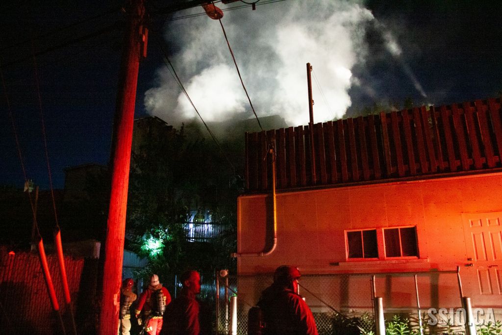 Sur les lieux, l'officier du 902 a confirmé la colonne de fumée visible à l'avant du bâtiment. Alors que l'équipe du 302 était en vérification derrière l'immeuble, la situation c'est confirmée; le hangar arrière était entièrement embrasé. L'intervention étant nécessaire, elle montera en 2e alarme.