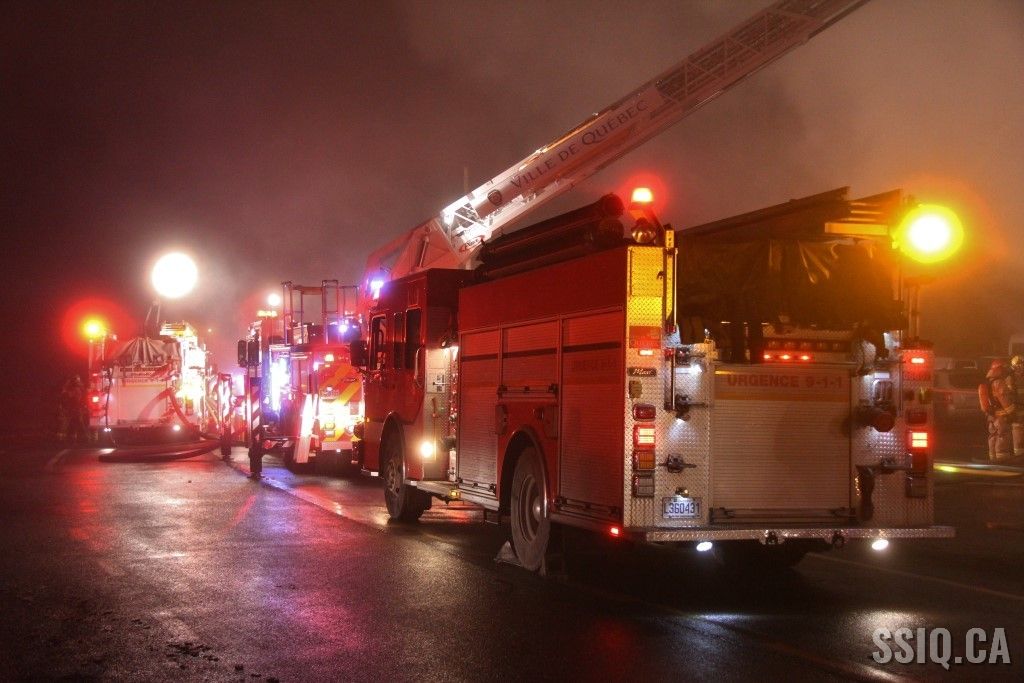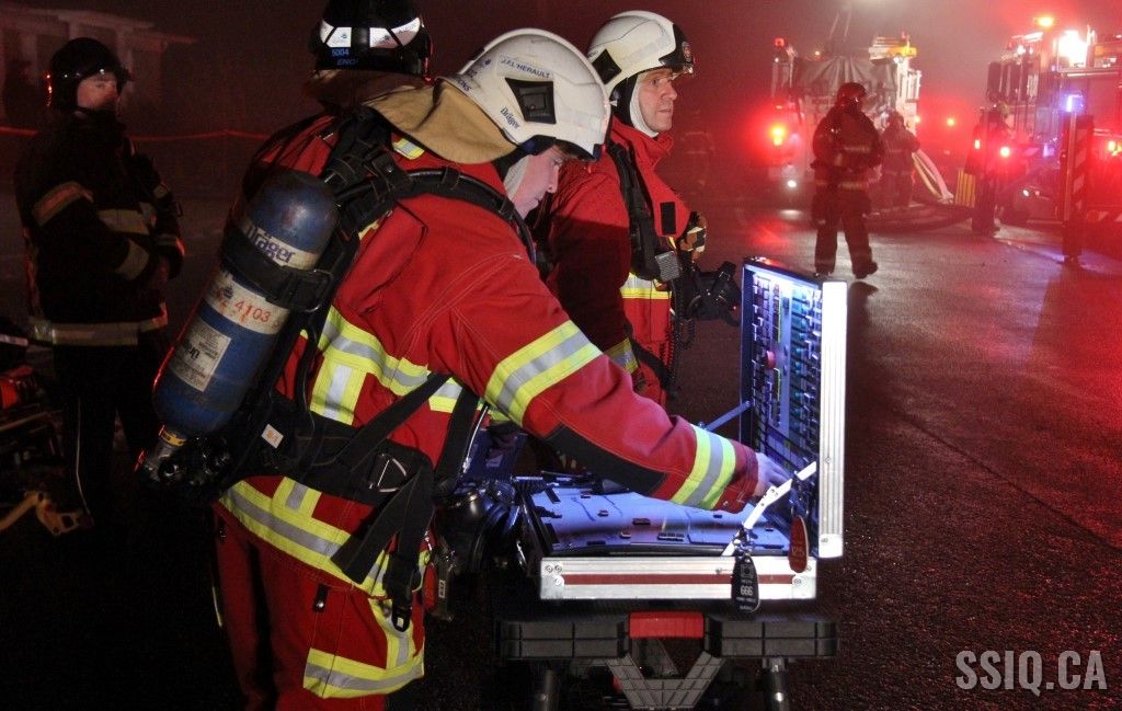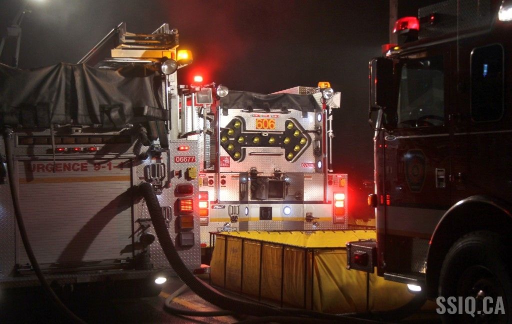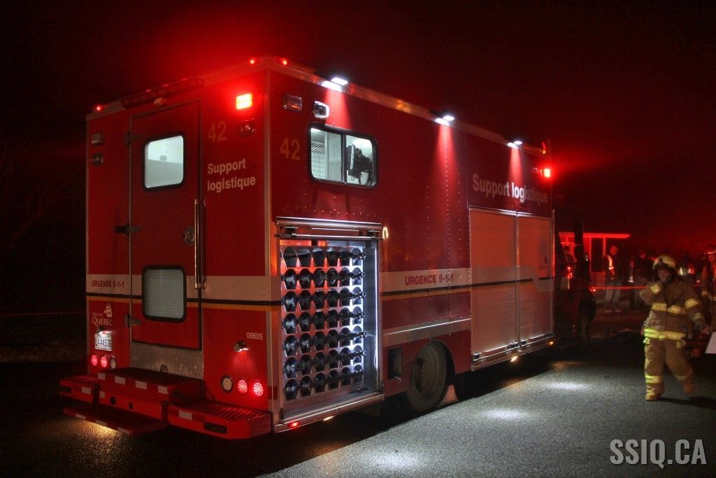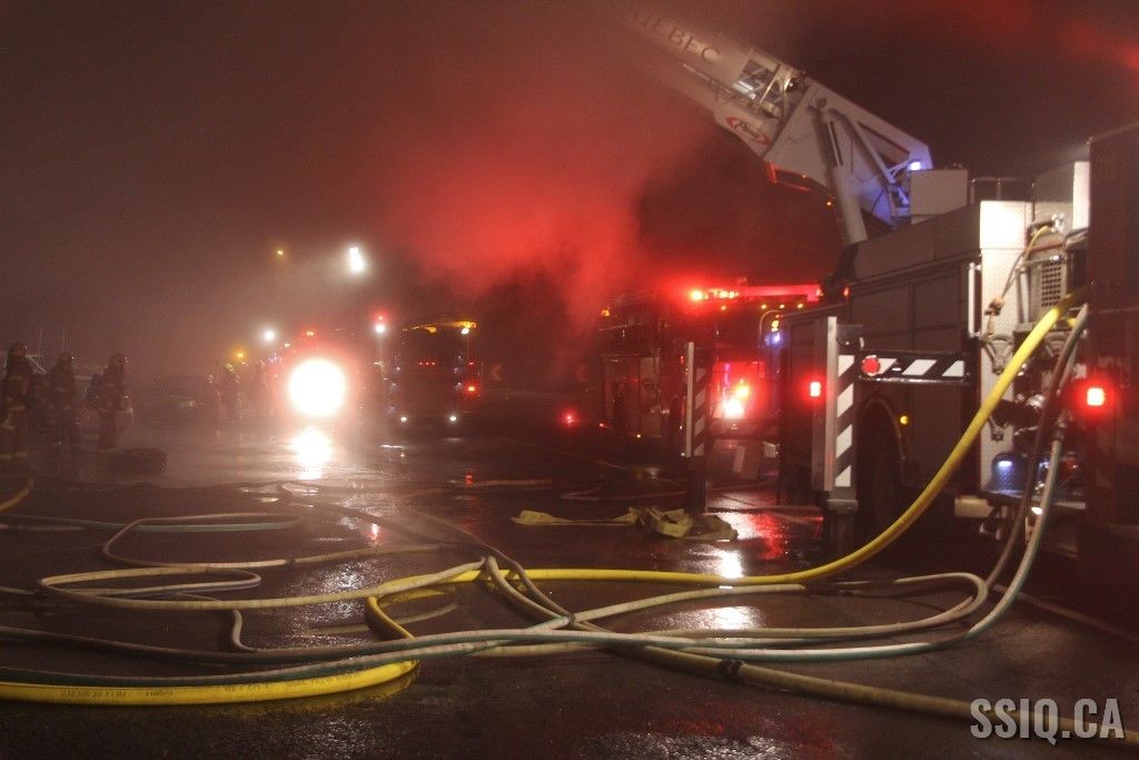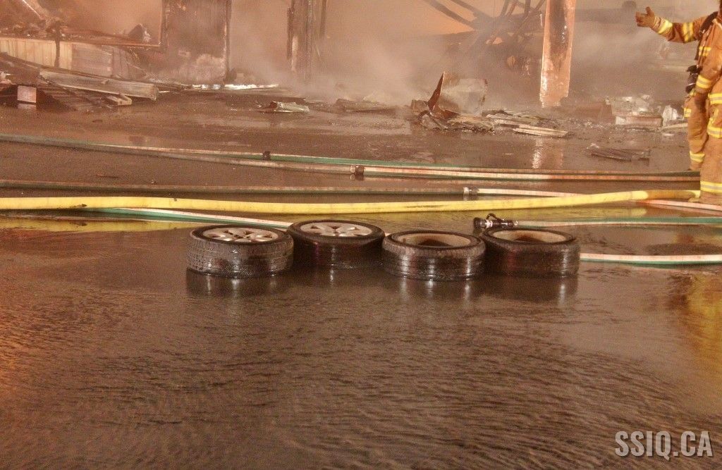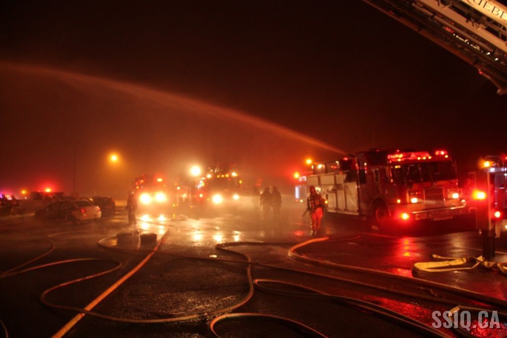 L’officier du 311 arrive sur les lieux et corrobore les informations déjà données sur les ondes. De nombreux véhicules sont dans le garage et brulent avec violence. Comme l’édifice se trouve dans une zone sèche, une source d’alimentation en eau avec piscines est nécessaire. Dès le début de l’intervention, il était clair que le bâtiment serait une perte totale. Les équipes travaillent en mode défensive étant donné les dangers d’explosion et aussi d’effondrement de la structure. Une pelle mécanique est demandée sur les lieux pour abattre ce qui reste des murs. On ne déplore heureusement aucun blessé. Fait à noter, un brouillard très épais recouvrait toute la région, ce qui rendait problématique l’approche des véhicules d’urgence.