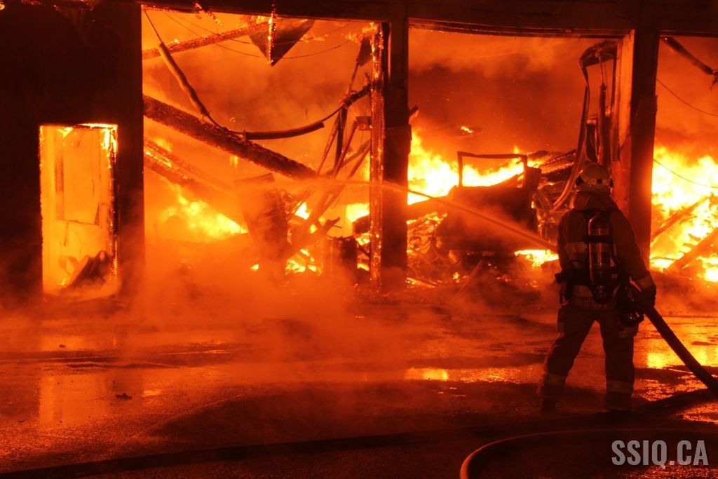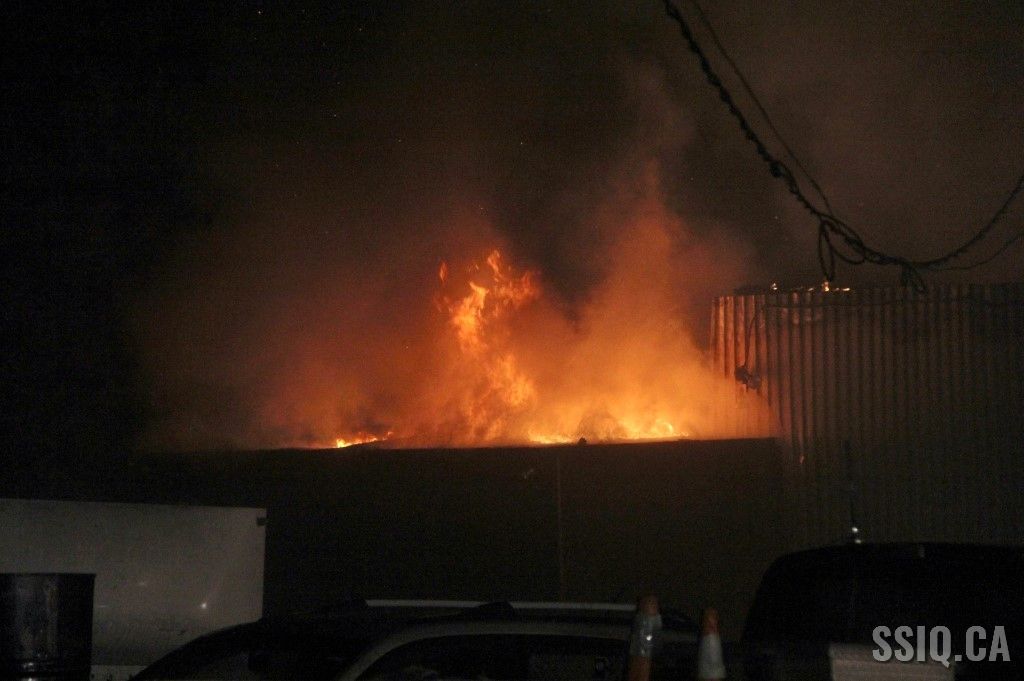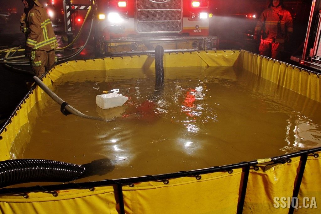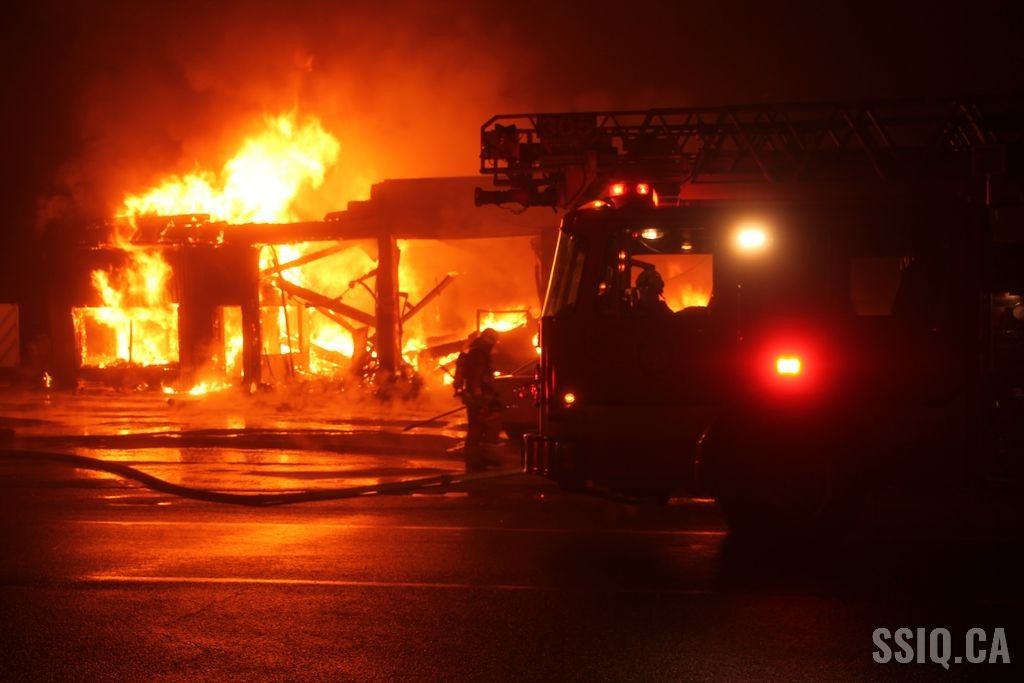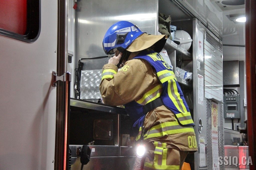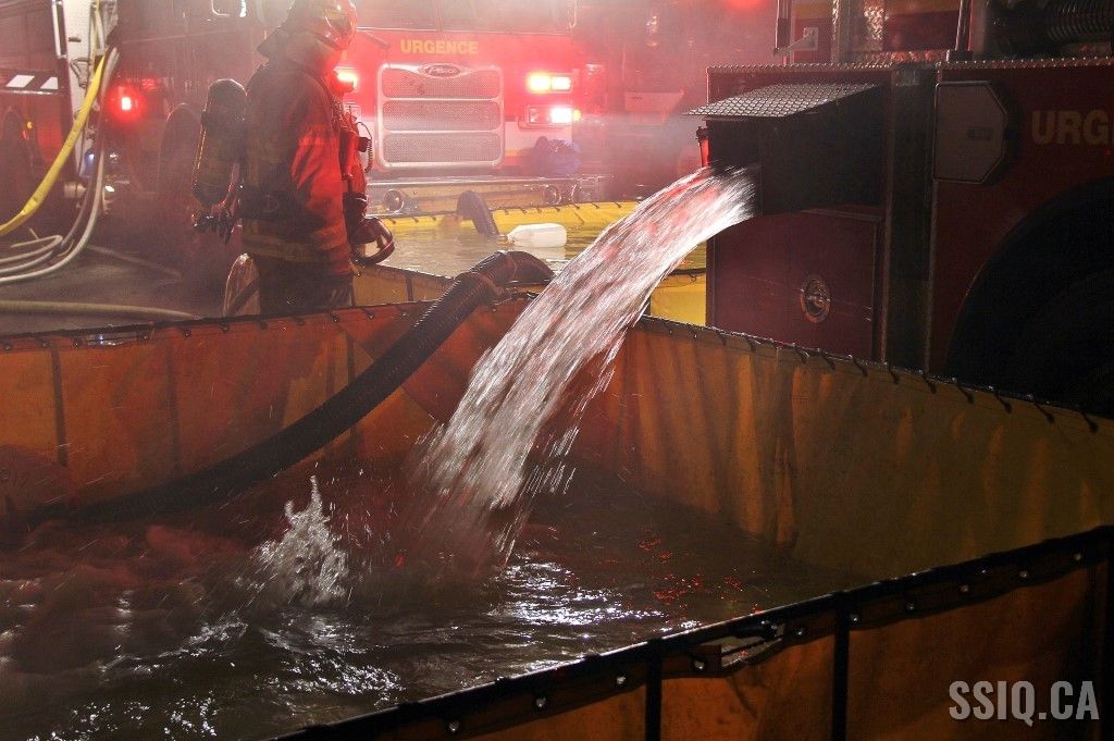L’officier du 311 arrive sur les lieux et corrobore les informations déjà données sur les ondes. De nombreux véhicules sont dans le garage et brulent avec violence. Comme l’édifice se trouve dans une zone sèche, une source d’alimentation en eau avec piscines est nécessaire. Dès le début de l’intervention, il était clair que le bâtiment serait une perte totale. Les équipes travaillent en mode défensive étant donné les dangers d’explosion et aussi d’effondrement de la structure. Une pelle mécanique est demandée sur les lieux pour abattre ce qui reste des murs. On ne déplore heureusement aucun blessé. Fait à noter, un brouillard très épais recouvrait toute la région, ce qui rendait problématique l’approche des véhicules d’urgence.