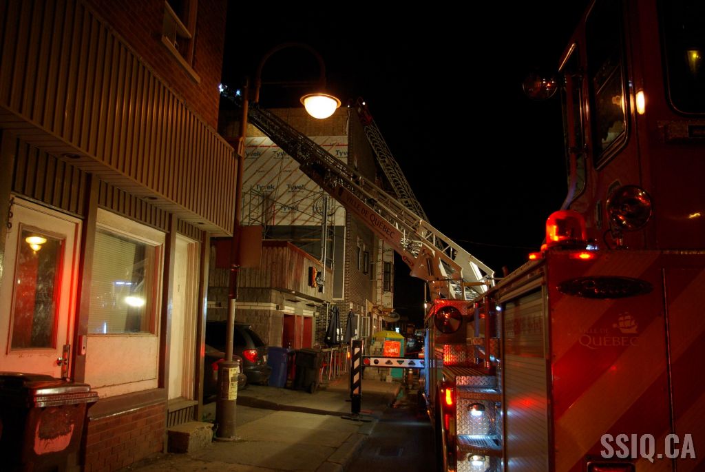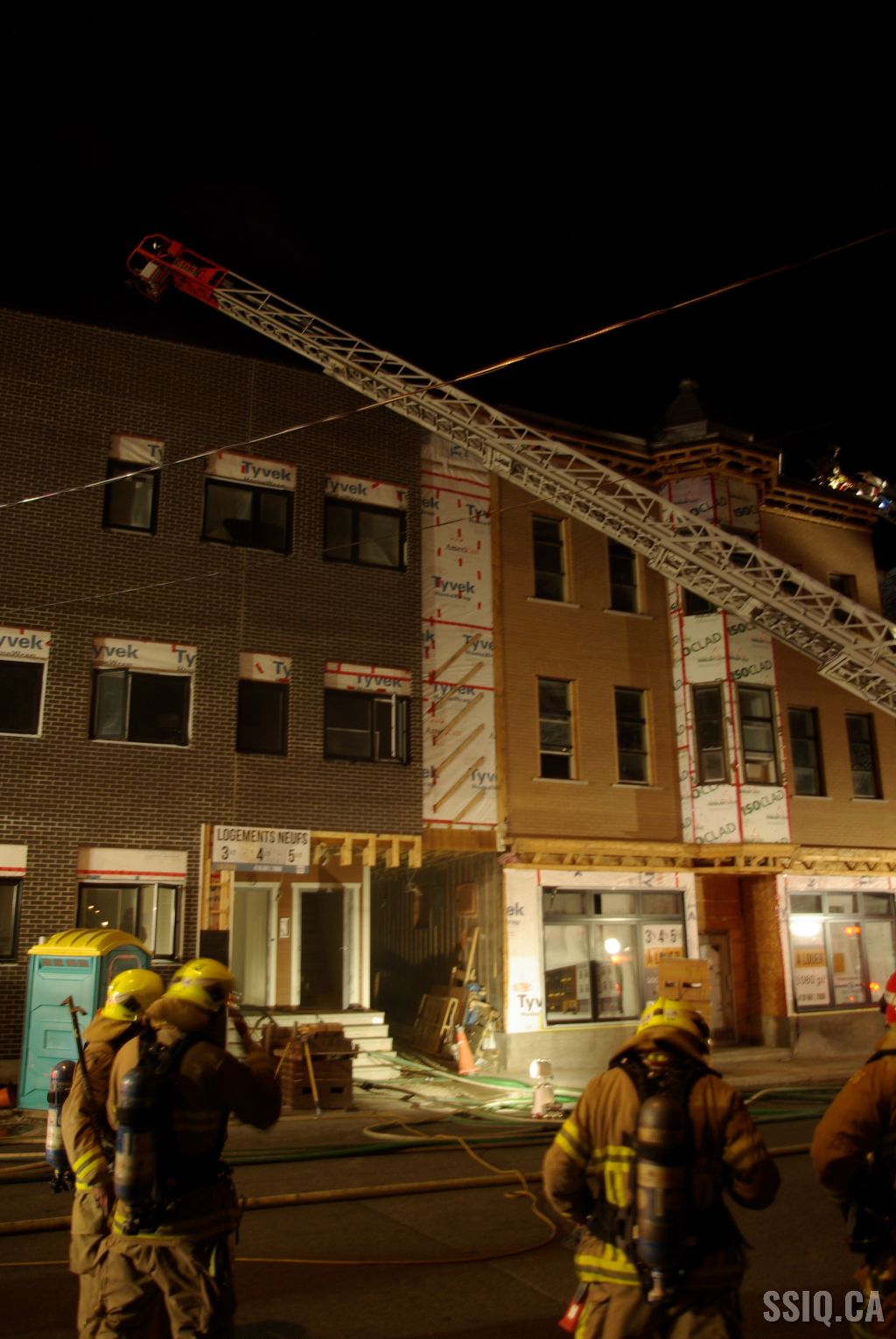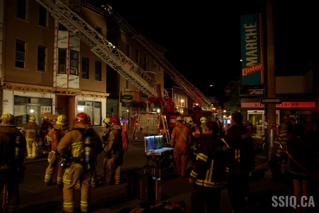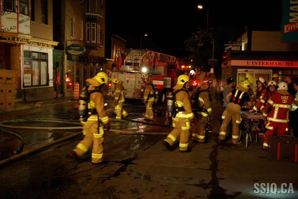 Le 203 arrivé le premier confirme la présence d'une épaisse fumée au premier étage, le feu faisant rage au sous-sol. Toutefois, en raison de la salle électrique et de nombreux équipements sous tension, le combat est difficile. Hydro-Québec est demandé en urgence.
