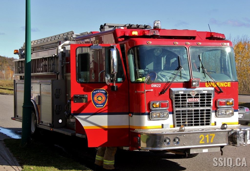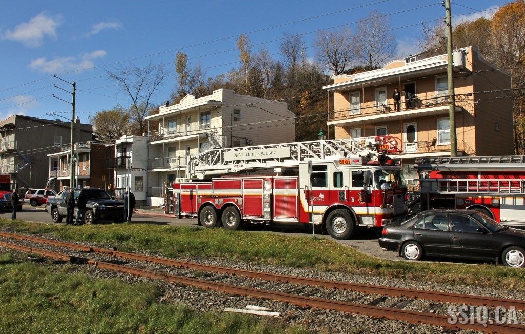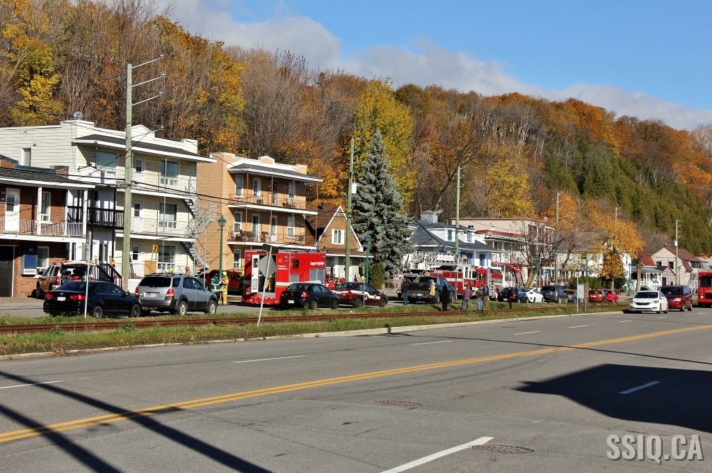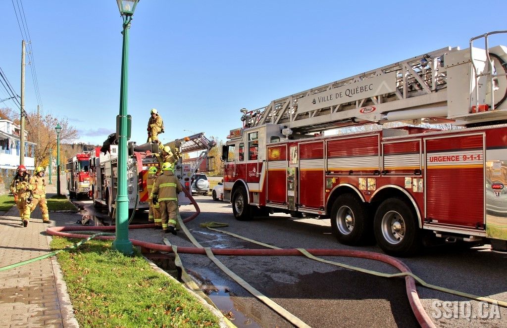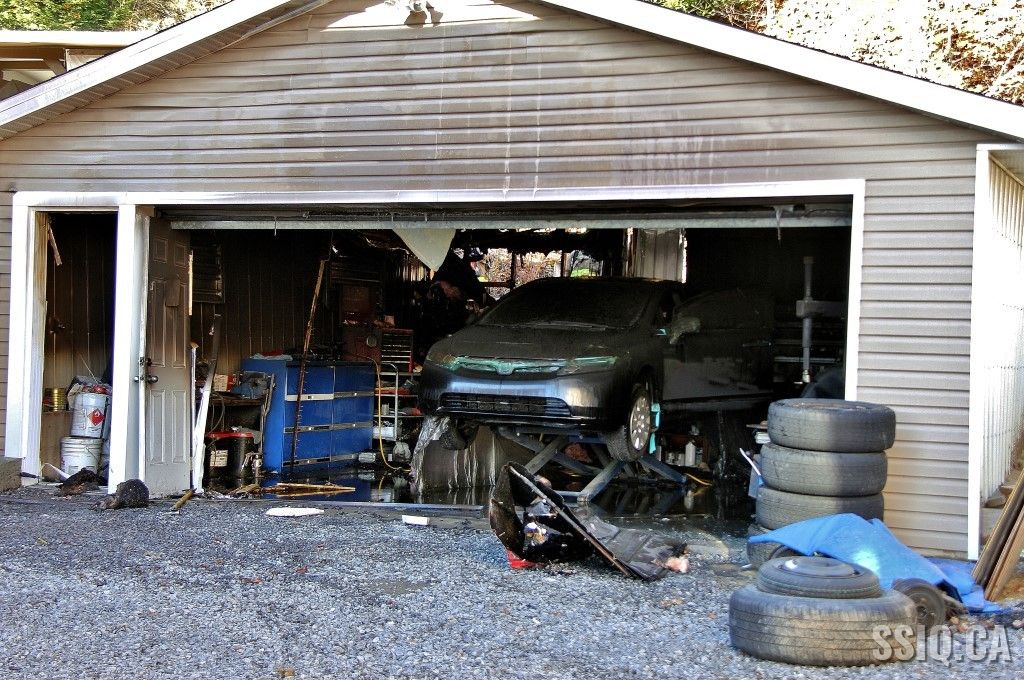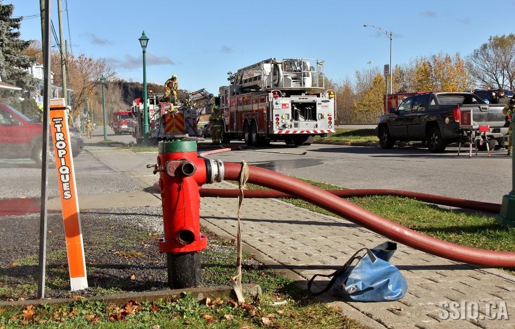 À l'arrivée de la caserne # 7, les flammes sortent par l'arrière du garage. Plusieurs jets sont mis en opération et les flammes sont rabattues assez rapidement sans propagation à d'autres structures.