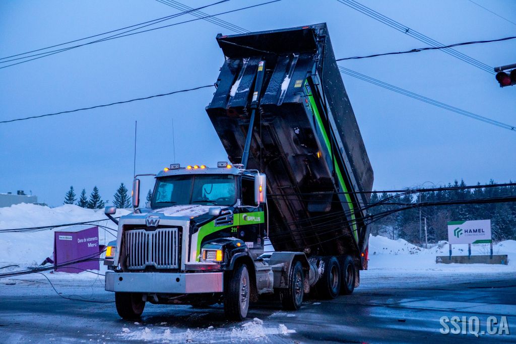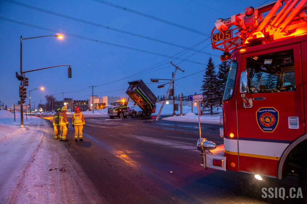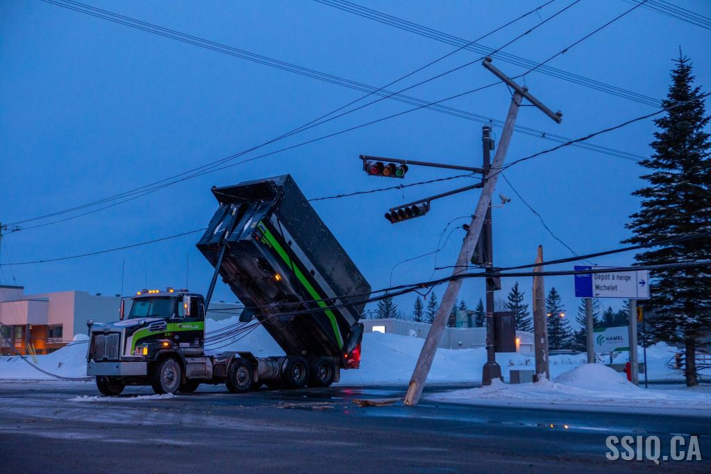 Plusieurs appels ont été logés à la centrale 911 par des témoins. Les détails font mention d'un camion benne coincé dans les fils électriques à la sortie du dépôt à neige.