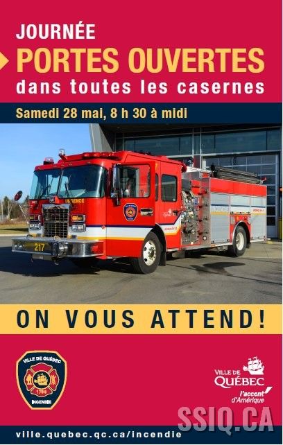 Québec, le 20 mai 2016 – Le Service de protection contre l’incendie de la Ville de Québec (SPCIQ) invite la population à participer à l’activité « portes ouvertes », qui se tiendra dans les 16 casernes situées sur le territoire de l’agglomération de Québec. L’événement se déroulera le samedi 28 mai, de 8 h 30 à 12 h.
