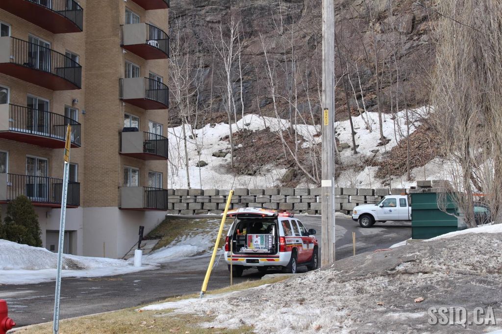 Arrivé sur les lieux, le 209 constate qu'il y a bel et bien eu un éboulement et qu'une résidence en haut de la falaise est à risque.