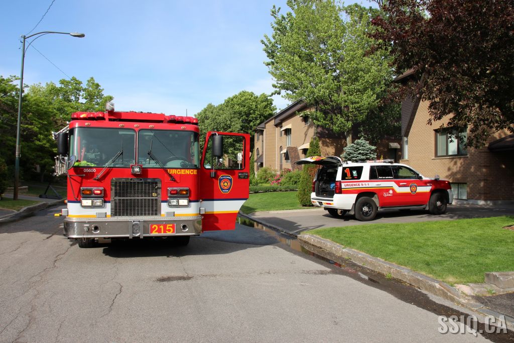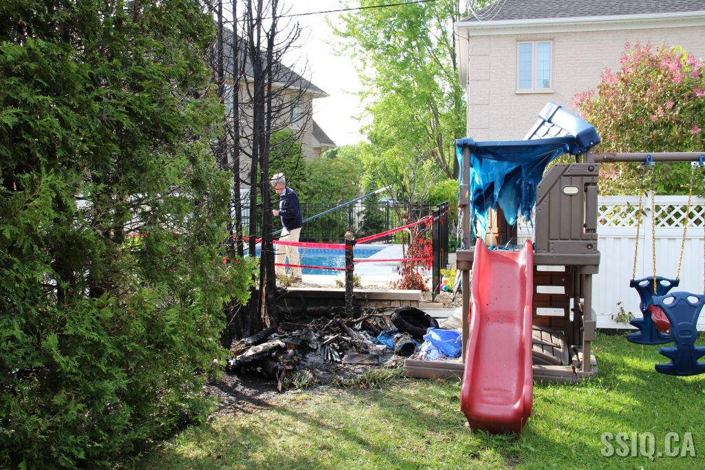 L'appel entre du résident en panique qui mentionne que le feu est pris dans des cèdres à l'arrière de la maison. Il ajoute que le feu se propage à une remise de jardin. Rapidement sur les lieux, l'officier du 215 demande le déploiement d'un jet pour éteindre le feu.