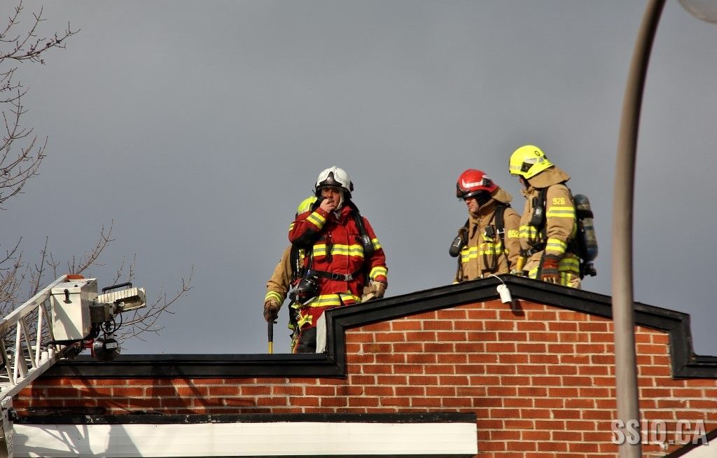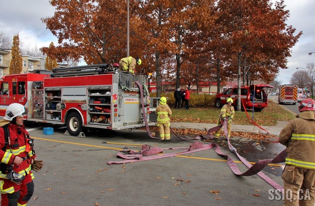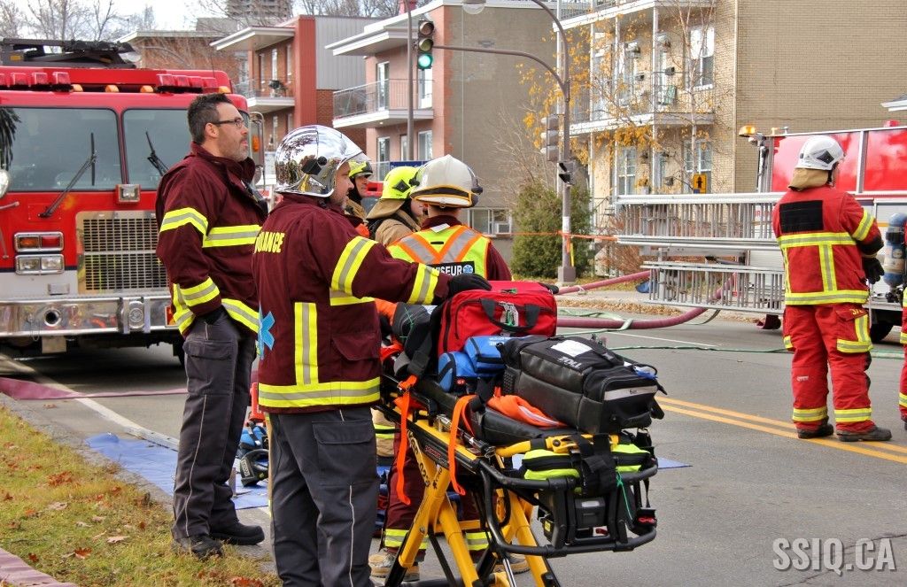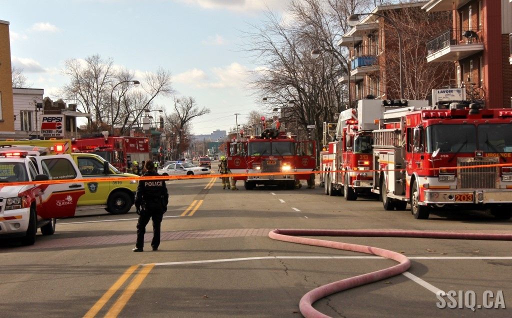 À peine quelques instants après avoir donné la première alarme, la répartitrice de la centrale 911 informe que les ambulanciers sont sur les lieux et qu'ils constatent une épaisse fumée noire et des flammes provenant du sous-sol de l'édifice.